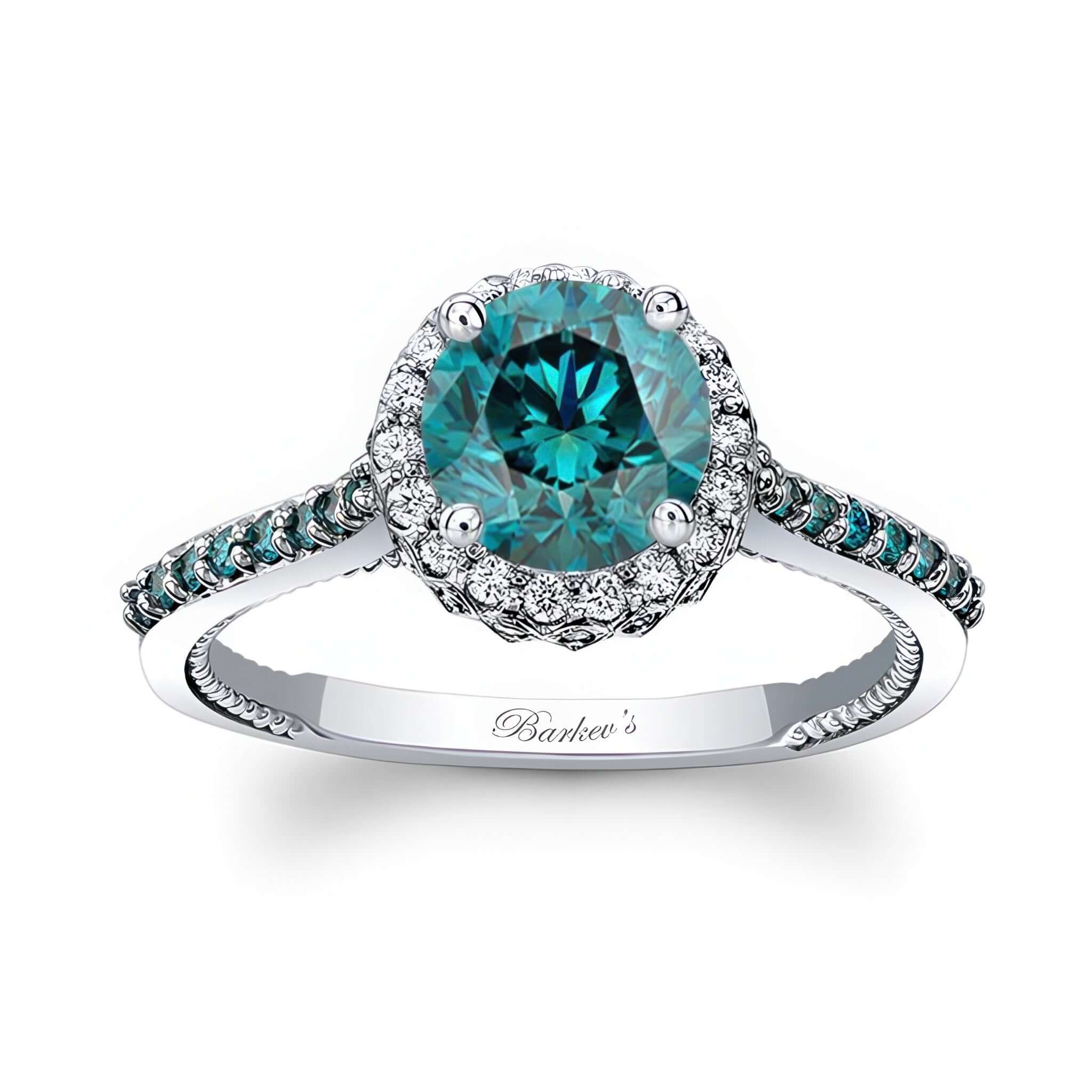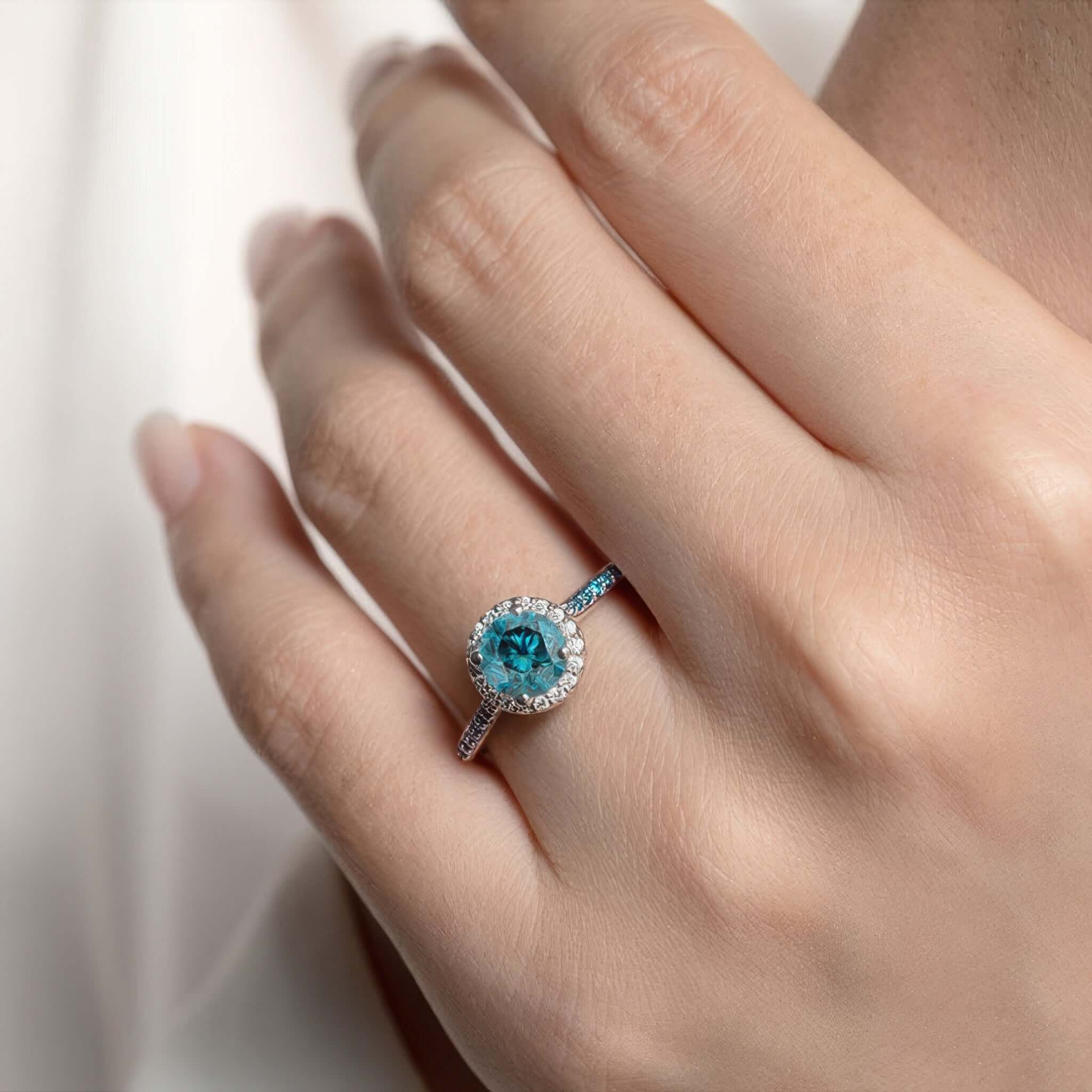 An exquisite round halo blue diamond ring with a center surrounded by shared prong melees that continue down the shoulders. The profile view reveals a second hidden halo around the sides and two larger bezel set blue diamonds sitting just beneath the center.