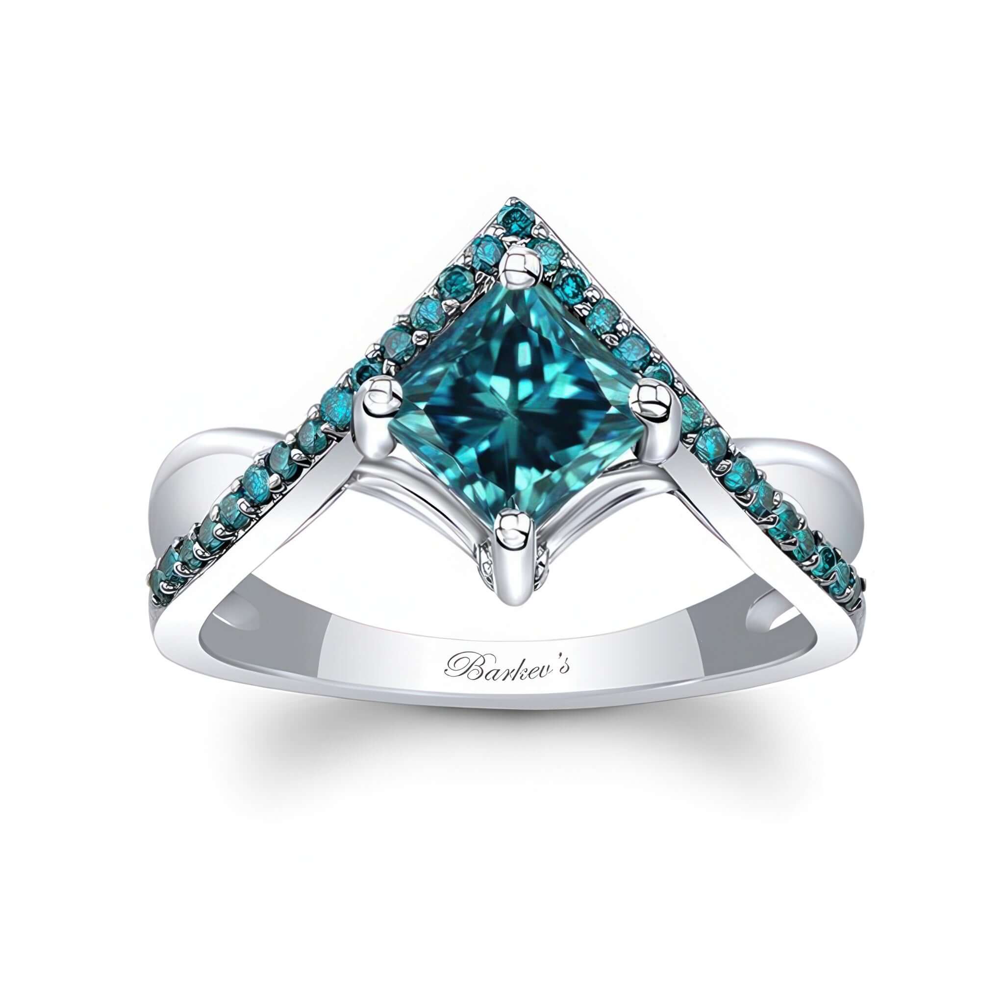 A unique princess cut blue diamond engagement ring featuring a square shaped center, sitting on a curving shank with a row of blue diamonds for added sparkle.