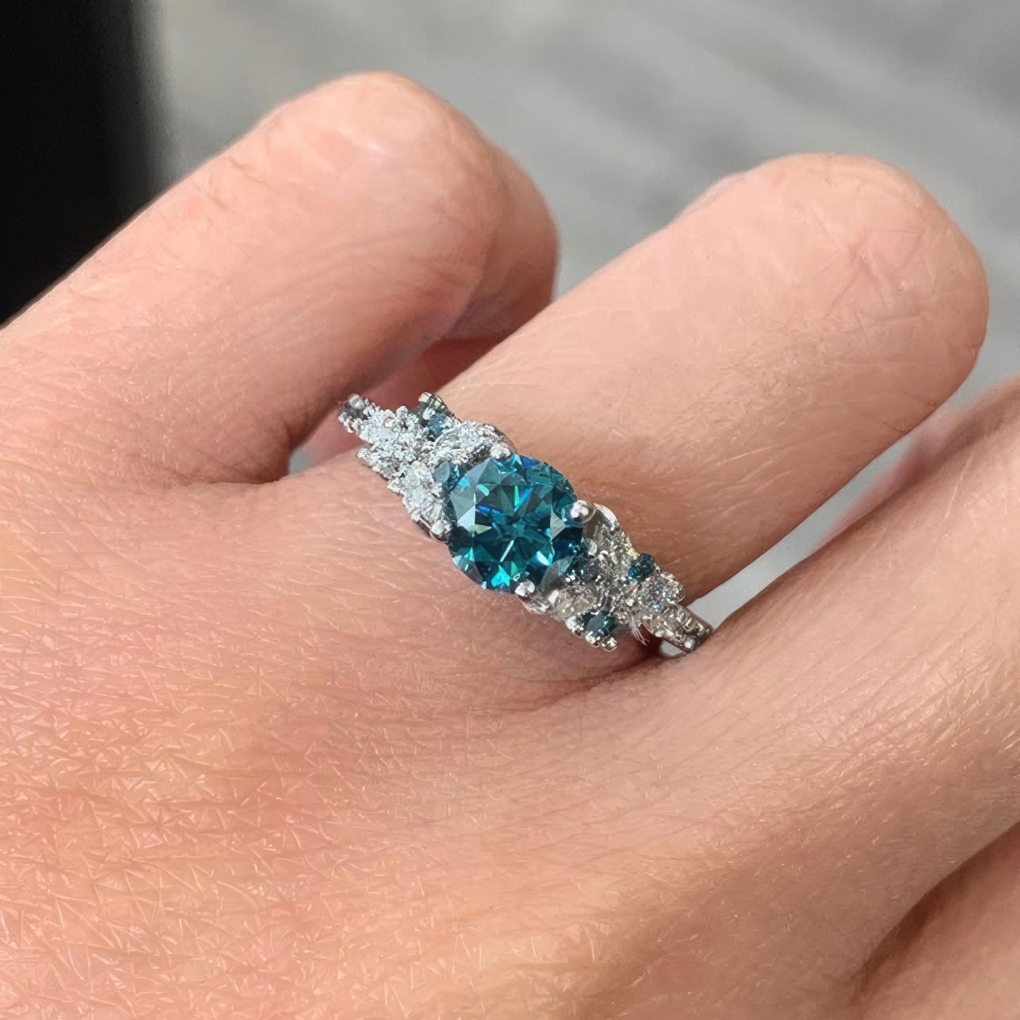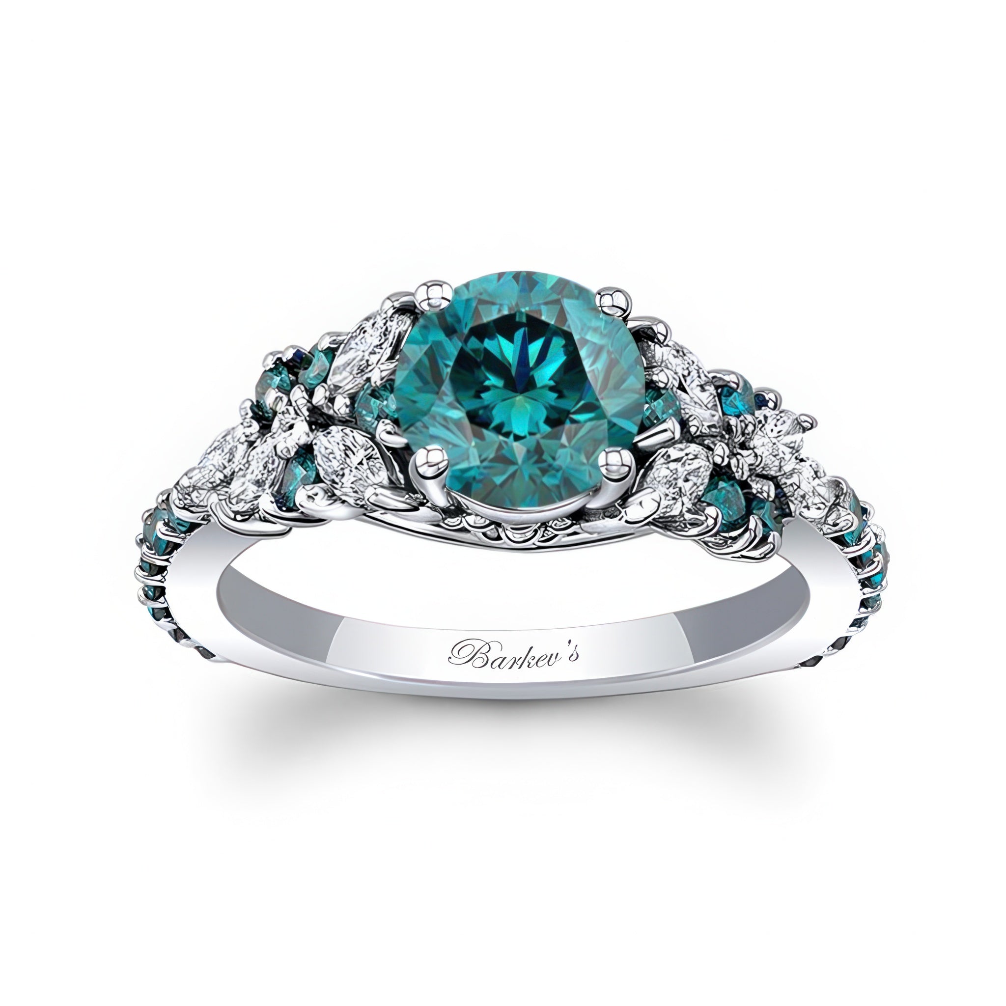 An exquisite vintage marquise blue diamond engagement ring featuring a prong set round center and cathedral shoulders artfully adorned with marquise diamond melees and round blue diamonds.