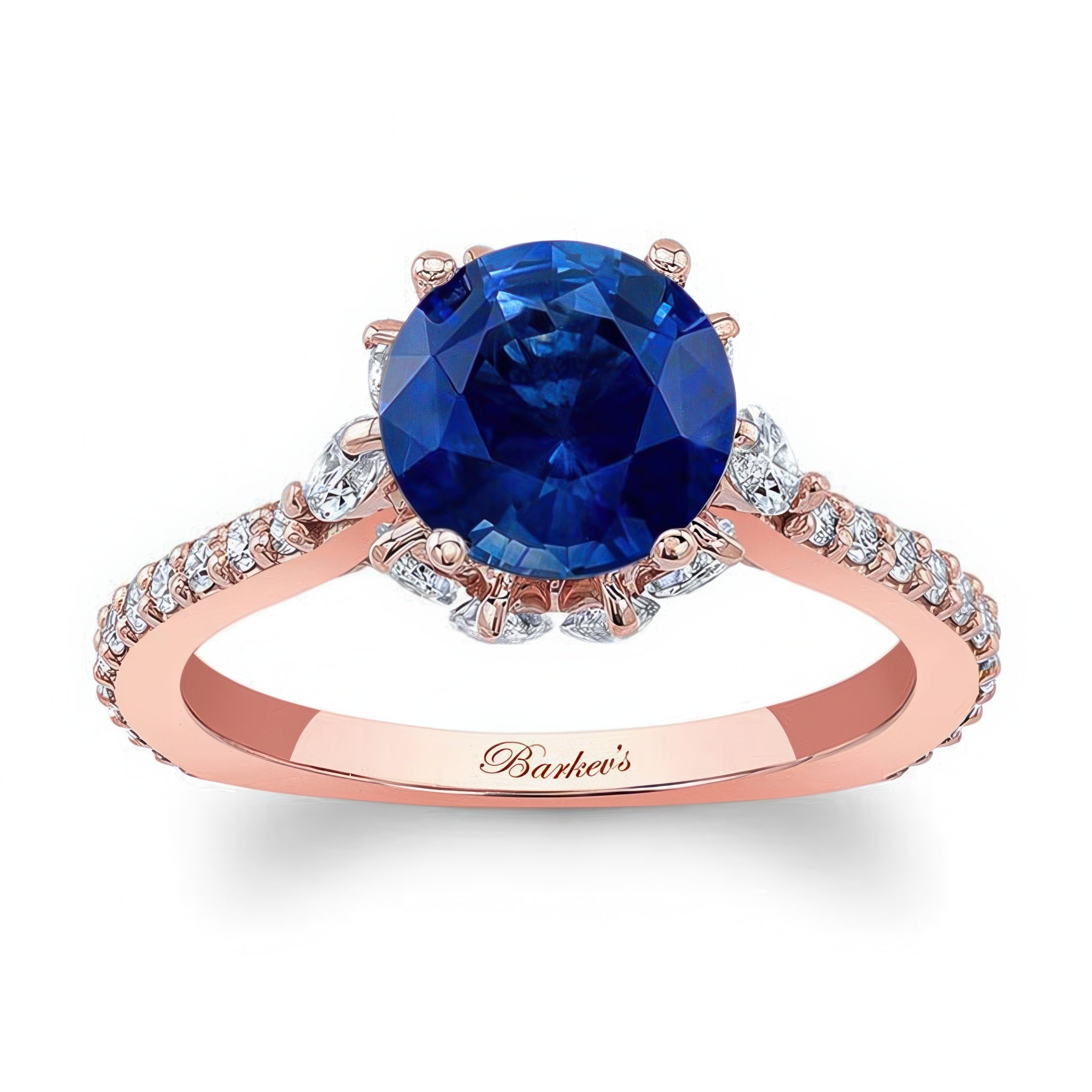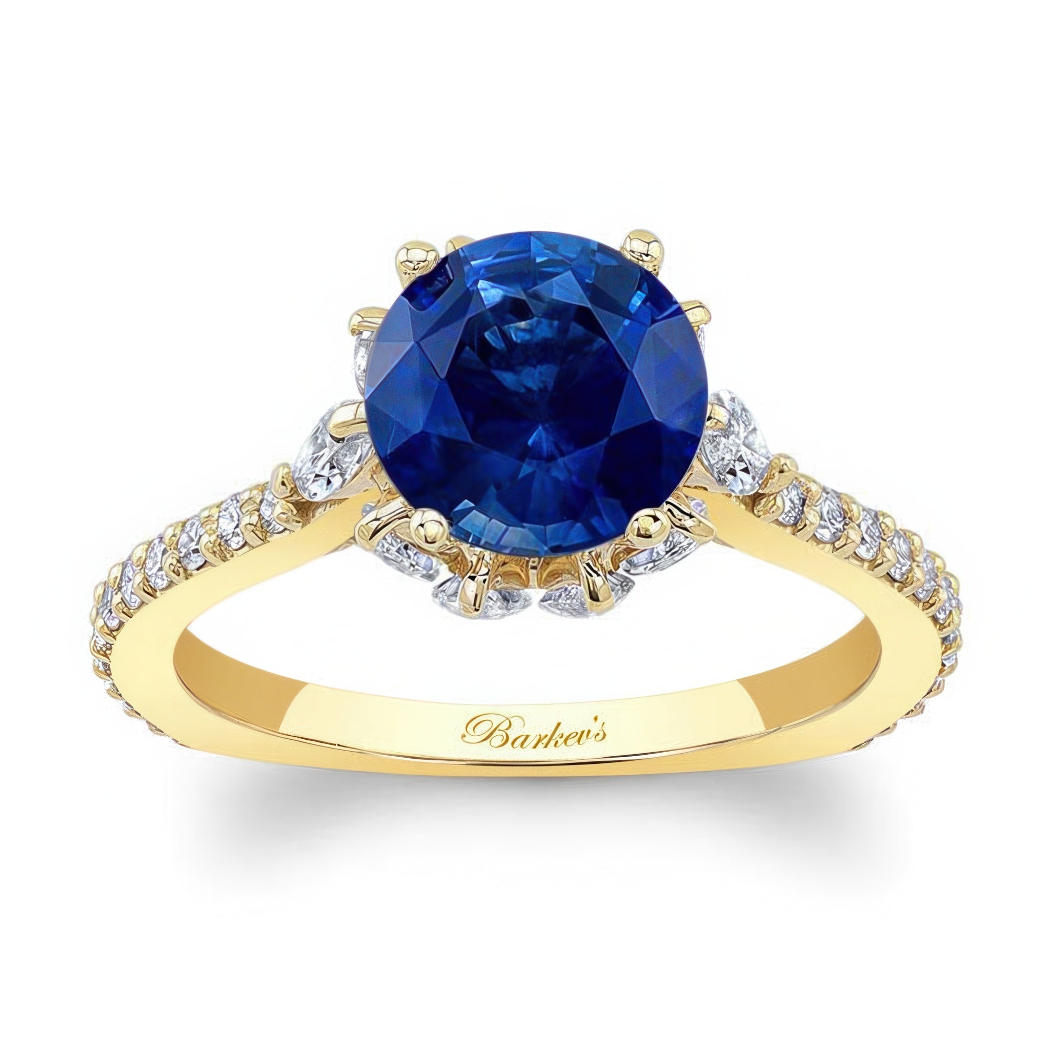 This 2 carat blue sapphire and diamond ring features a prong set round center with marquise diamonds adorning the gallery and shared prong set diamonds on the ridges of the shank for a sophisticated finish.