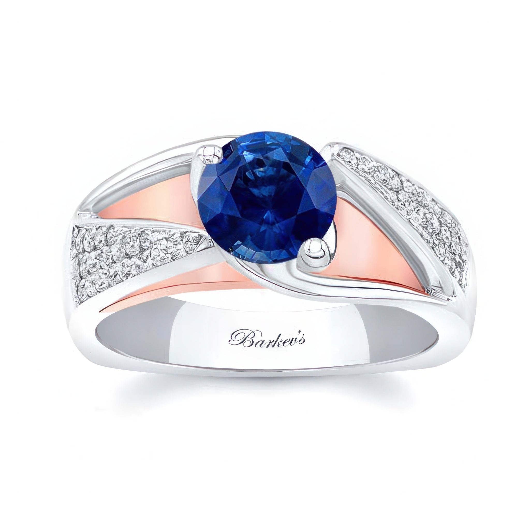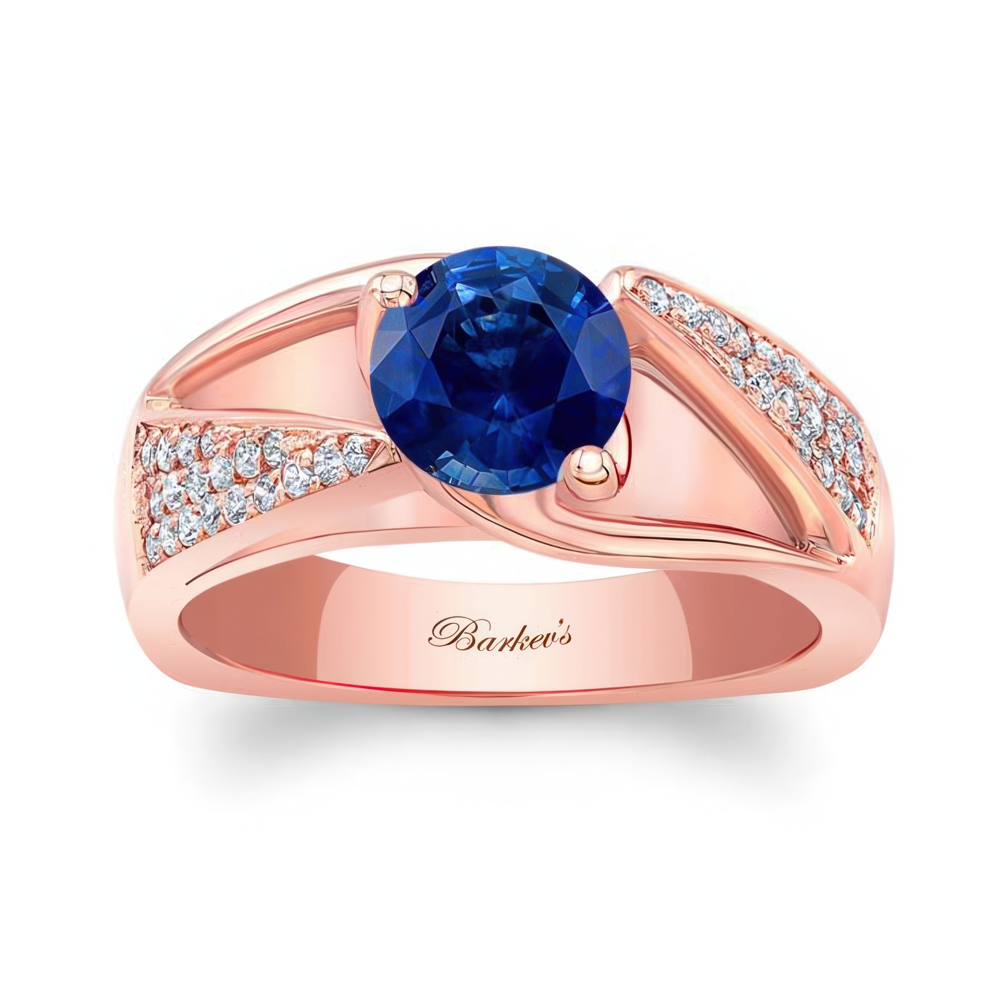 This 3 row blue sapphire and diamond ring is artfully designed with cathedral shoulders that rise up to the prong set center. Three bold rows of pave set diamonds decorate both sides making a statement that will catch the eye of many admirers.