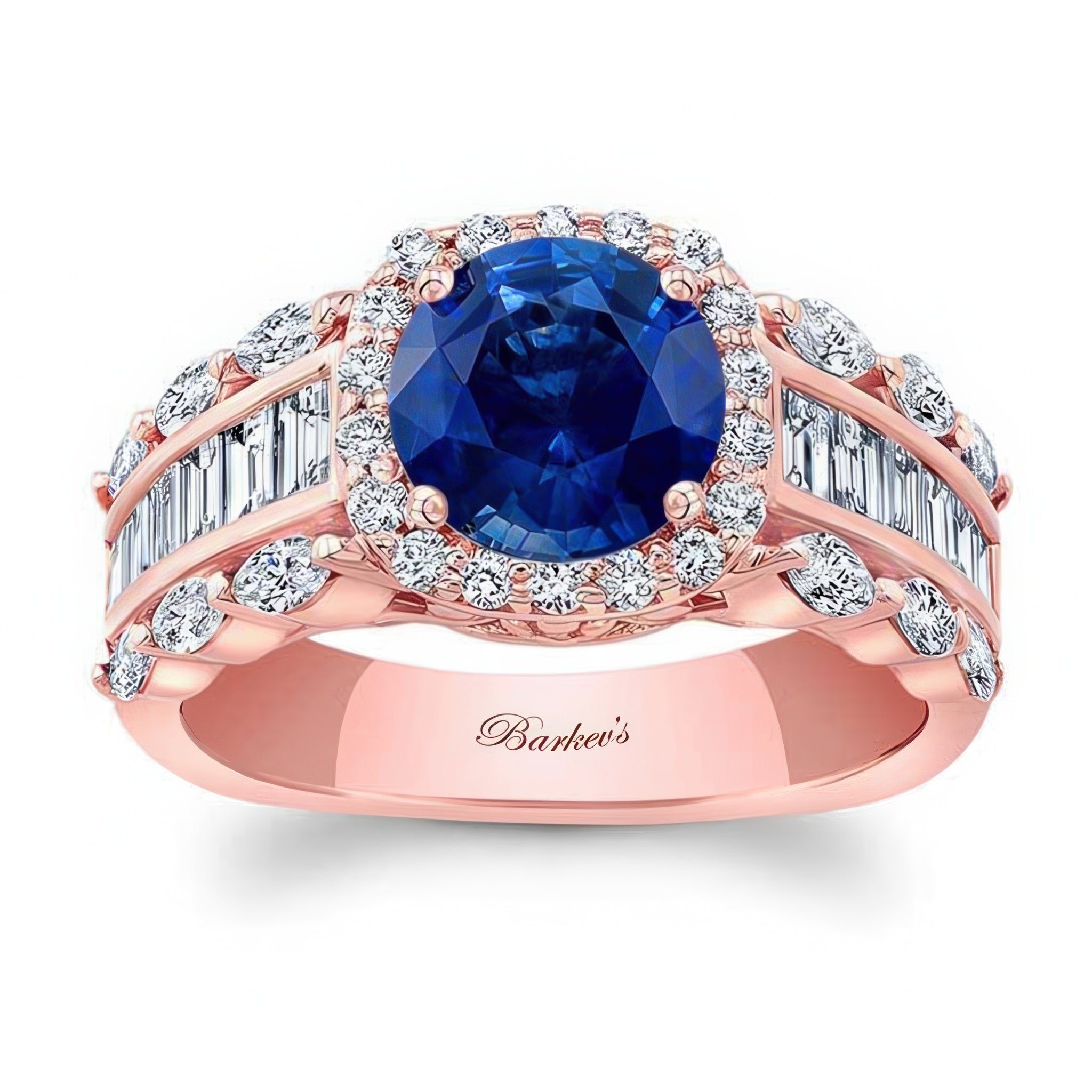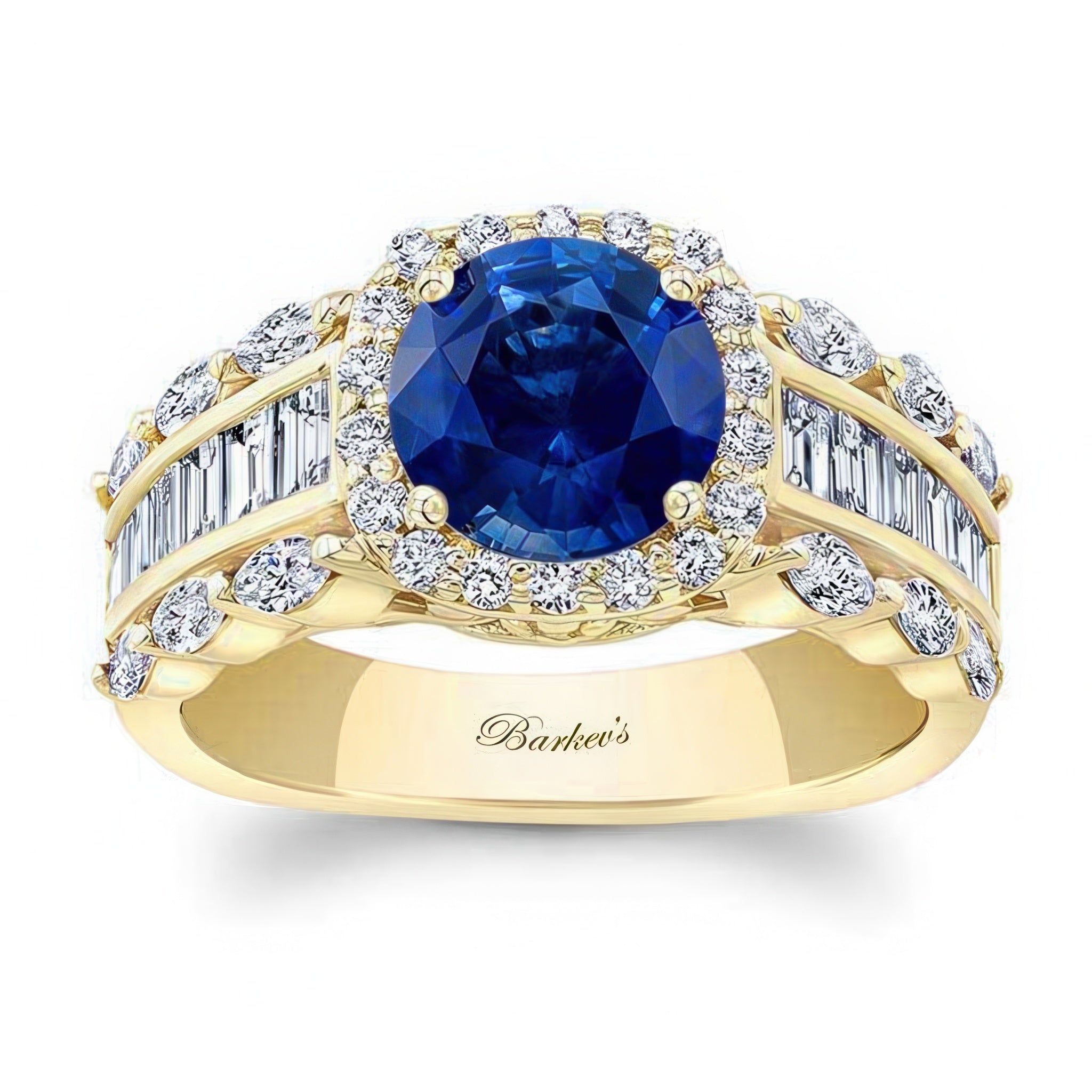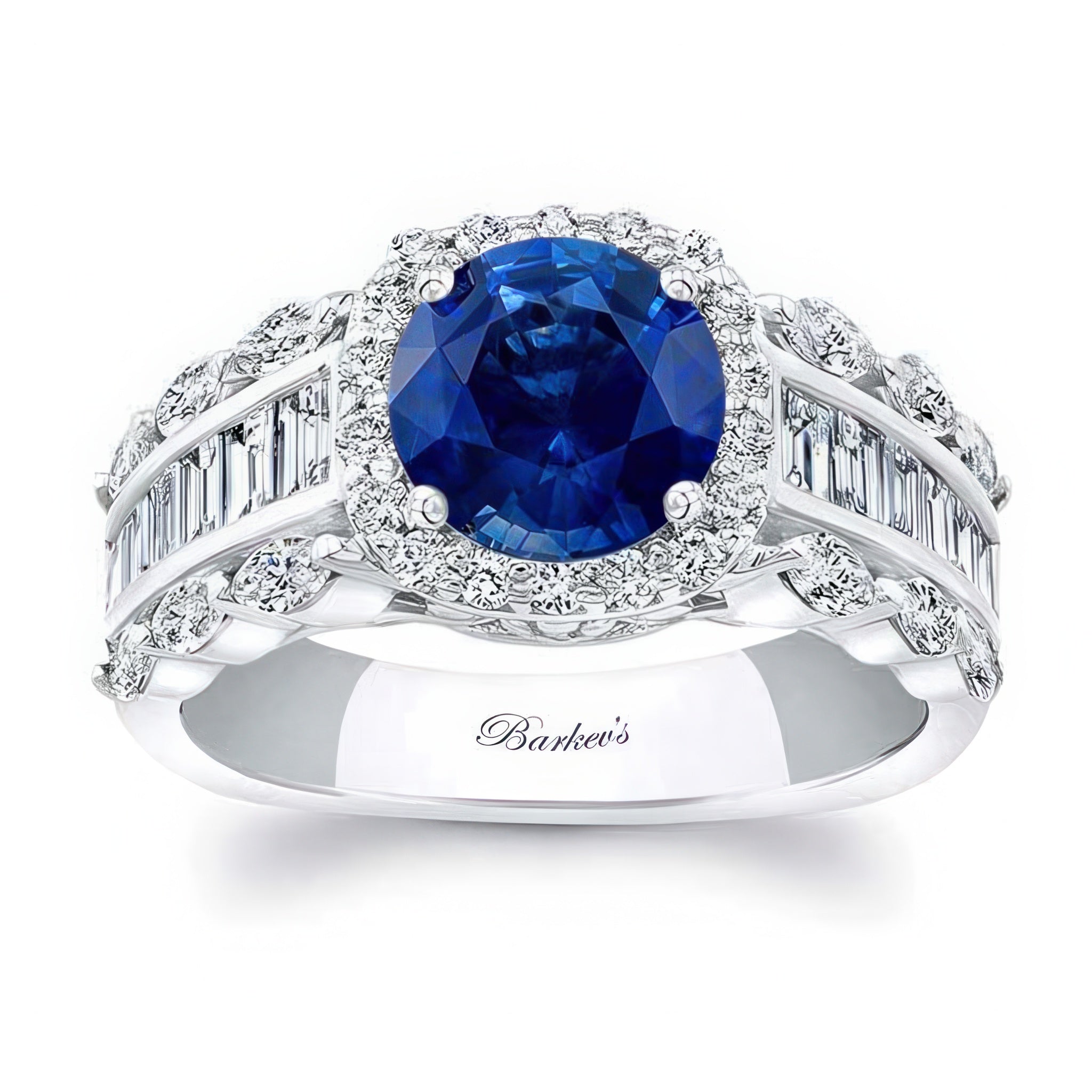 This blue sapphire and diamond baguette ring is both striking and classic featuring a prong set round center with a halo surrounding it and channel set baguettes embedded into the shoulders while shared prong set marquise diamonds frame the sides for a sophisticated look.