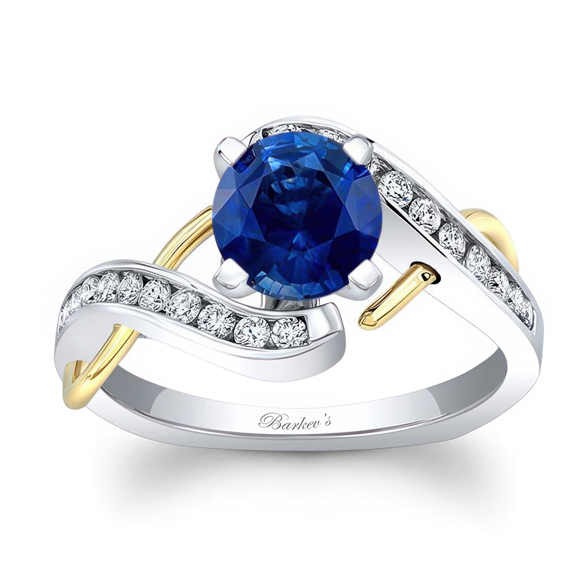 This blue sapphire and diamond channel ring features a prong set round center with a wire trim curving into the shank and channel set diamond melees on the shoulders.