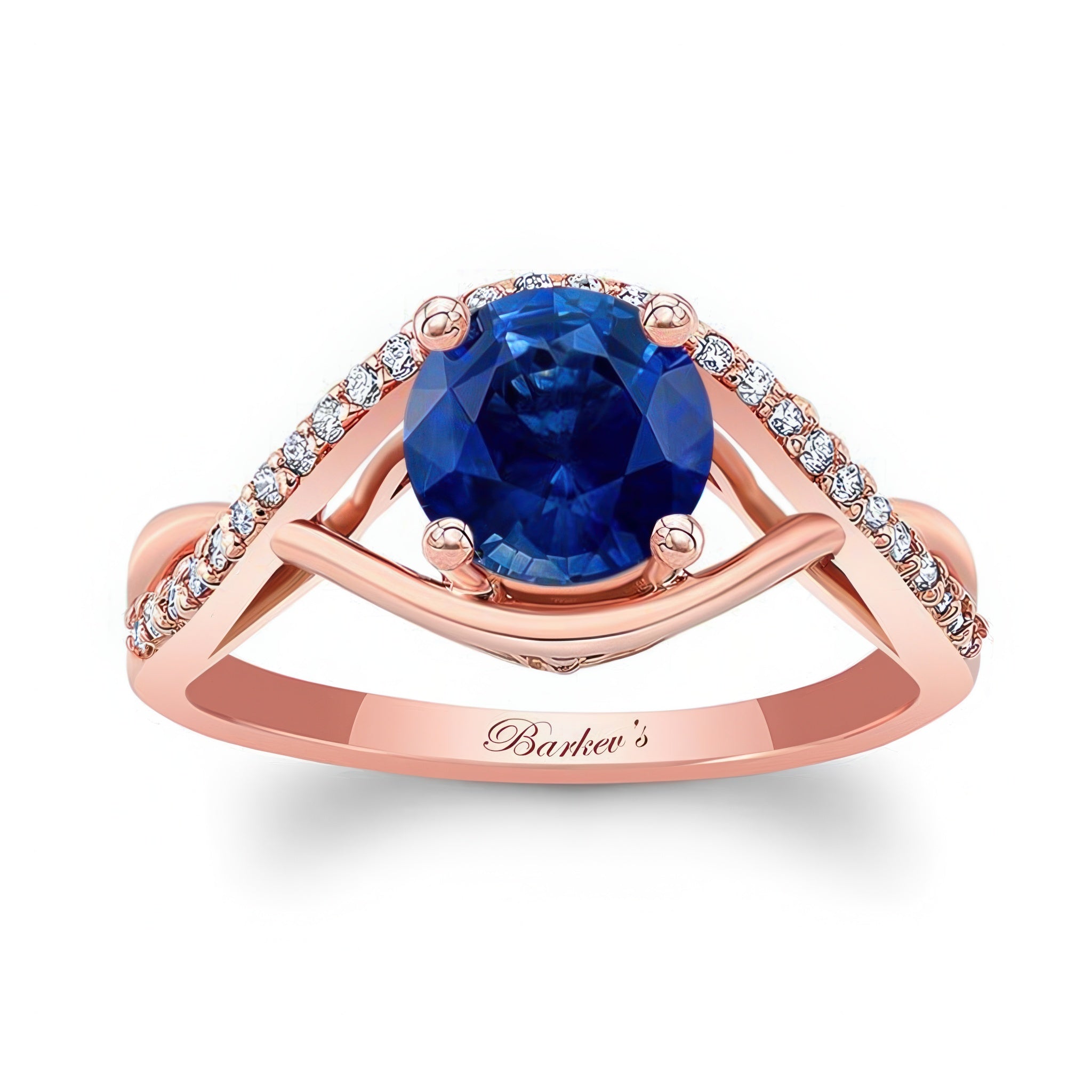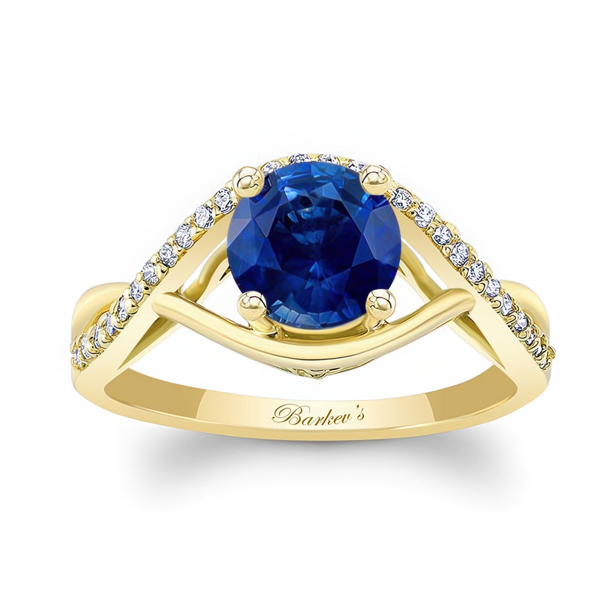 A beautiful blue sapphire and diamond criss cross ring featuring a curving shank, shared prong set diamond melees and a round center stone