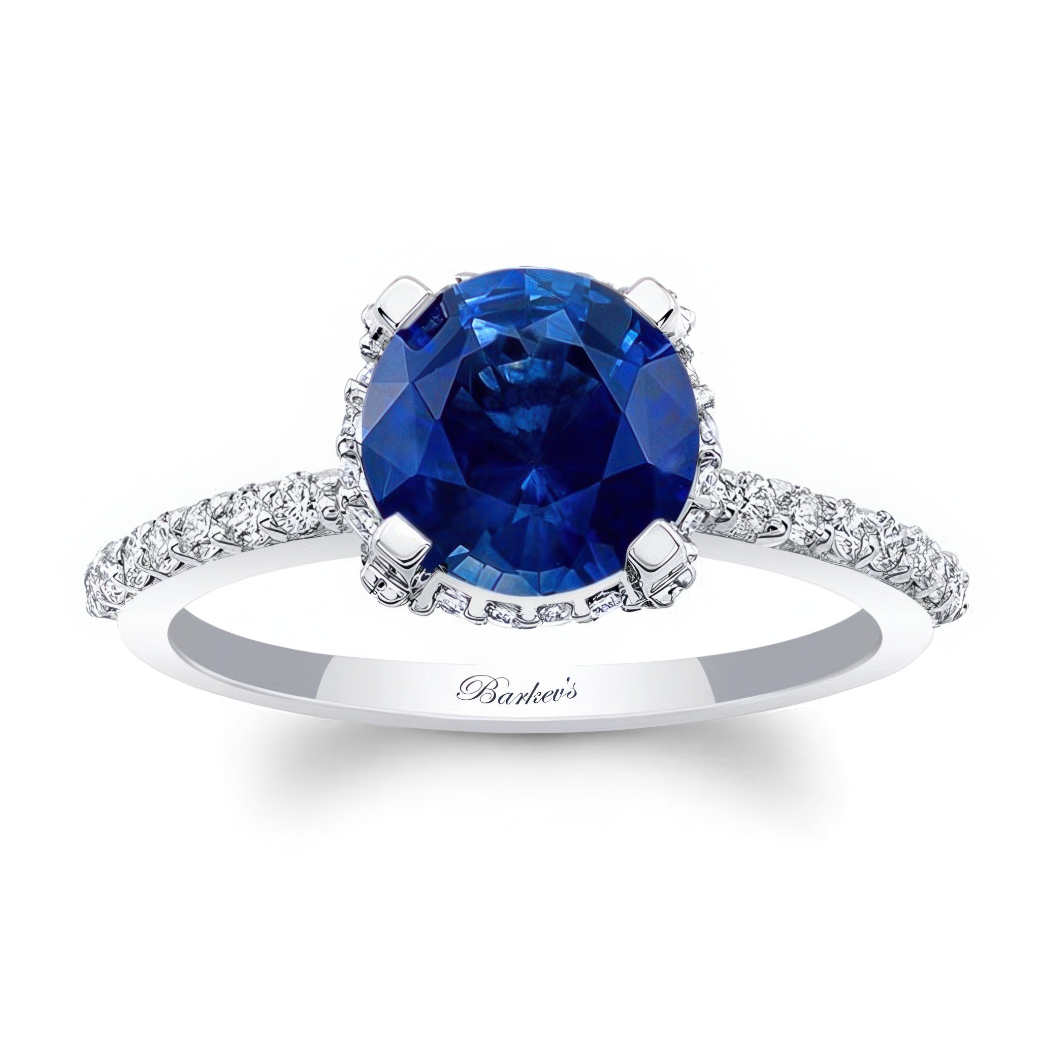 This blue sapphire and diamond hidden halo ring features a prong set round center surrounded by shared prong set diamonds just underneath as they cascade and flow down the shank for a look that shimmers from every angle.