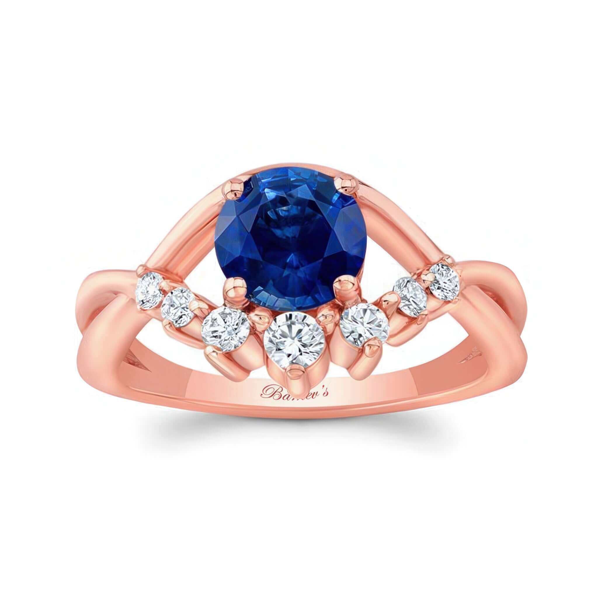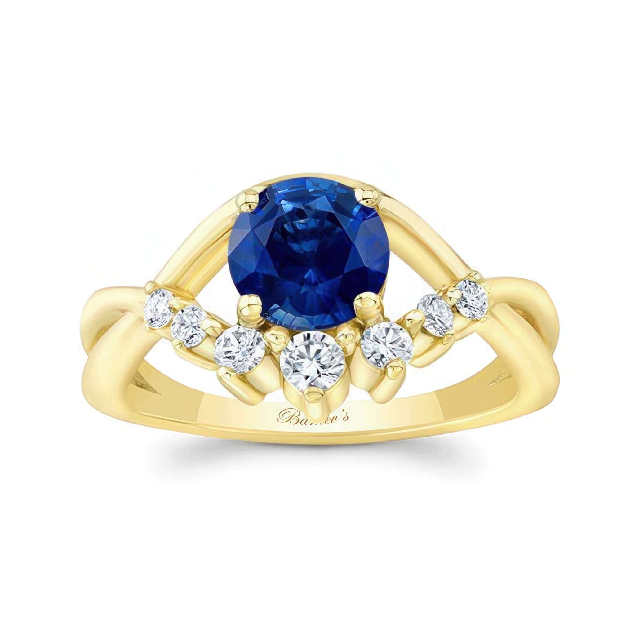 This blue sapphire and diamond unique engagement ring grabs attention with a flare swirling on one side adorned with shared prong set diamonds and a round center stone.