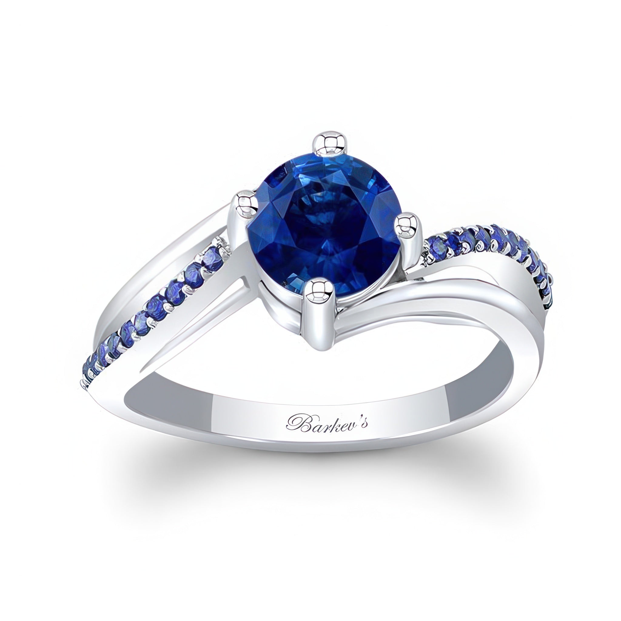 A blue sapphire split shank engagement ring featuring a round center nestled between separated swirls adorned with blue sapphires for an extra touch of brilliance.