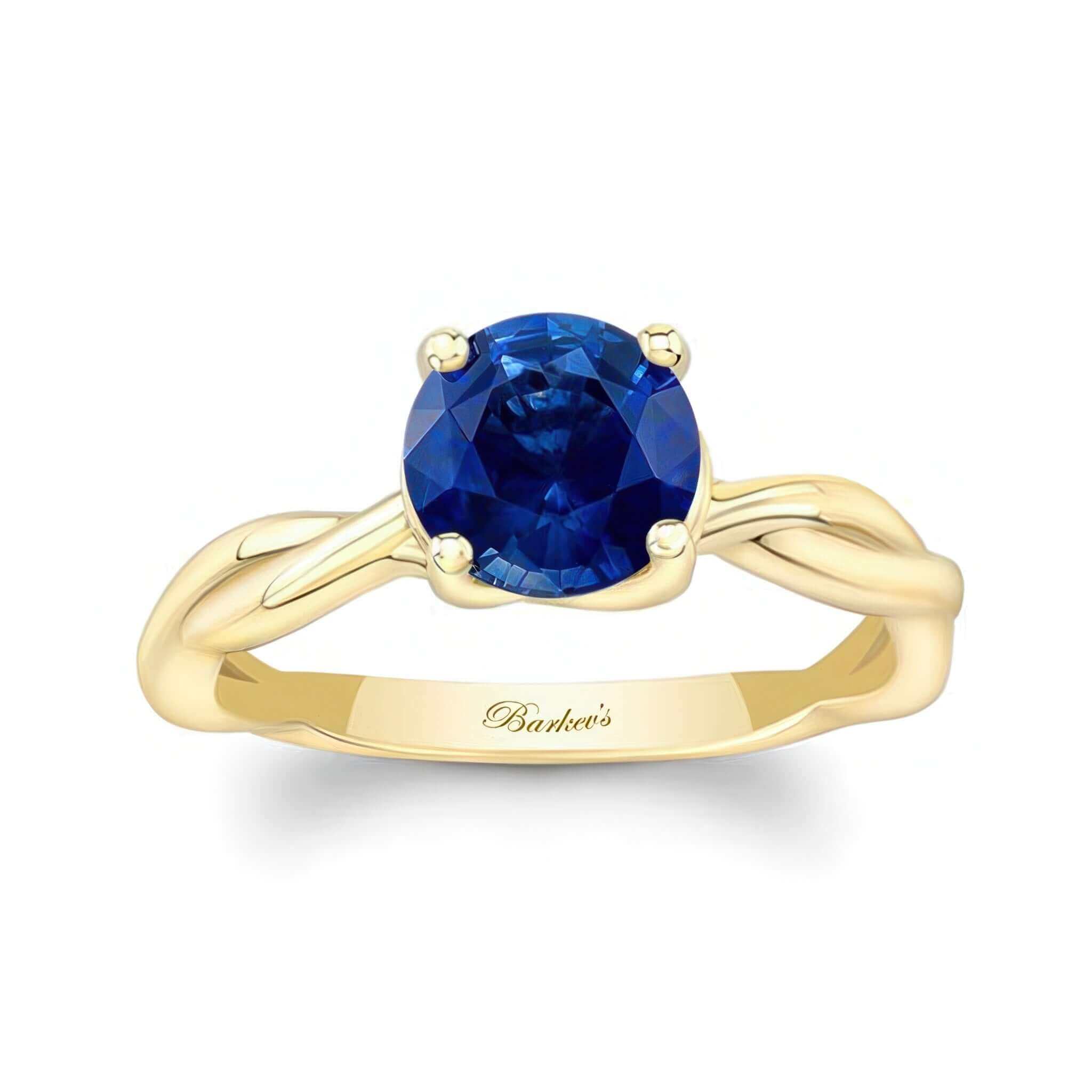 A beautiful blue sapphire twist solitaire engagement ring featuring a unique curving and twisting shank with a prong set round center.
