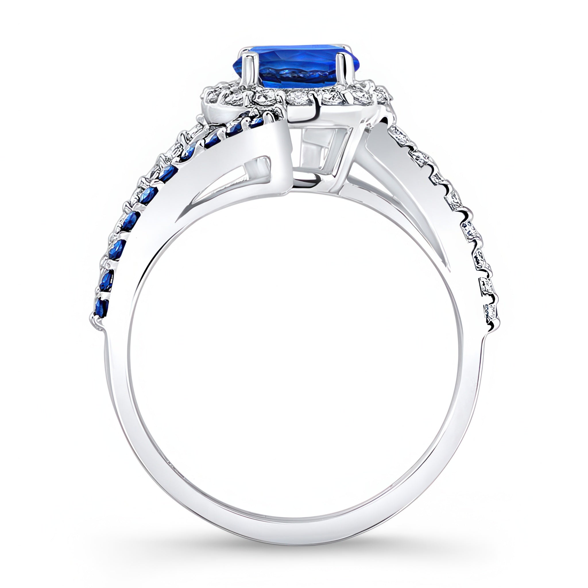 This contemporary blue sapphire engagement ring features a prong set round center encircled with a diamond halo and a split shank adorned with shared prong set blue sapphires and diamonds for an added touch of elegance.