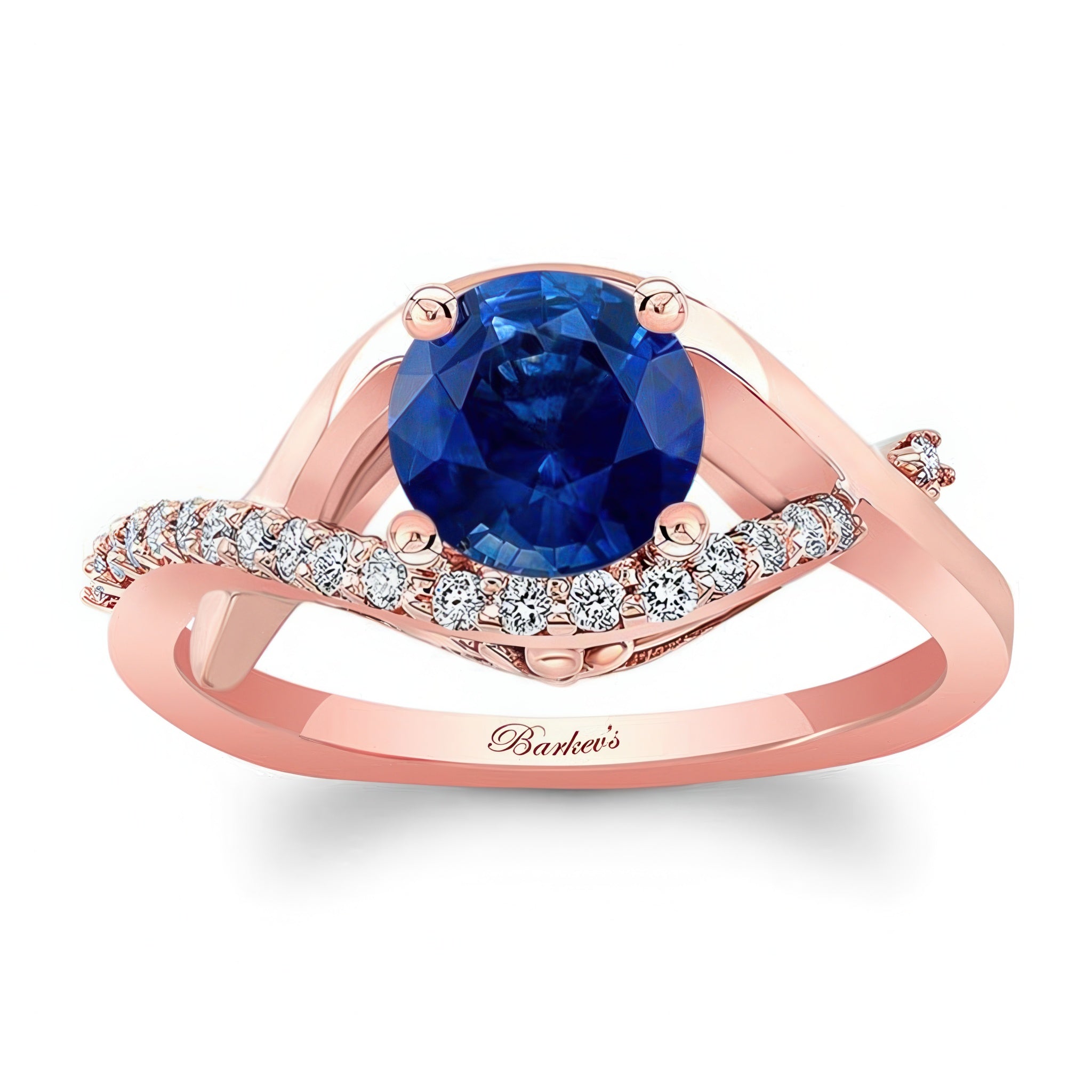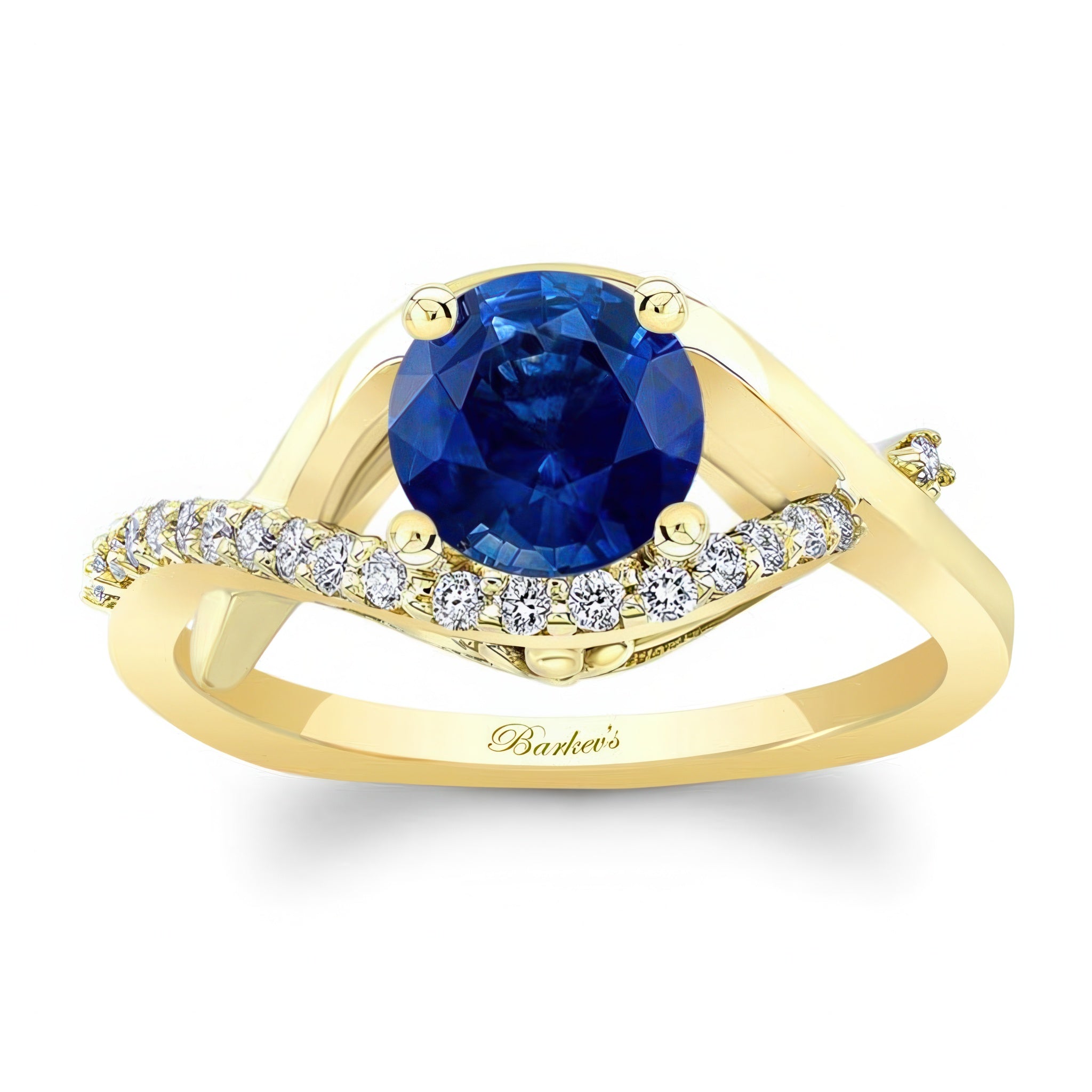 This criss cross blue sapphire and diamond engagement ring features a prong set round center that stands gracefully in the middle of the curving open frame with one of the curves adorned with shared prong set diamonds for a dazzling work of art.