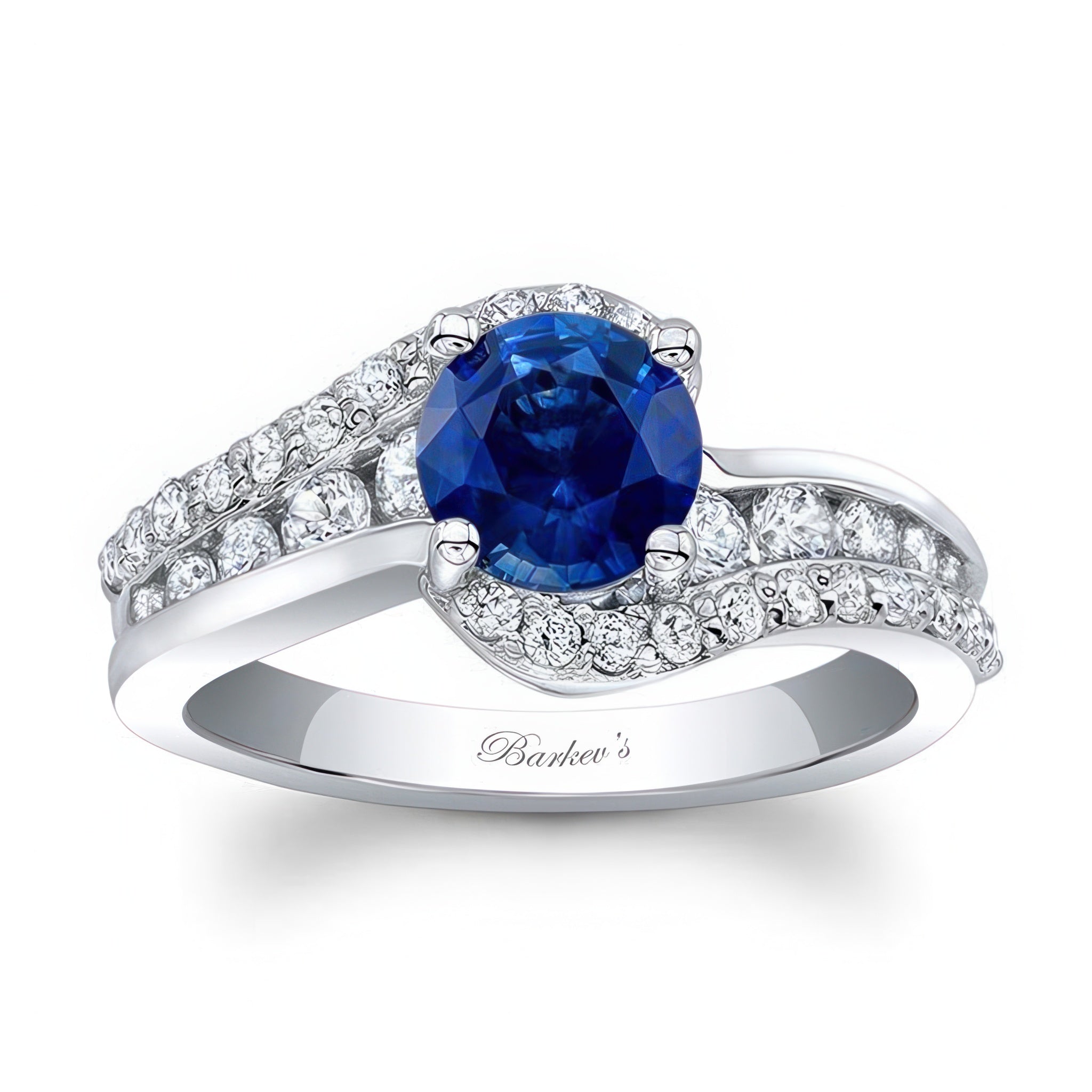 This dazzling curved blue sapphire and diamond engagement ring features a prong set round center with shoulders splitting and twisting with pave set diamonds, while channel set diamonds fill the gap for a dramatic touch of bling.