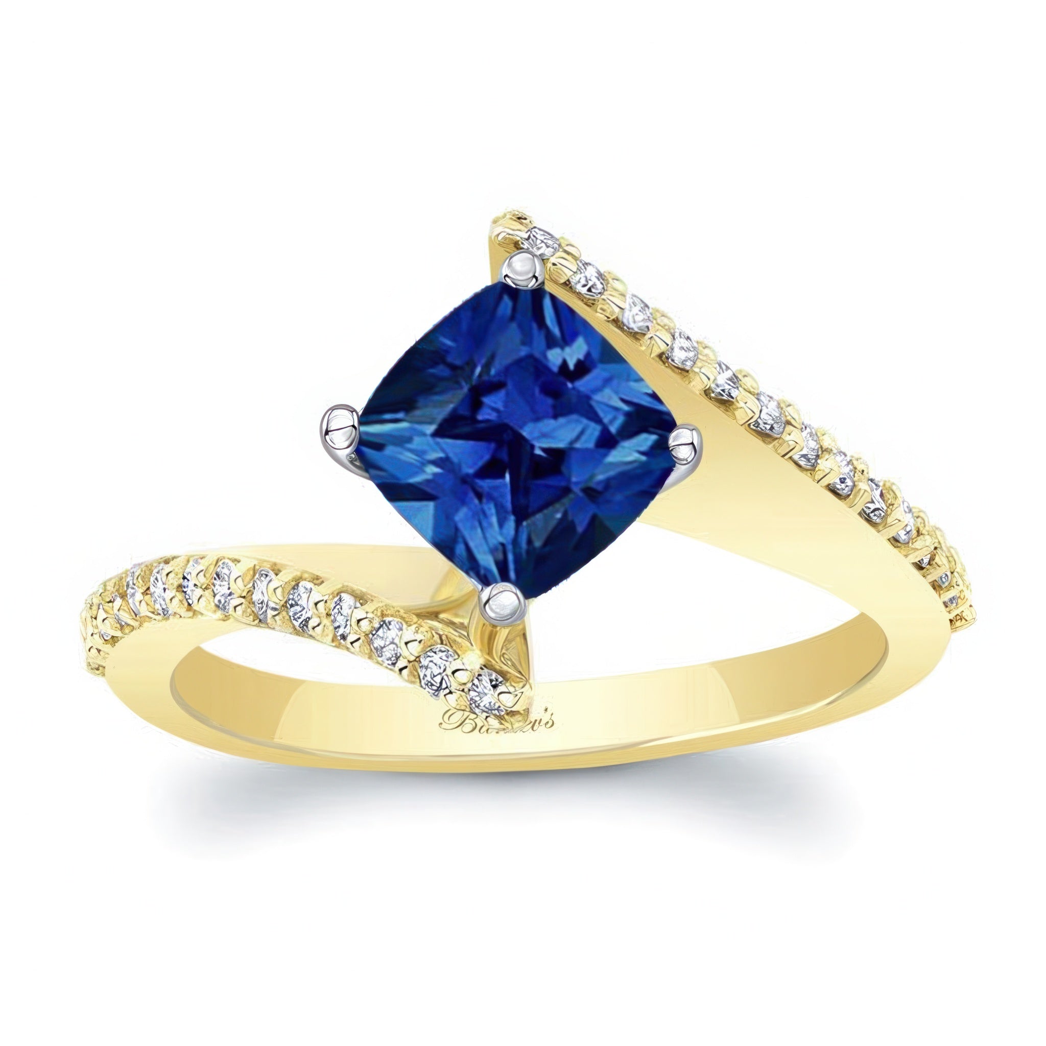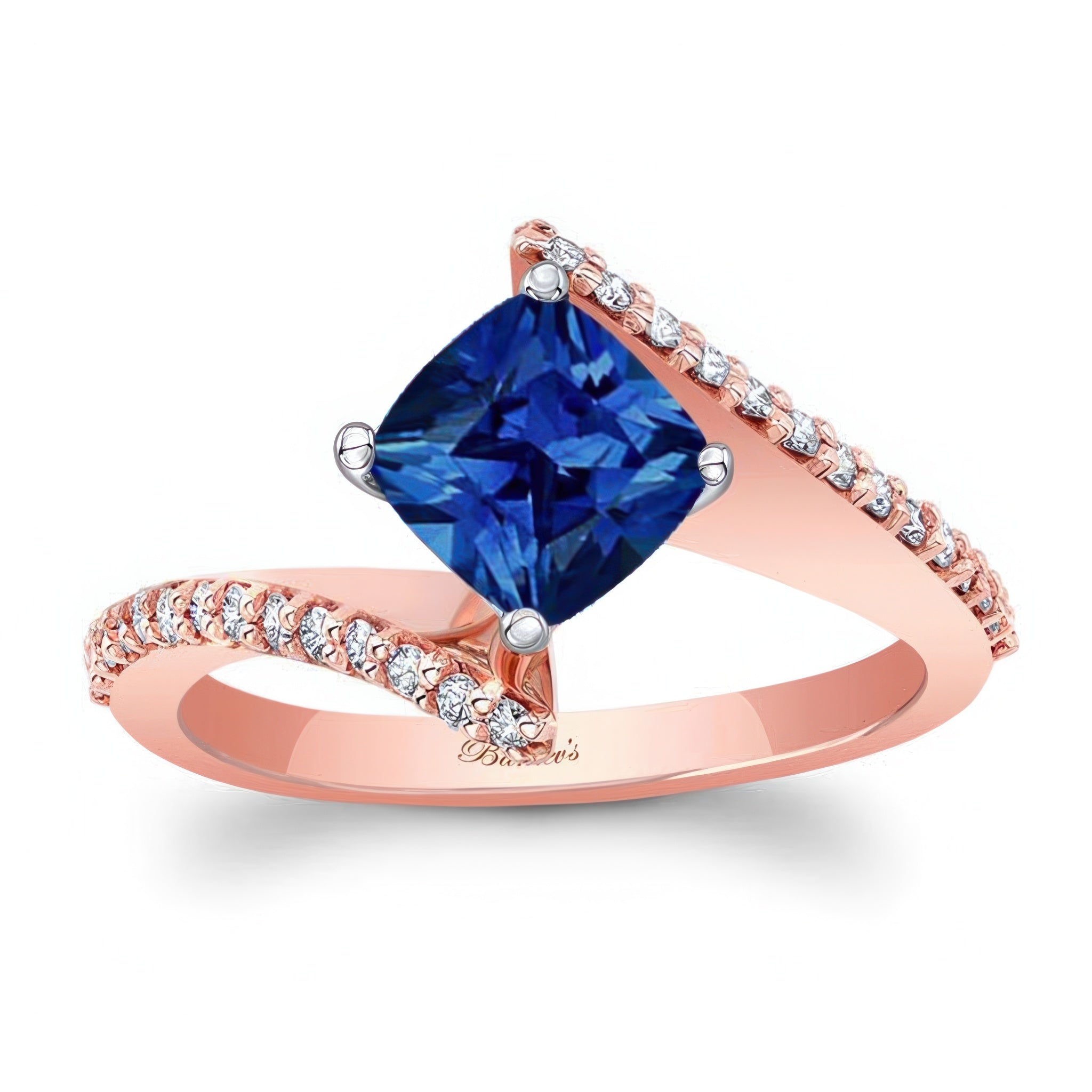 A dazzling cushion cut blue sapphire bypass ring featuring a prong set center with sharing prong set diamonds gracing the ridges for a dramatic look sure to catch the eye of many admirers.