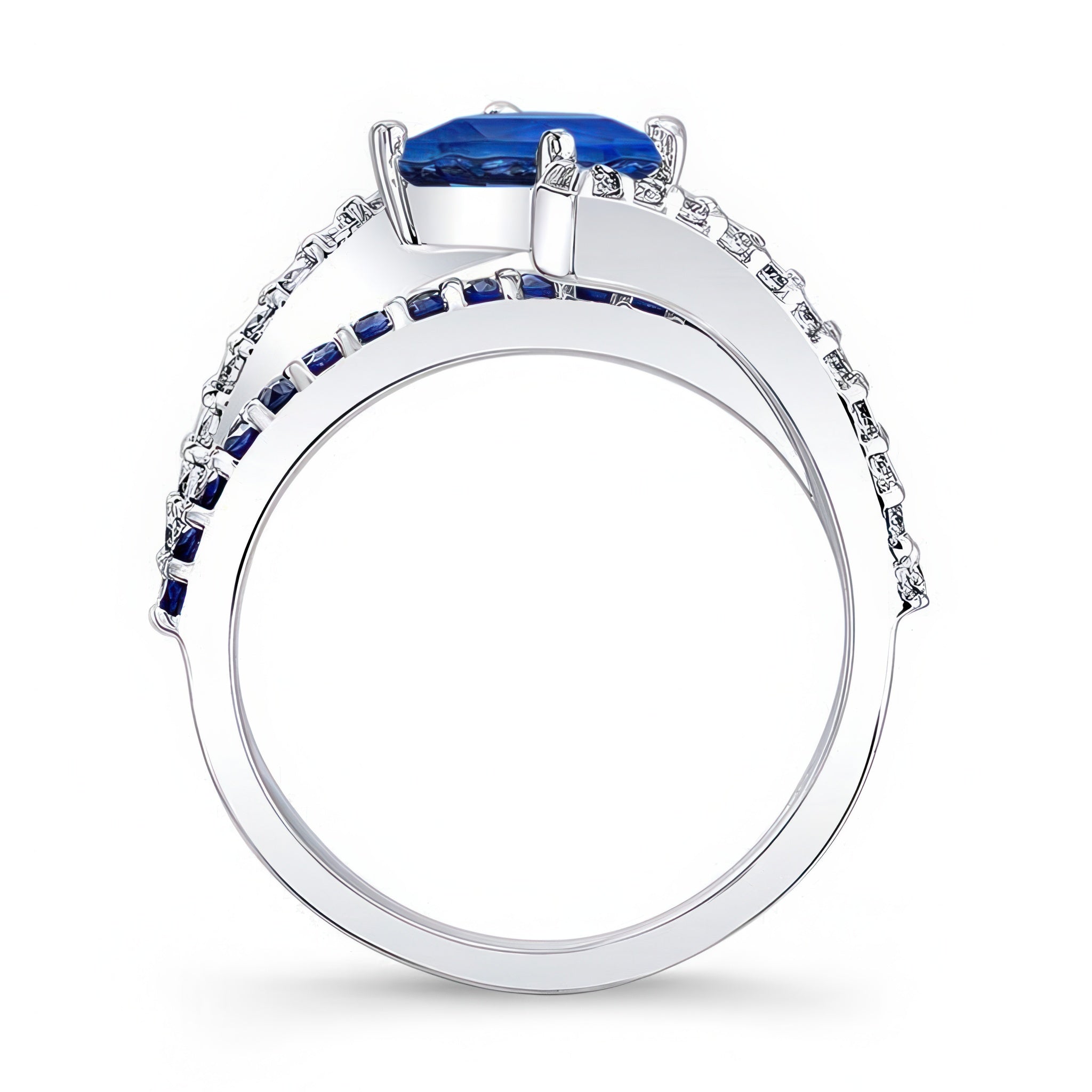 This classic kite set blue sapphire engagement ring features a prong set cushion cut center while the ridges of the split shank and bridge are all adorned with shared prong set diamonds and blue sapphires for an added touch of elegance.
