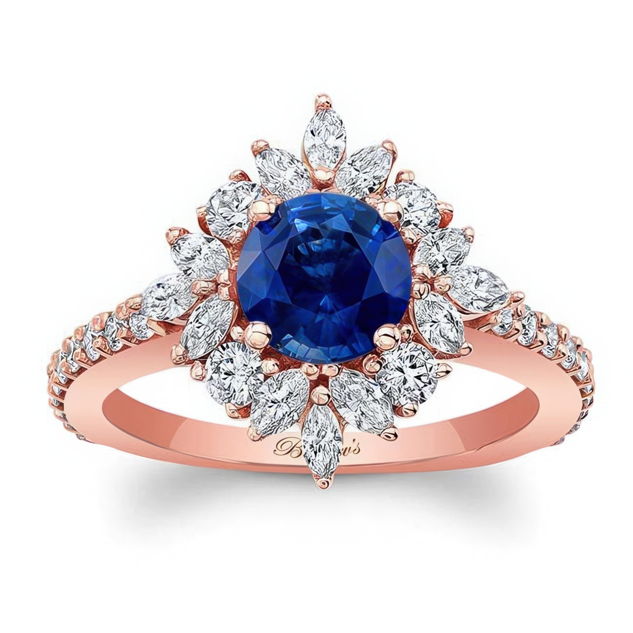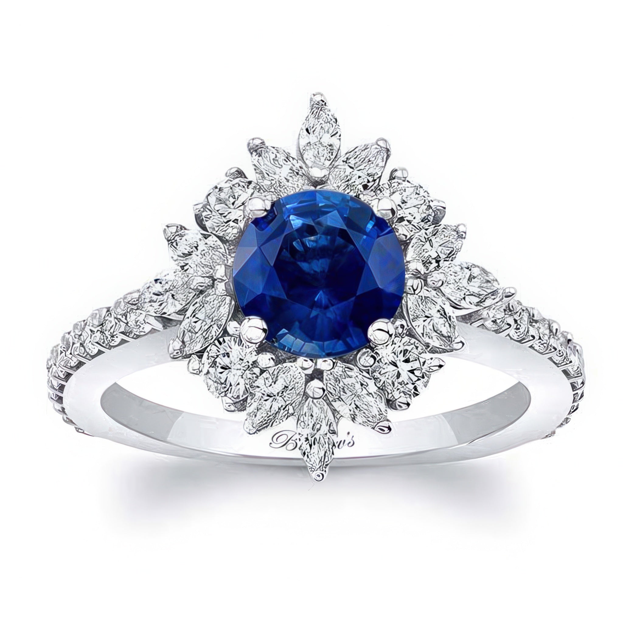 This marquise halo blue sapphire and diamond engagement ring features a prong set round center artfully encircled with marquise and round melees, while shared prong set diamonds grace the shoulders for a timeless look.