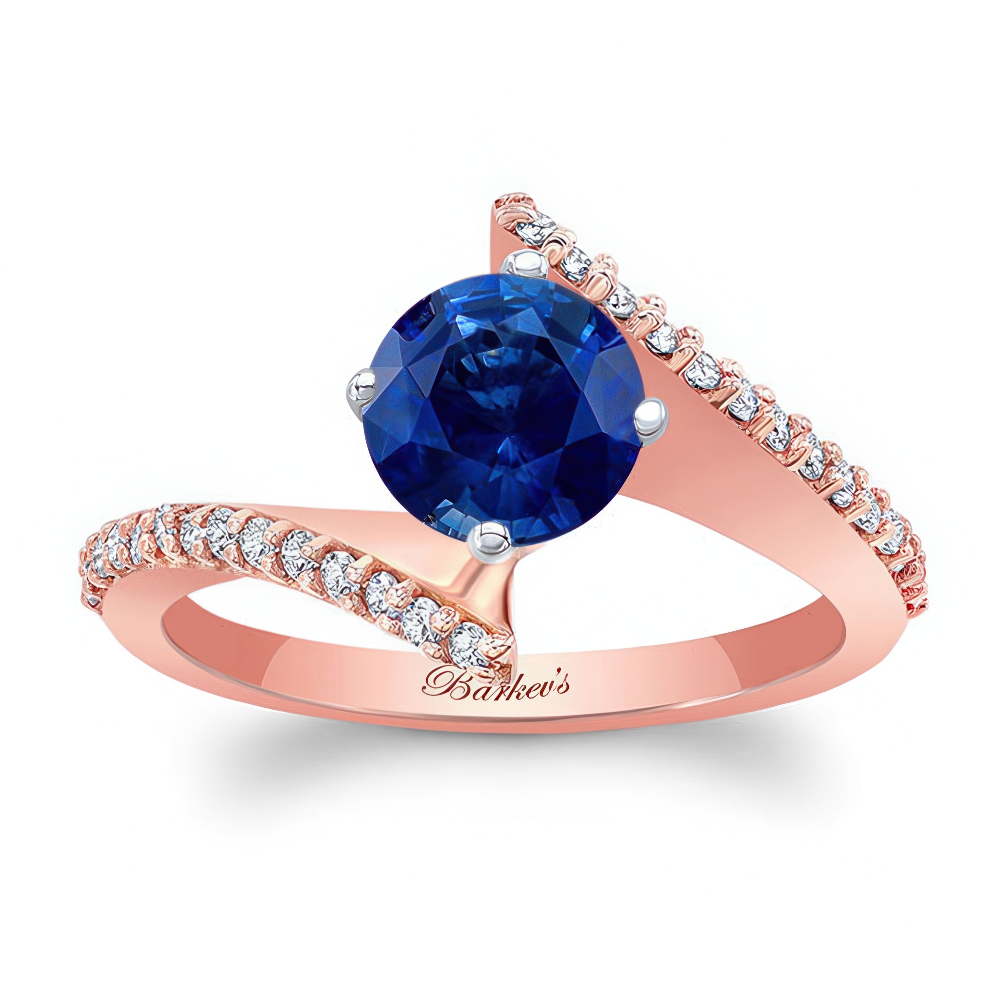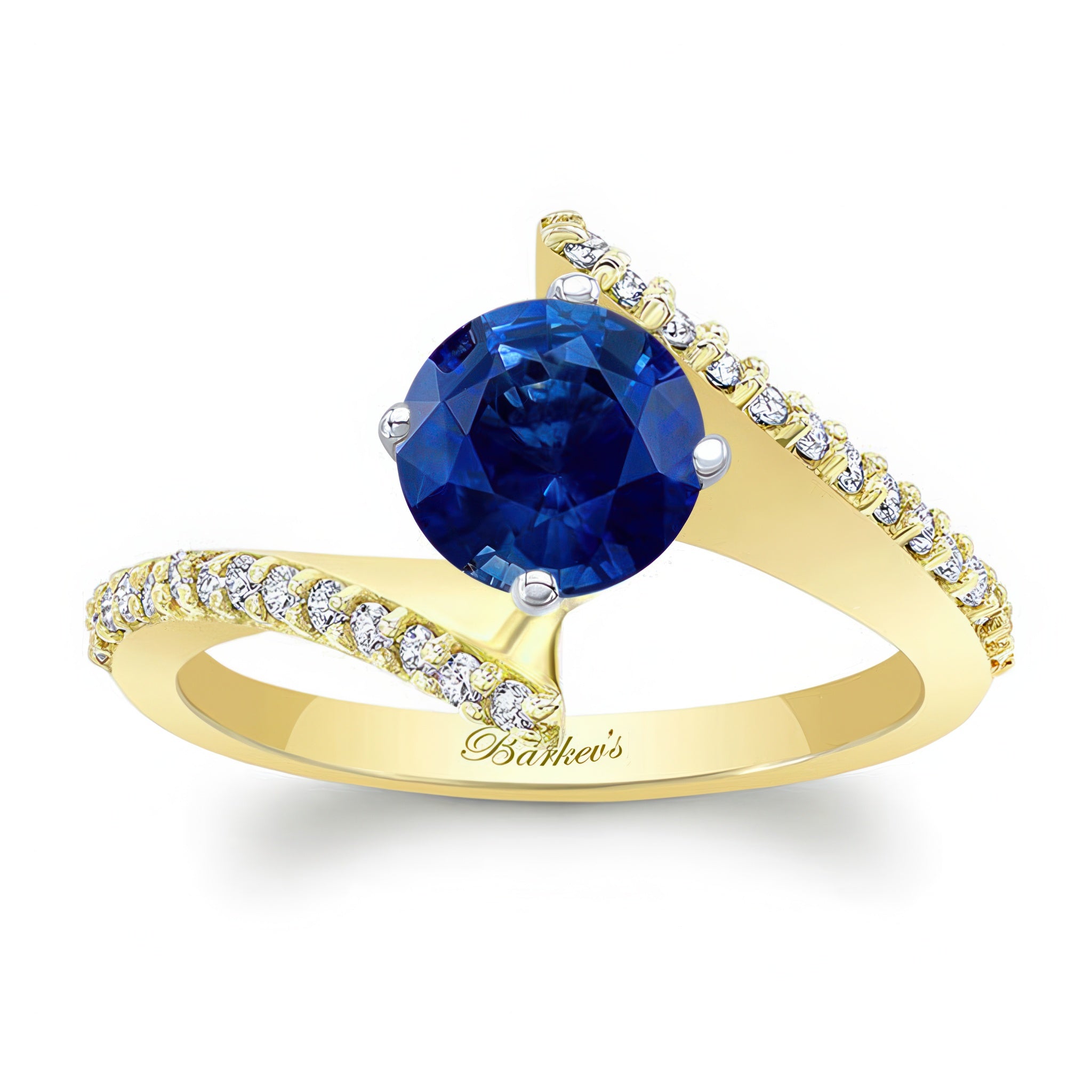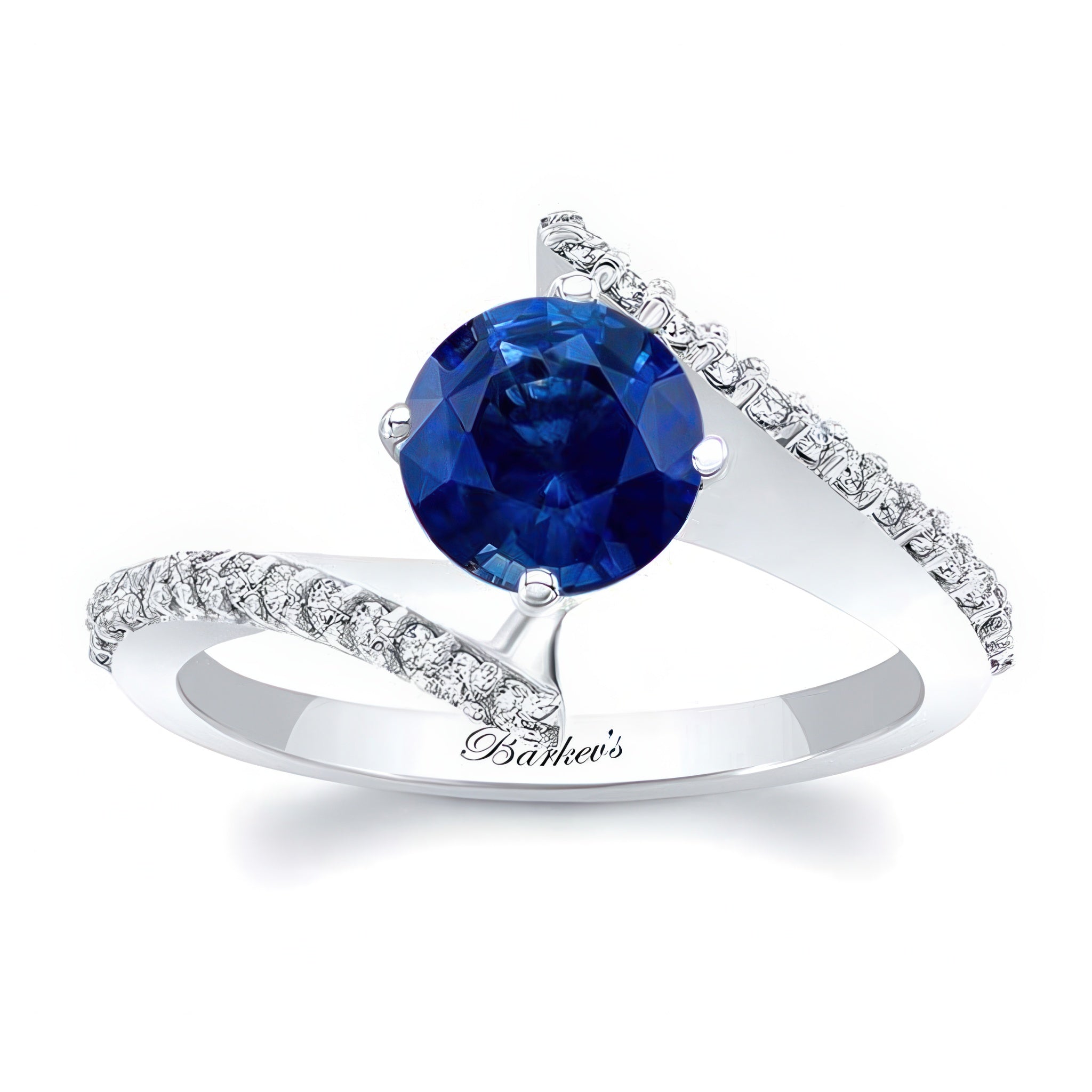 A stunning modern bypass blue sapphire and diamond engagement ring featuring a prong set round center with sharing prong set diamonds gracing the ridges for a dramatic look sure to catch the eye of many admirers.