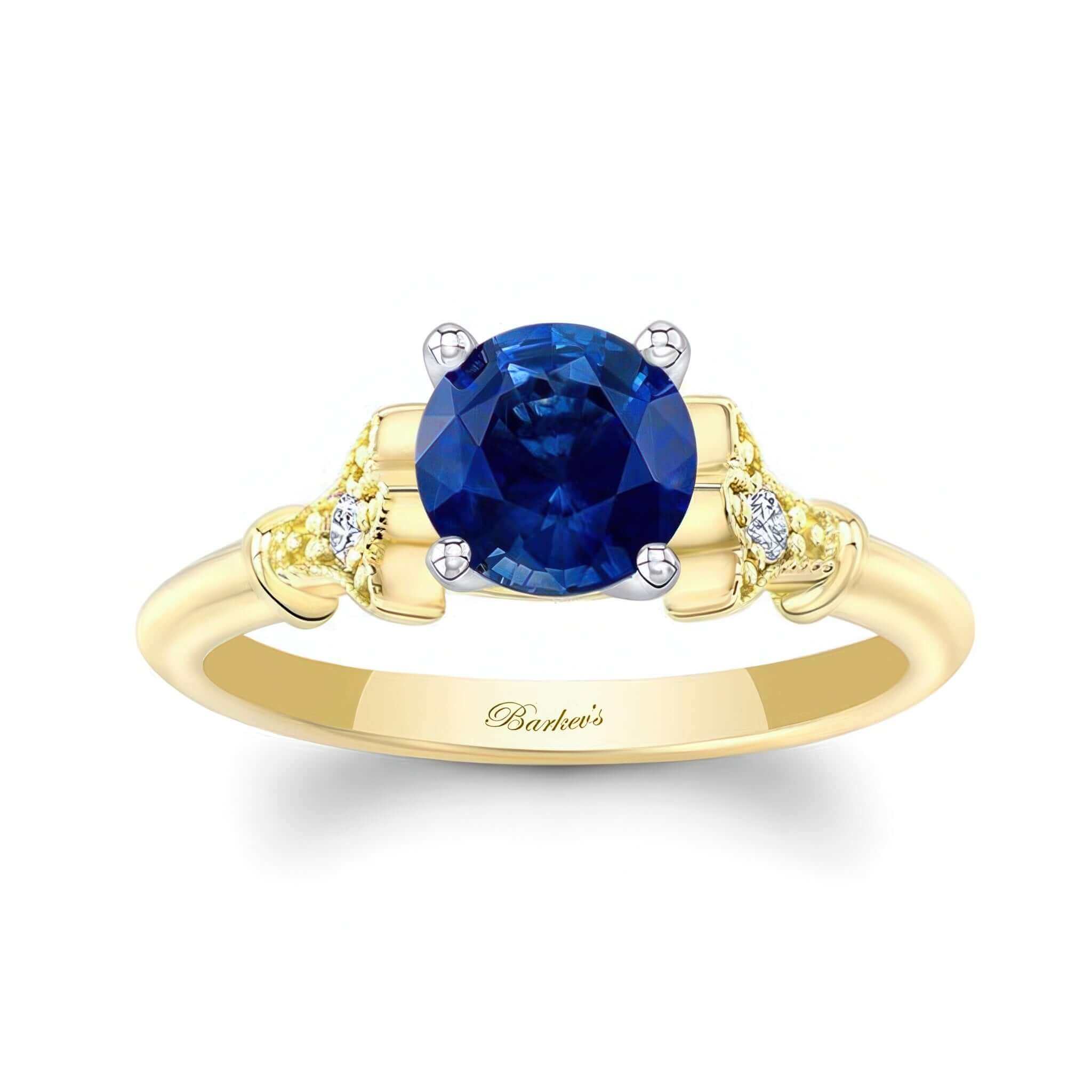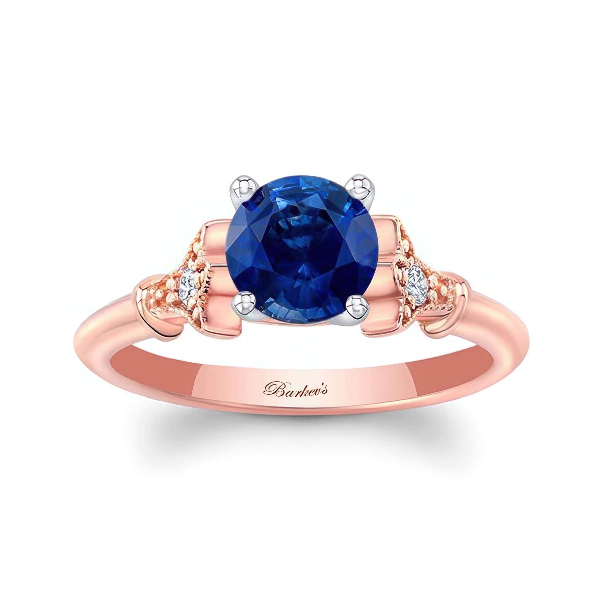 A beautiful petite leaf blue sapphire and diamond engagement ring featuring a minimal design with a prong set round center and 2 diamonds embedded into the center of a leaf motif on each side for a stunning vintage look.