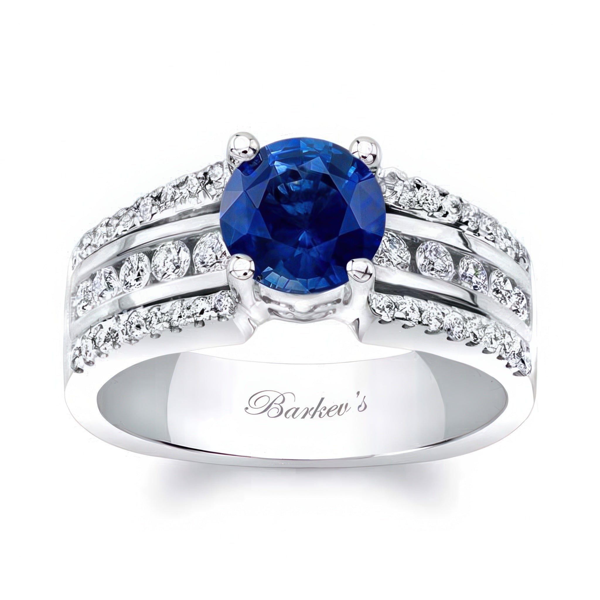 Romance is in the air with this round blue sapphire and diamond channel set engagement ring featuring a prong set round center with three rows of diamonds cascading down the shoulders with the center row being channel set for an updated traditional look.