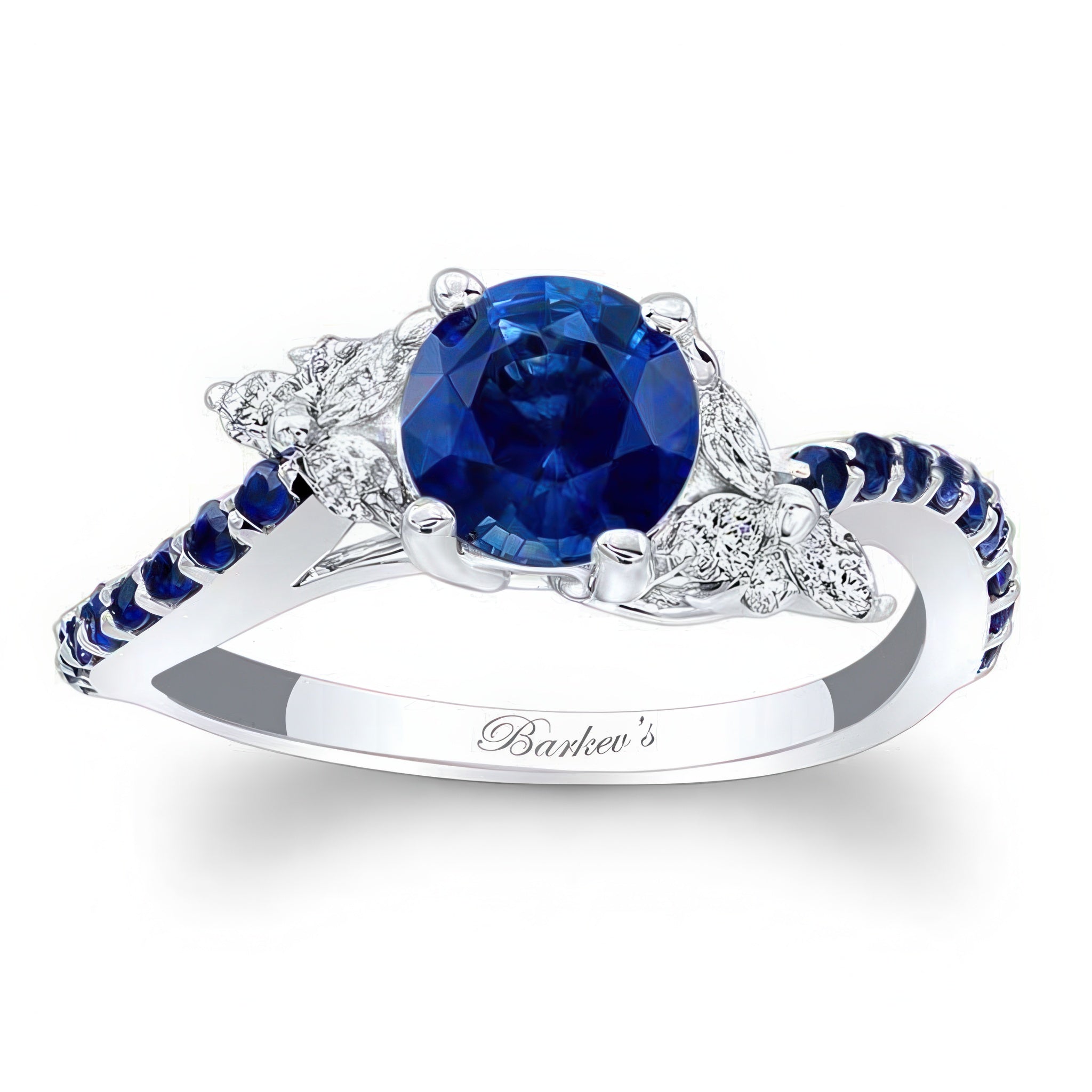 This round blue sapphire ring features a prong set center flanked on each side by fancy marquise diamonds with blue sapphires cascading down the shoulders for an elegant fashion statement.