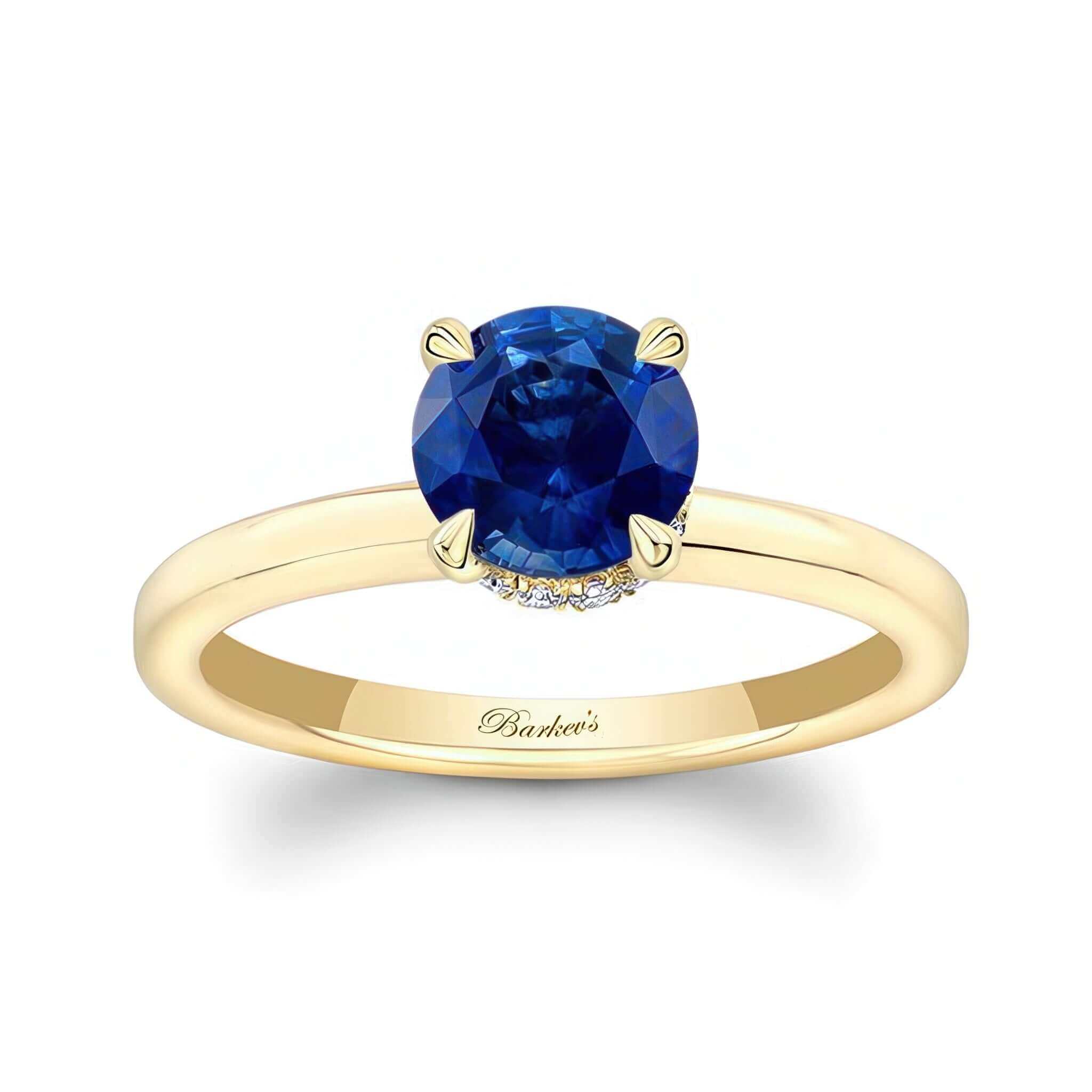 An elegant round hidden halo blue sapphire and diamond engagement ring featuring a prong set round center with a micro pave diamond halo beneath it for a minimalistic and modern look.
