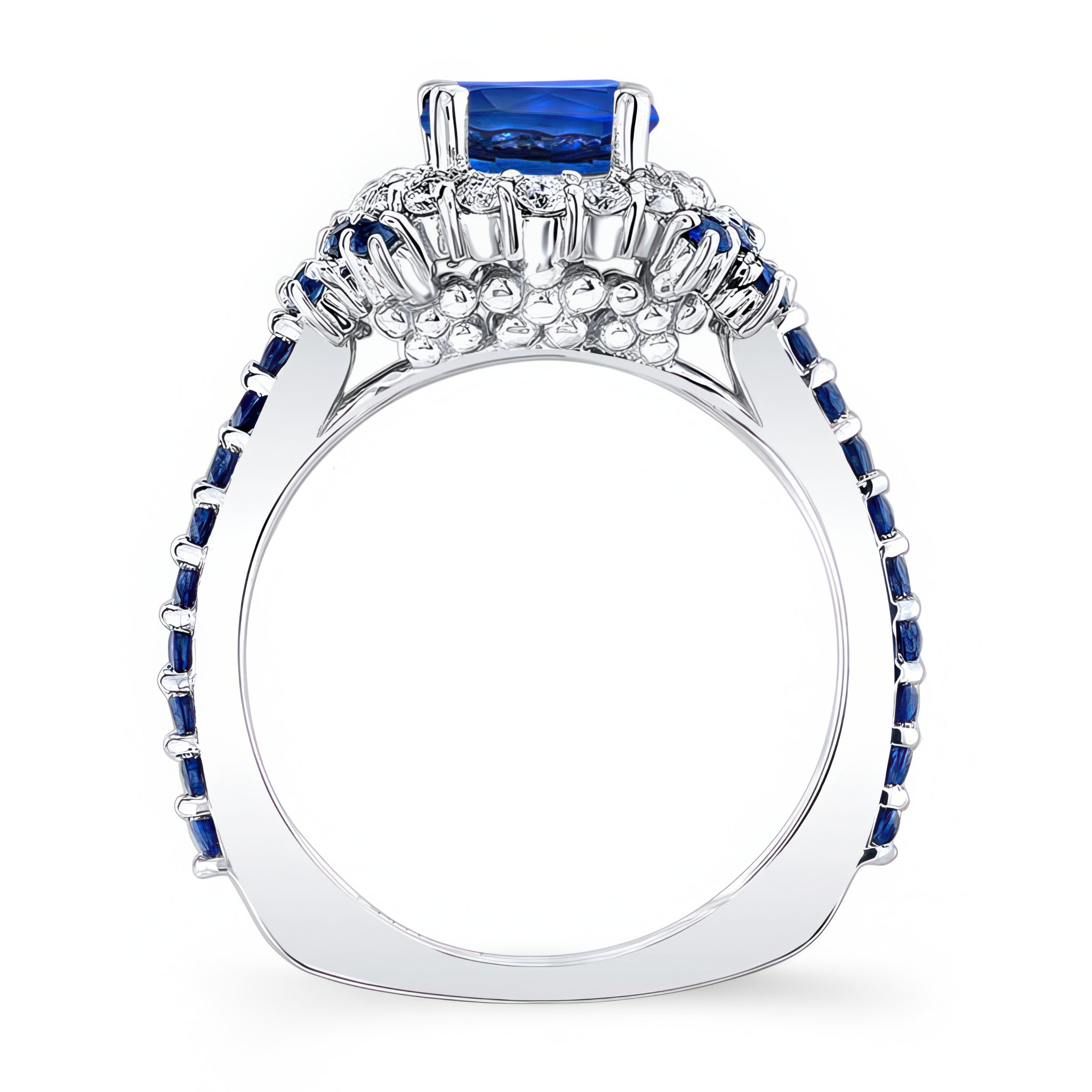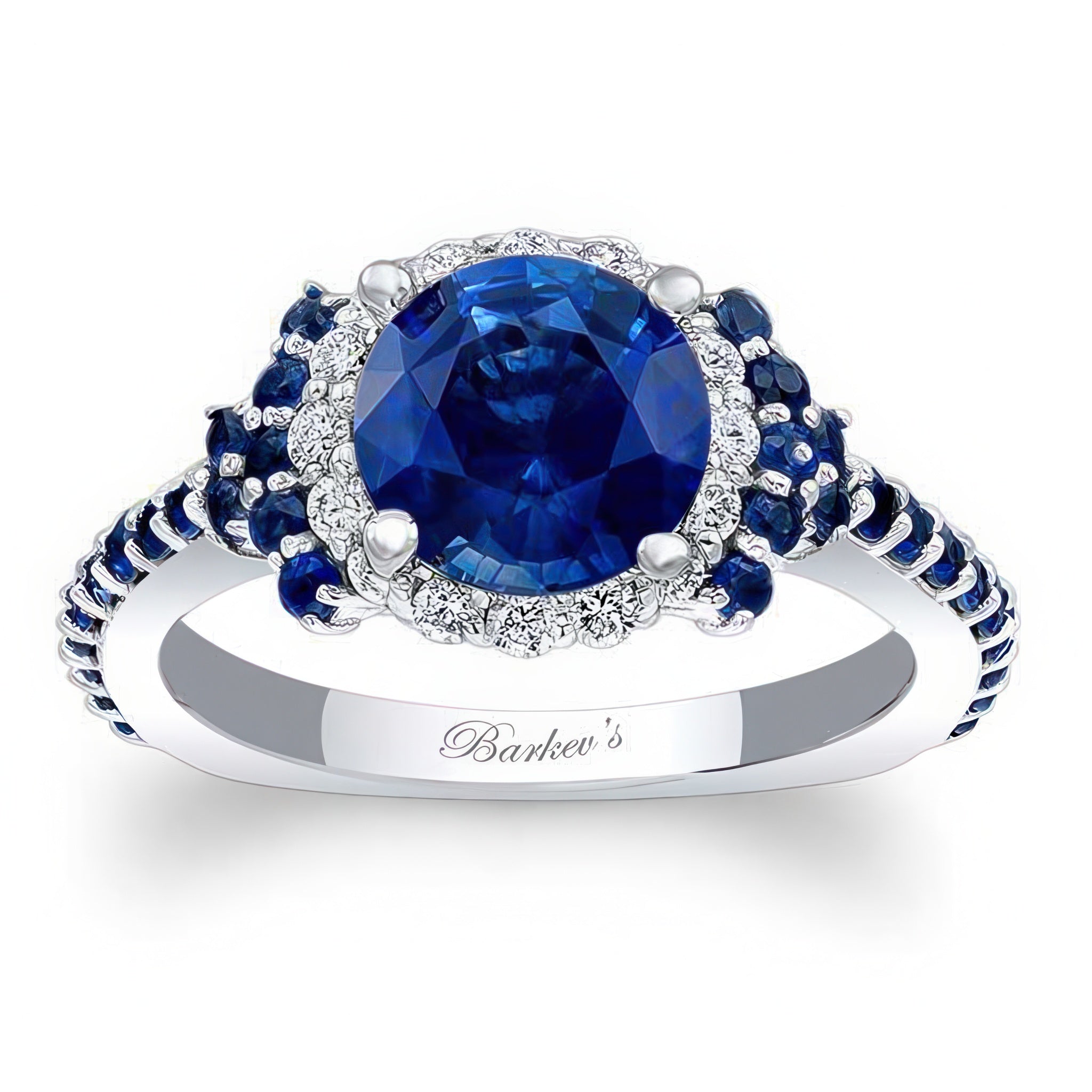 This sapphire cluster ring features a prong set round blue sapphire center with a diamond halo and shared prong set blue sapphires flowing down the shank.