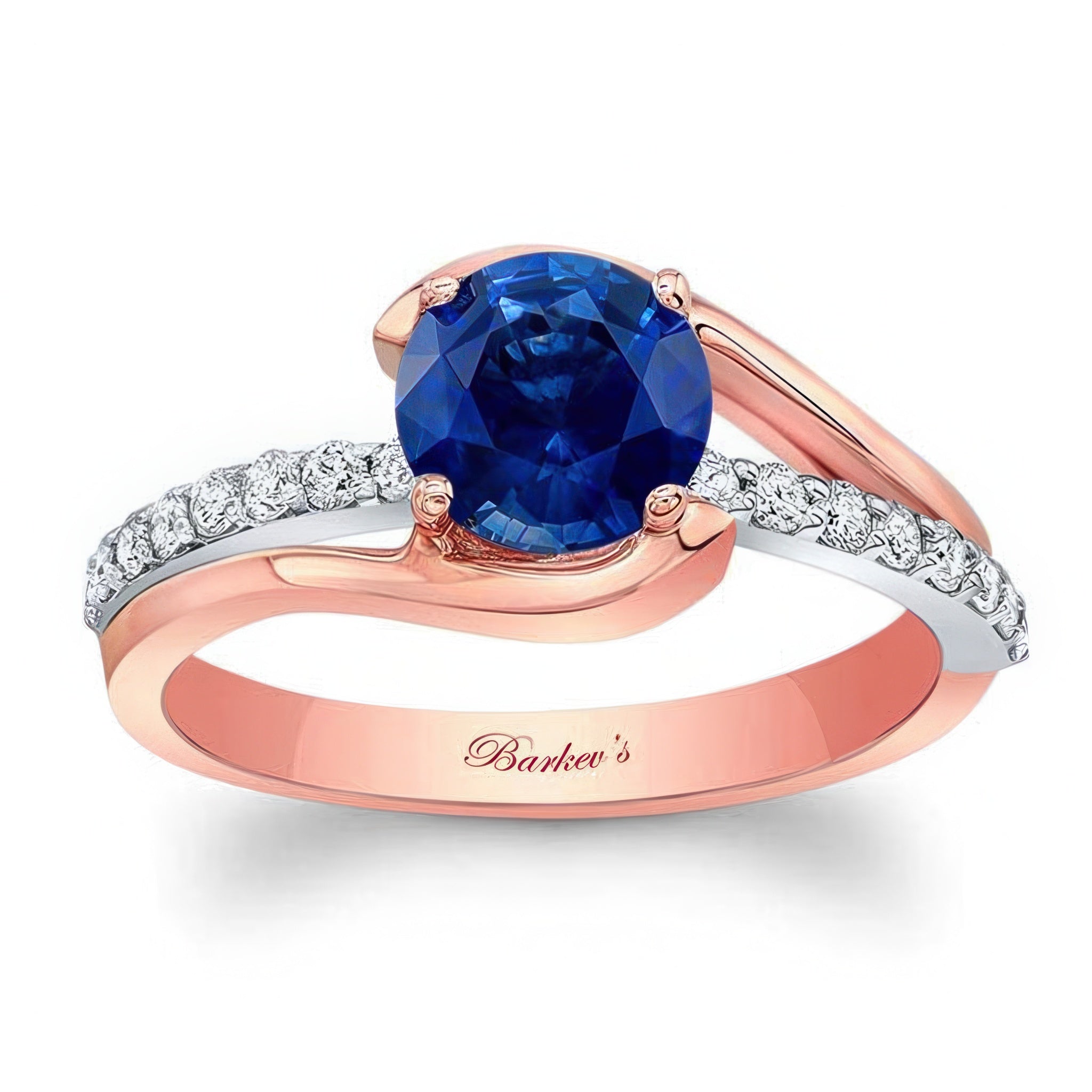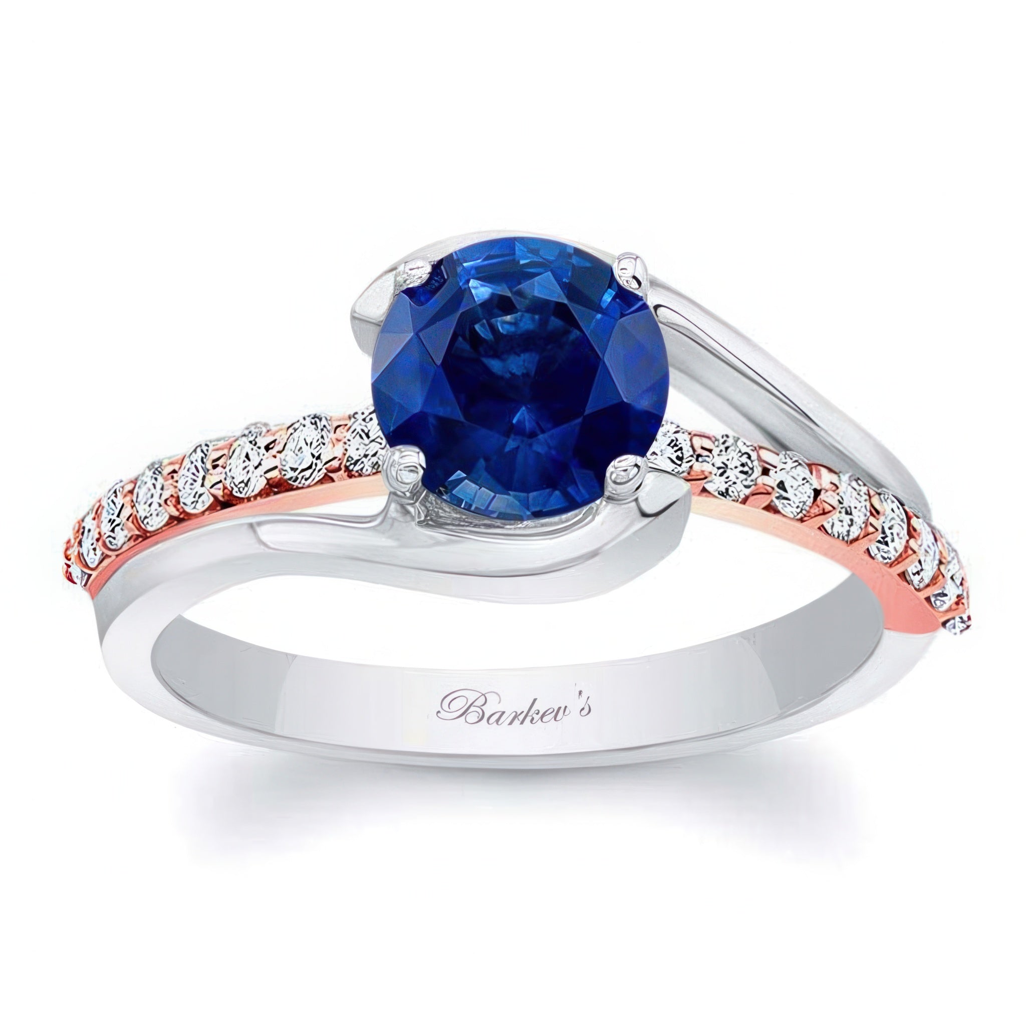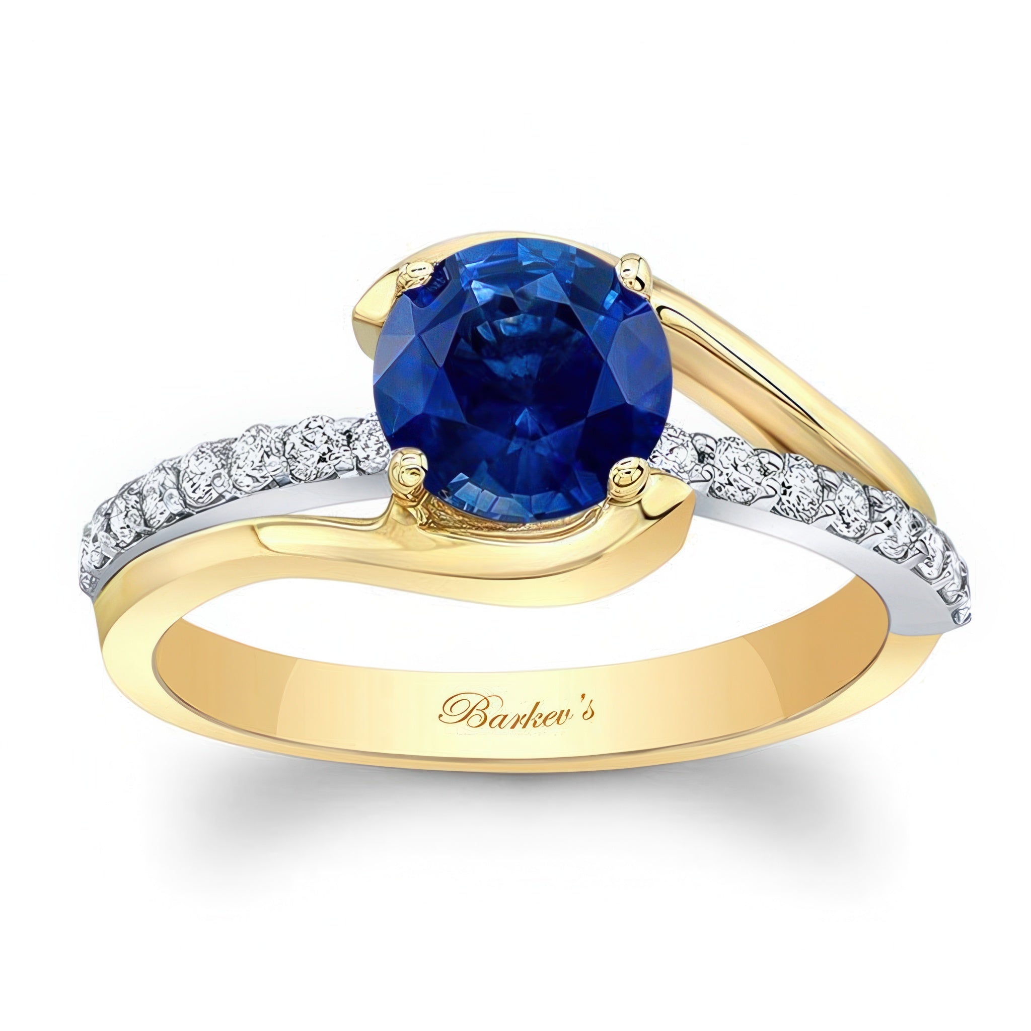 This simple 1 carat round blue sapphire and diamond ring features a split shank that swirls to cradle the round center while a shared prong set diamond bridge crosses underneath for a dramatic fashion statement.