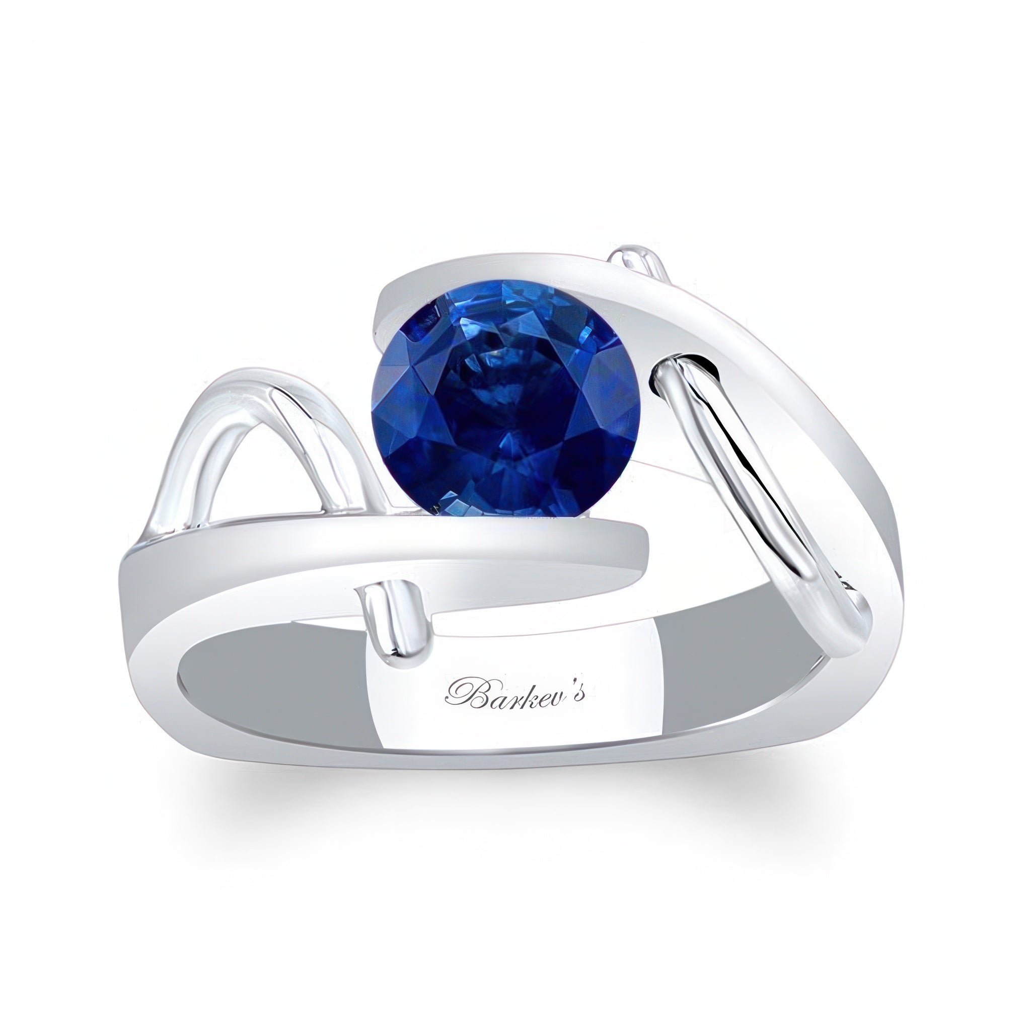This solitaire channel set blue sapphire ring features a round center with bright polished shoulders adorned with two wire trims curving though the shank on both sides for a dramatic artistic flare.