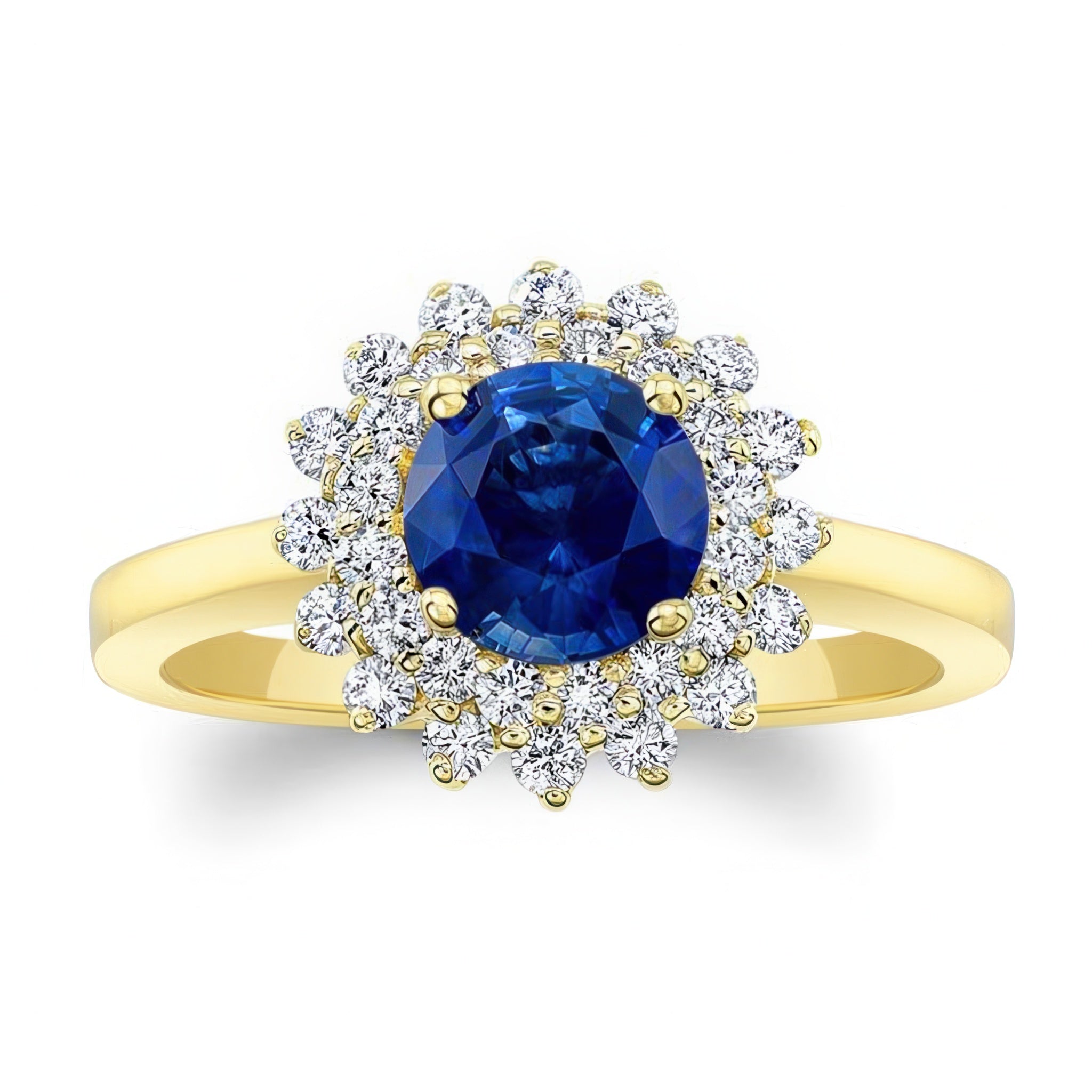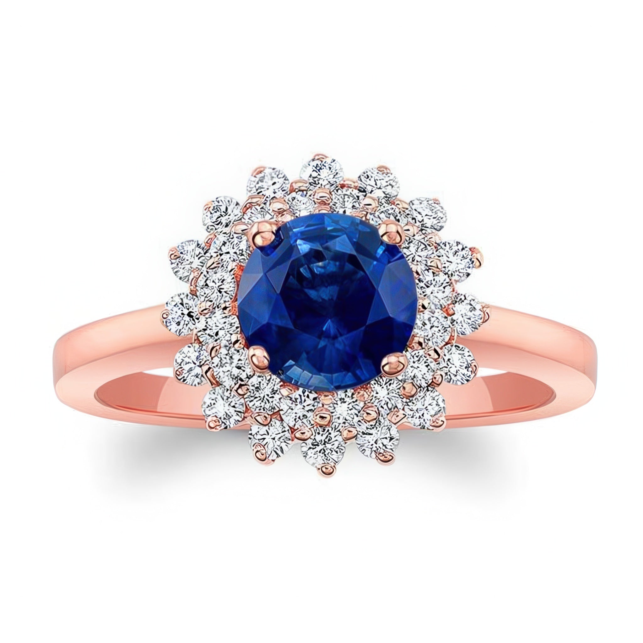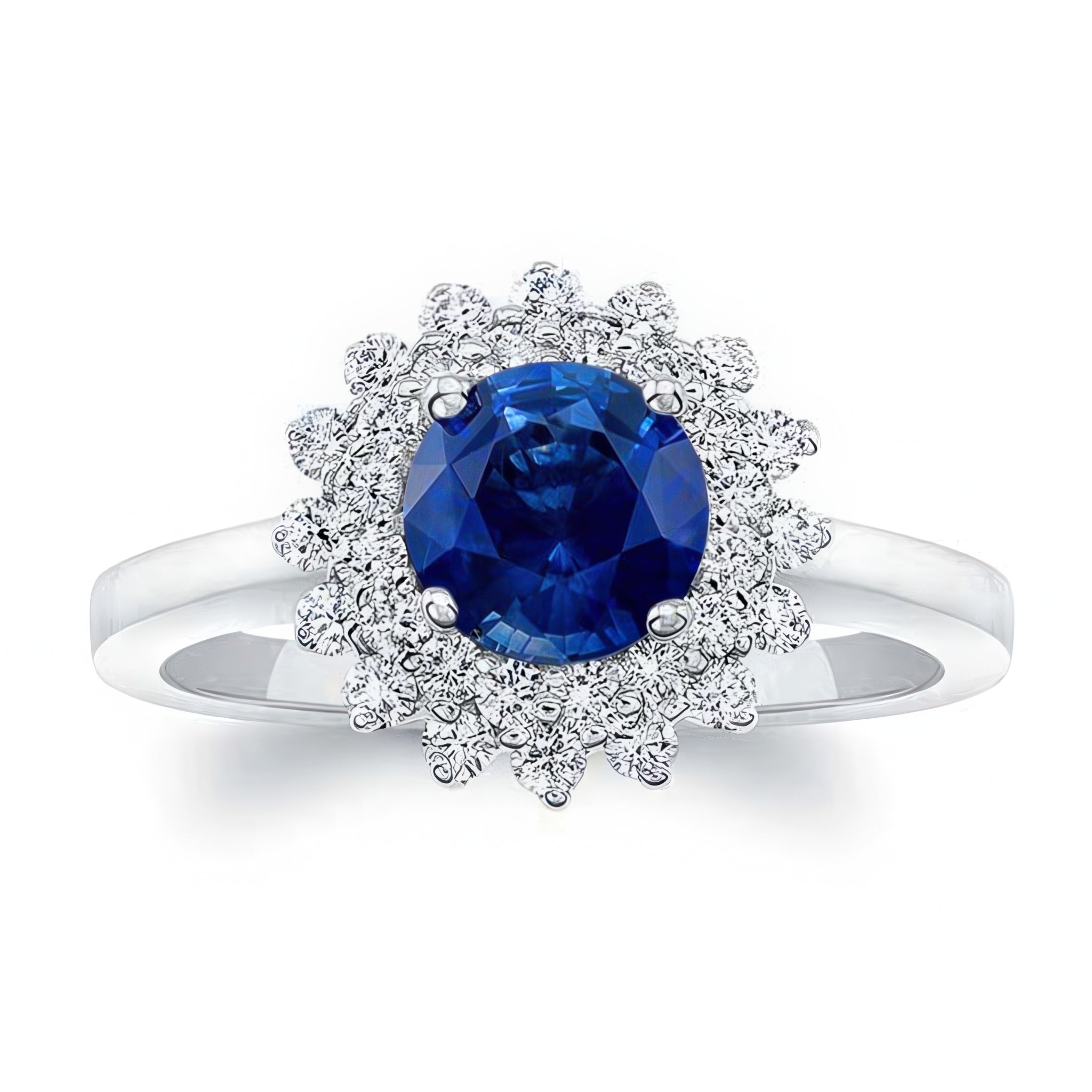 An exquisite starburst blue sapphire and diamond ring featuring a prong set round center encircled with two diamond halos with the outer one giving the illusion of a burst pattern. The final touch is visible on the profile view with a dainty polished shank featuring a simple motif design for a stunning look.