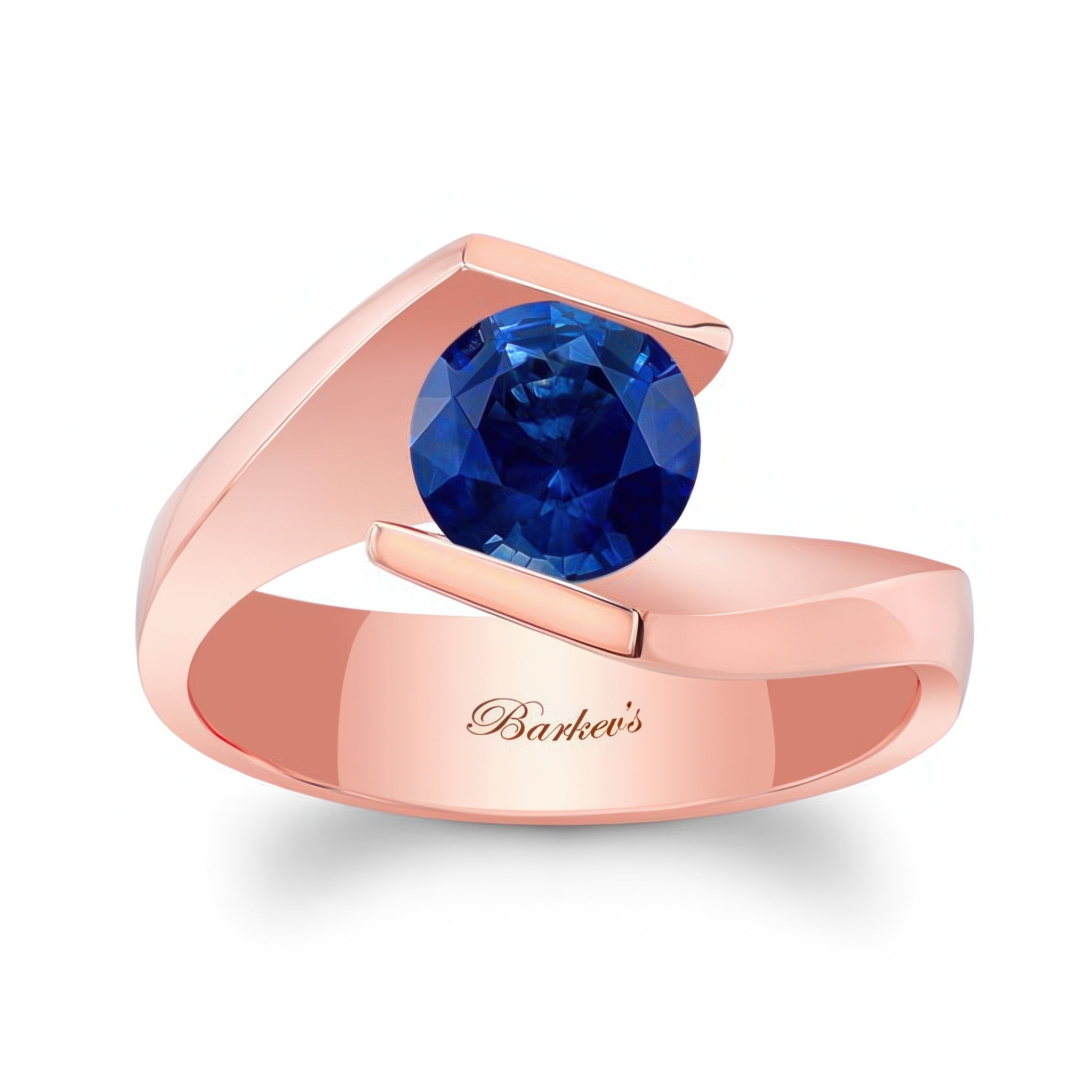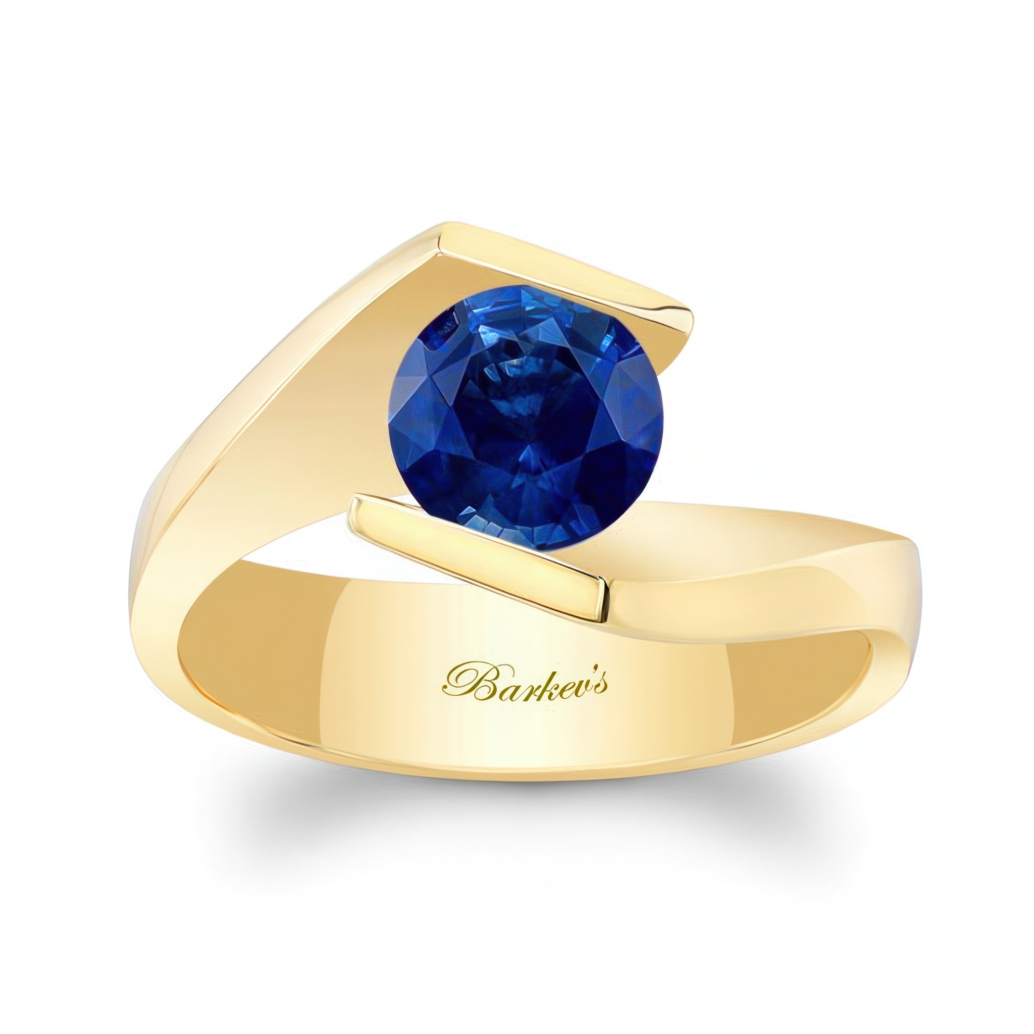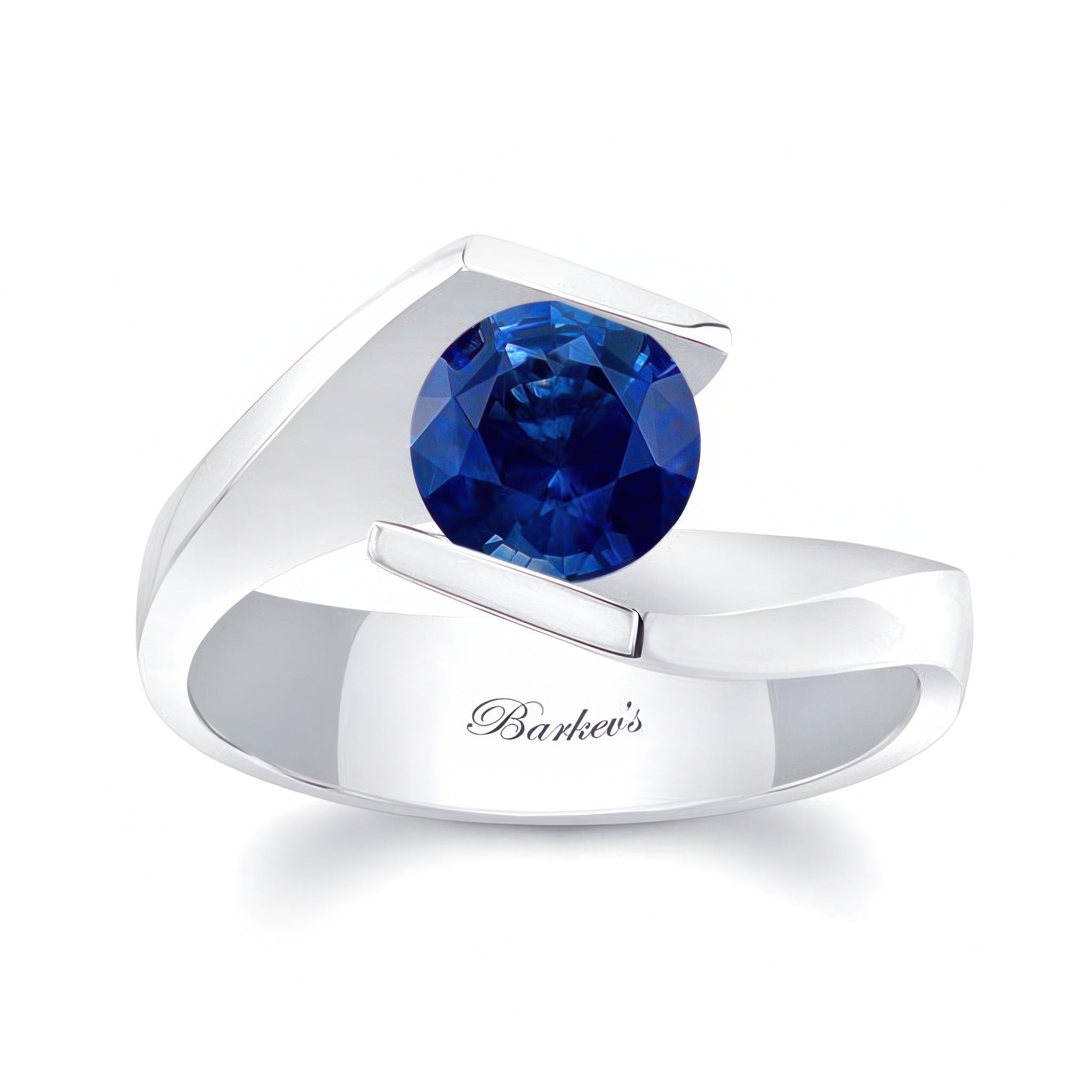 An elegant tension solitaire blue sapphire ring featuring a round center with a bypass shank.