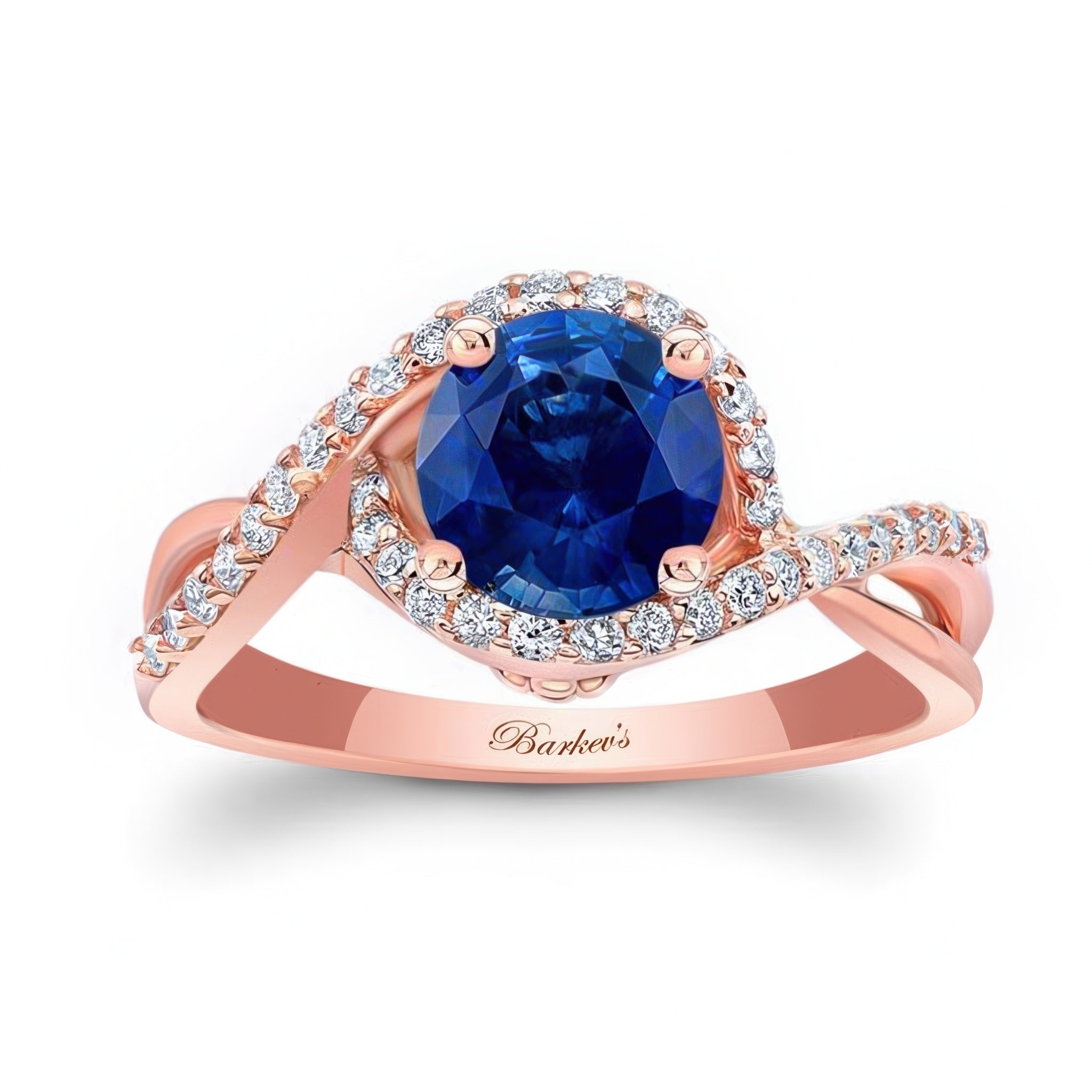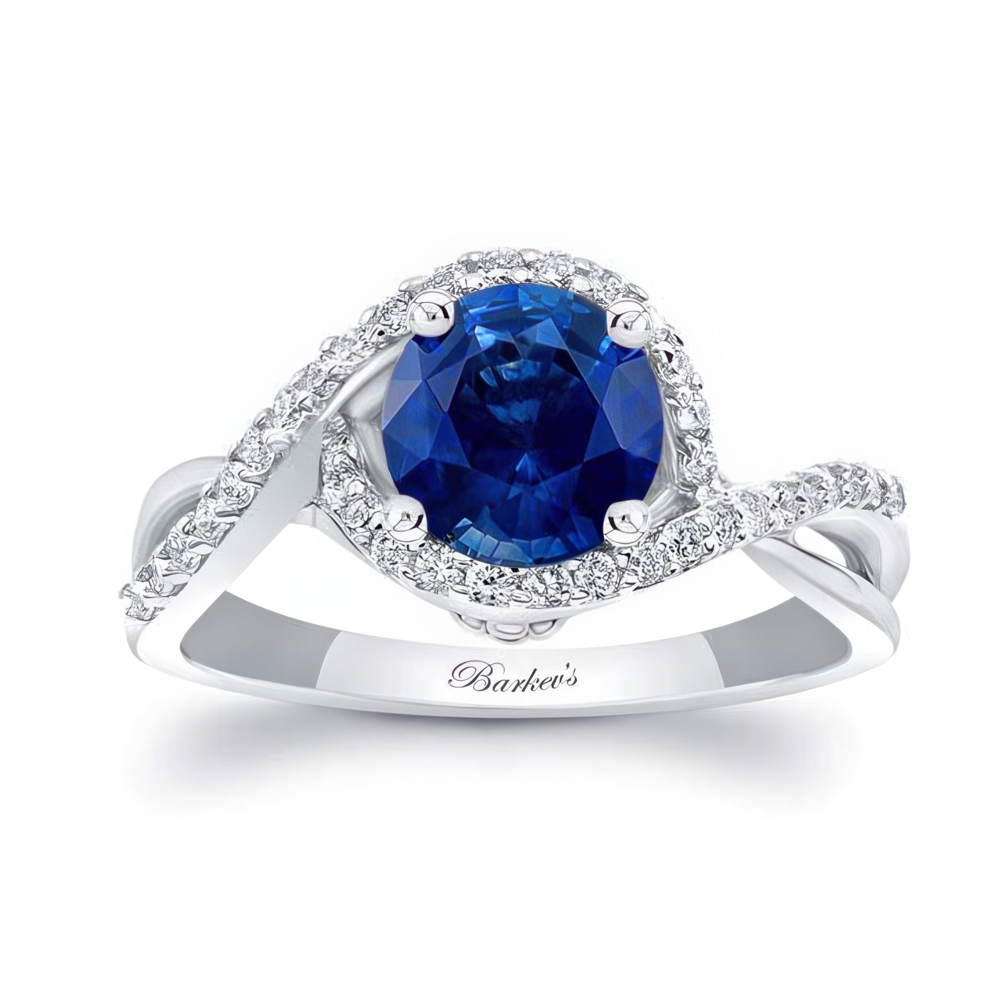 A stunning twisted halo blue sapphire and diamond engagement ring giving off a classic nature vibe with a round center that is encircled by diamonds that flow down the entwined shoulders and reveal a simple flower pattern on the profile view.