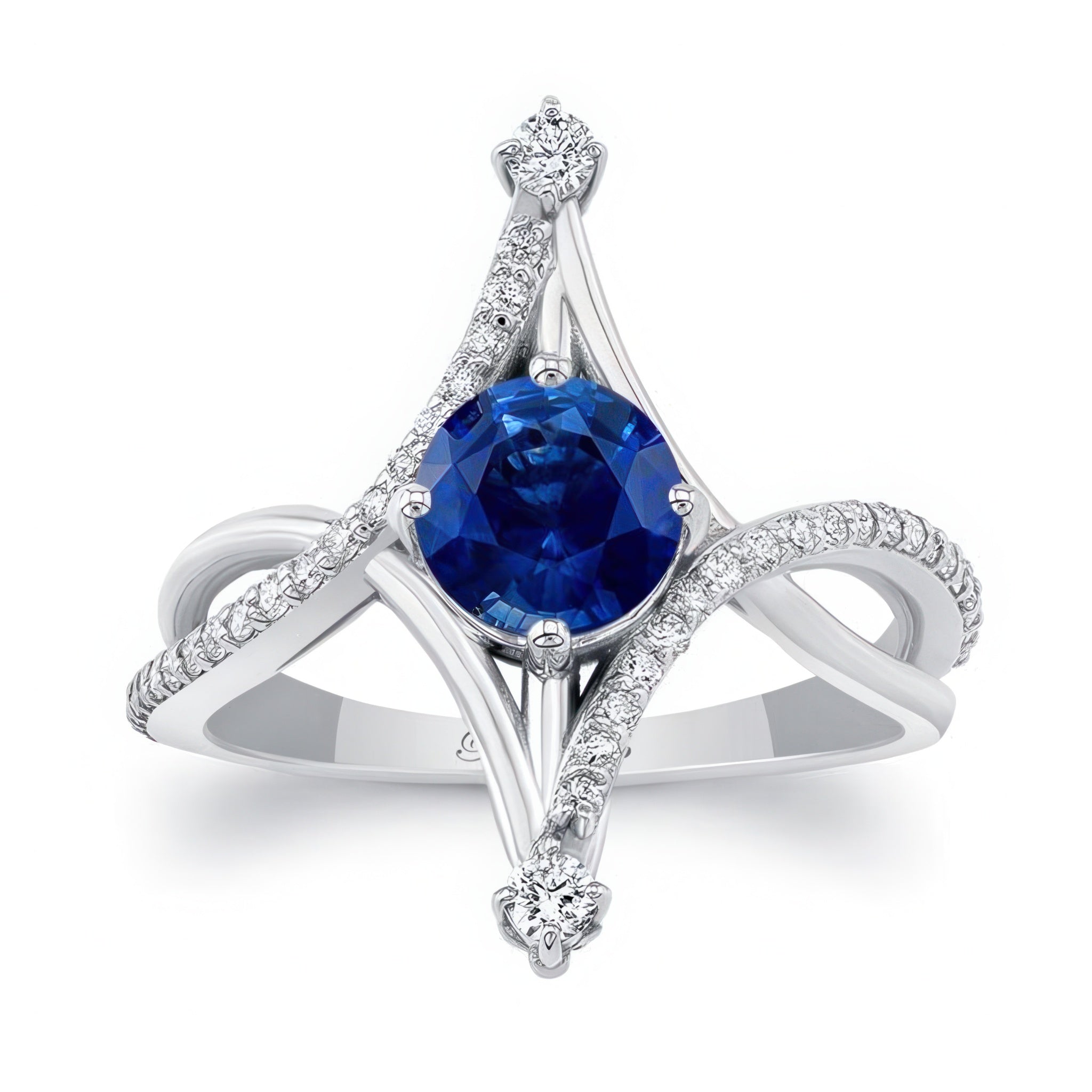 An unusual round blue sapphire and diamond ring with it's center glorified by two smaller diamonds set at 12 and 6 o'clock while elegant diamond swirls decorate the sides for a dazzling look.