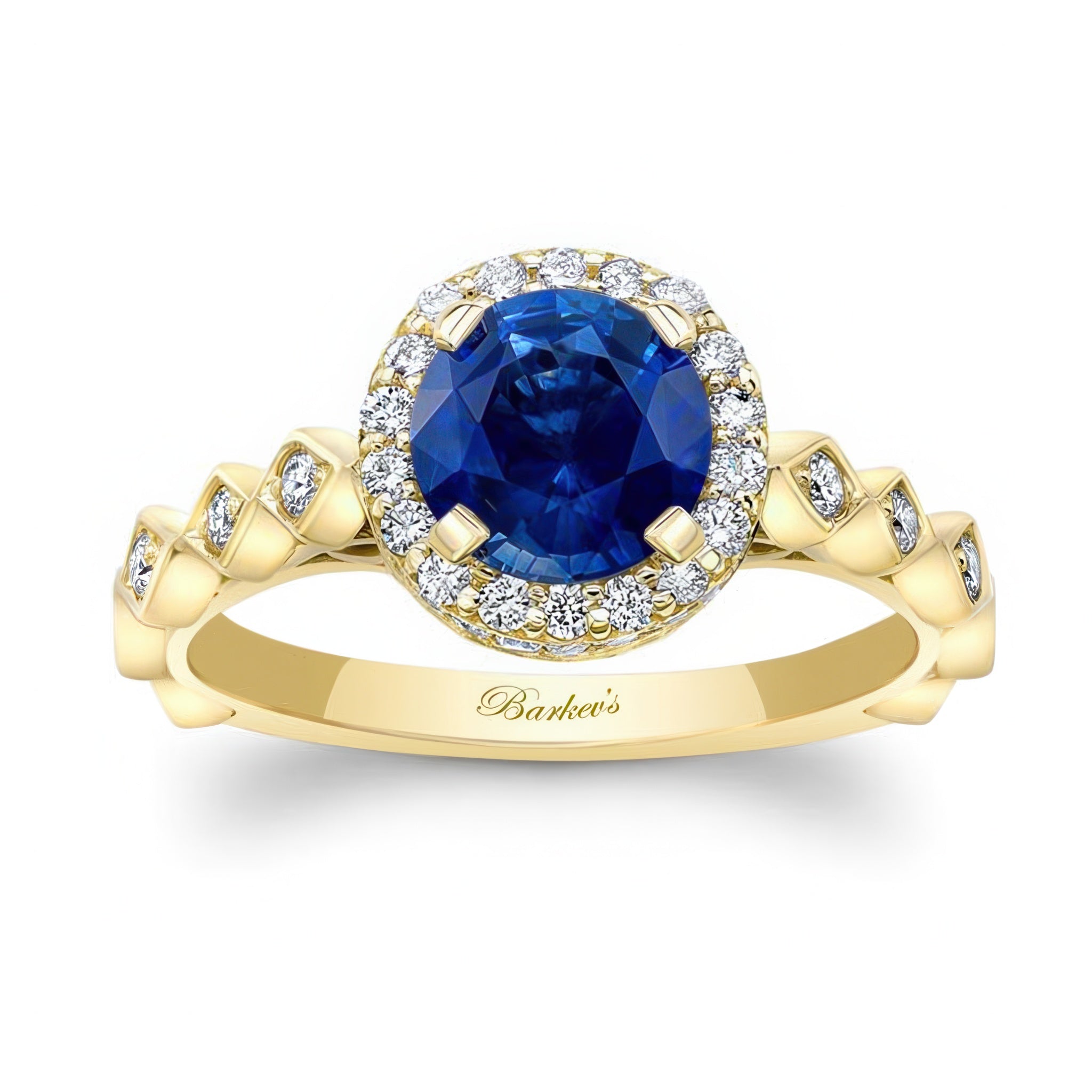 A vintage halo blue sapphire and diamond ring featuring a prong set round center with a pave set diamond halo and a shank adorned with diamonds set in marquise shaped frames that add graceful sparkle to this brilliant ring.