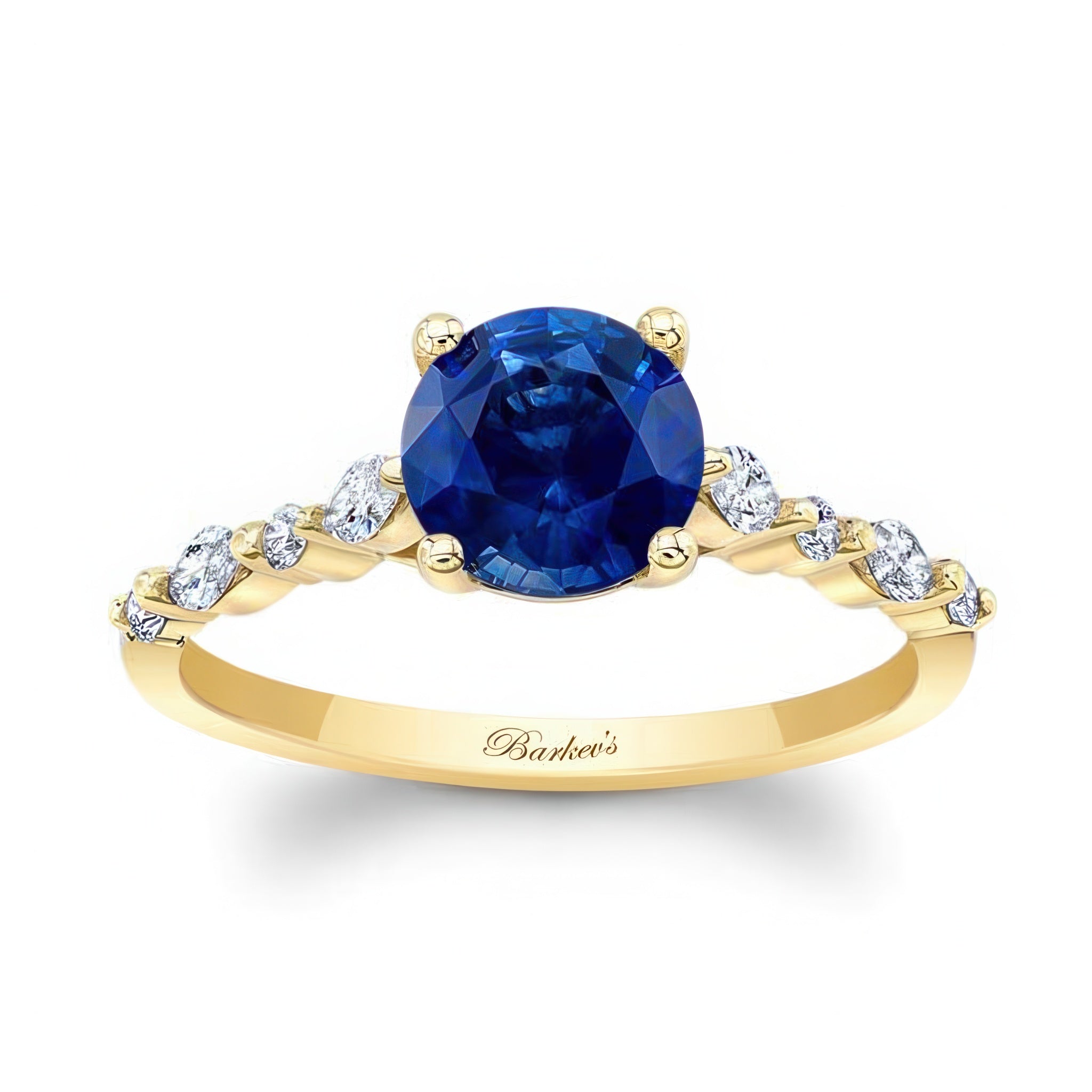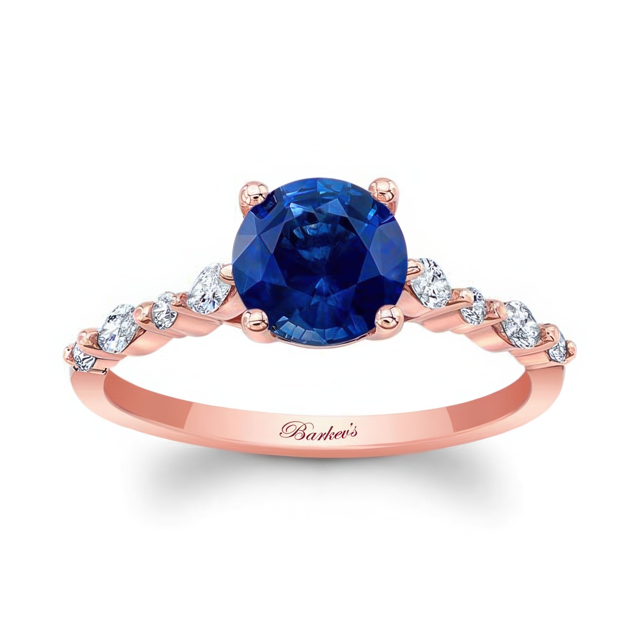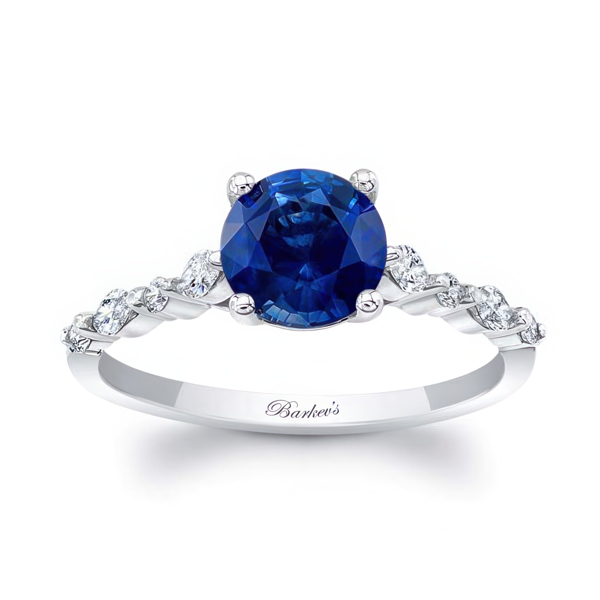 This delicate and chic vintage style blue sapphire and diamond ring sports a round center adorned on each side by a gentle set of alternating round and marquise diamonds.