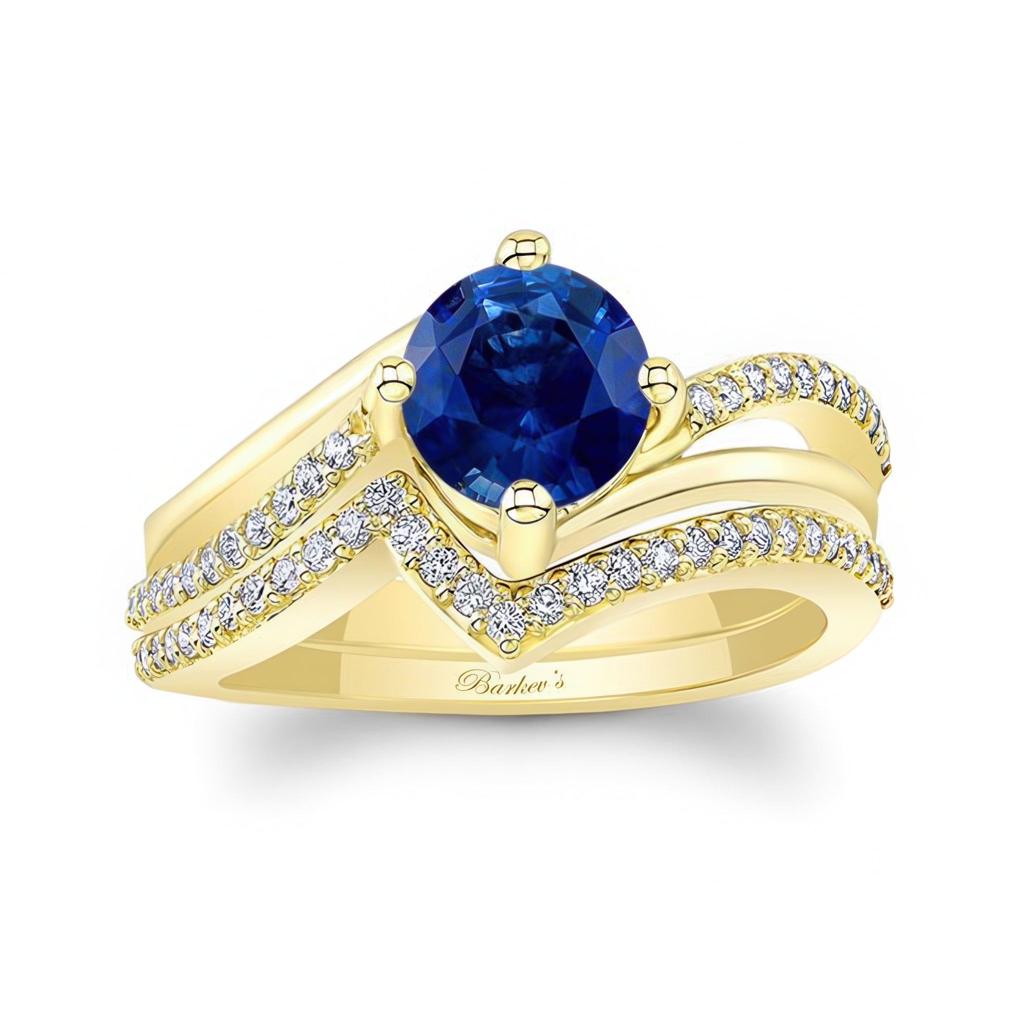 A blue sapphire and diamond split shank wedding set featuring a round center nestled between separated swirls adorned with diamonds for an extra touch of brilliance. Comes with a matching wedding band.