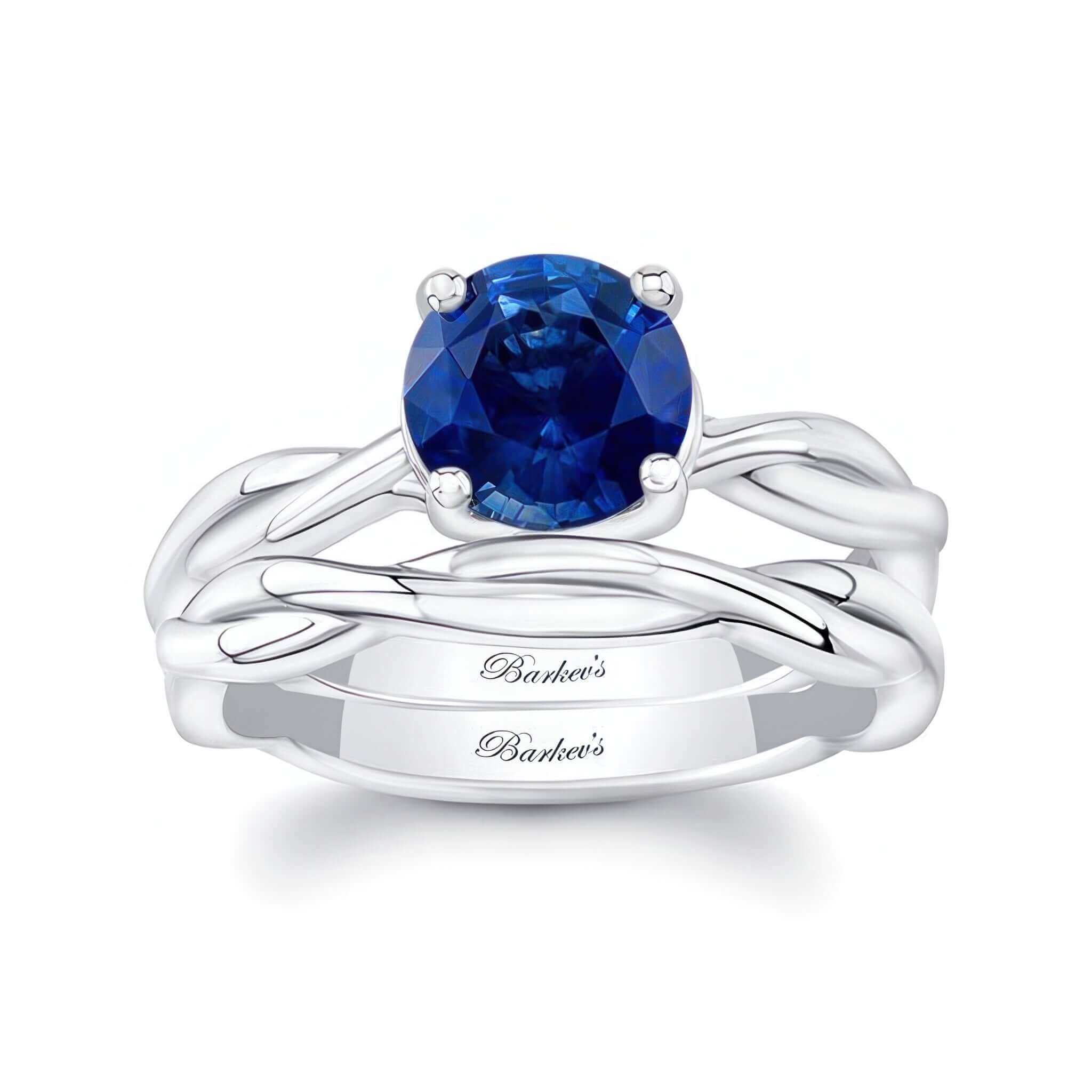 A beautiful blue sapphire twist solitaire bridal set featuring a unique curving and twisting shank with a prong set round center and a matching wedding band.