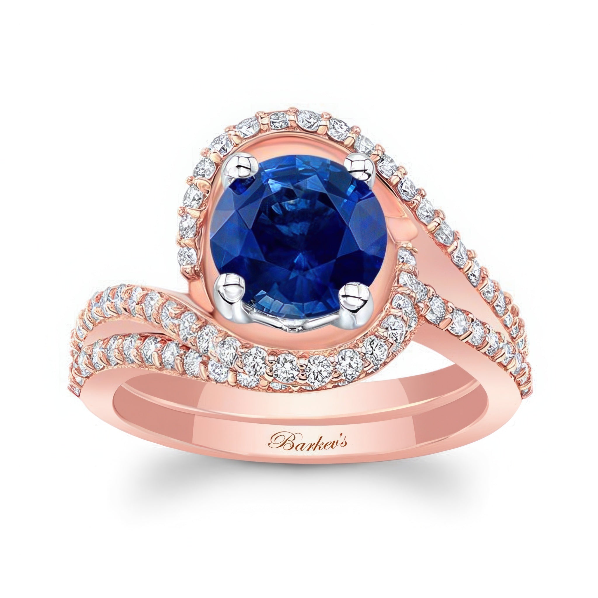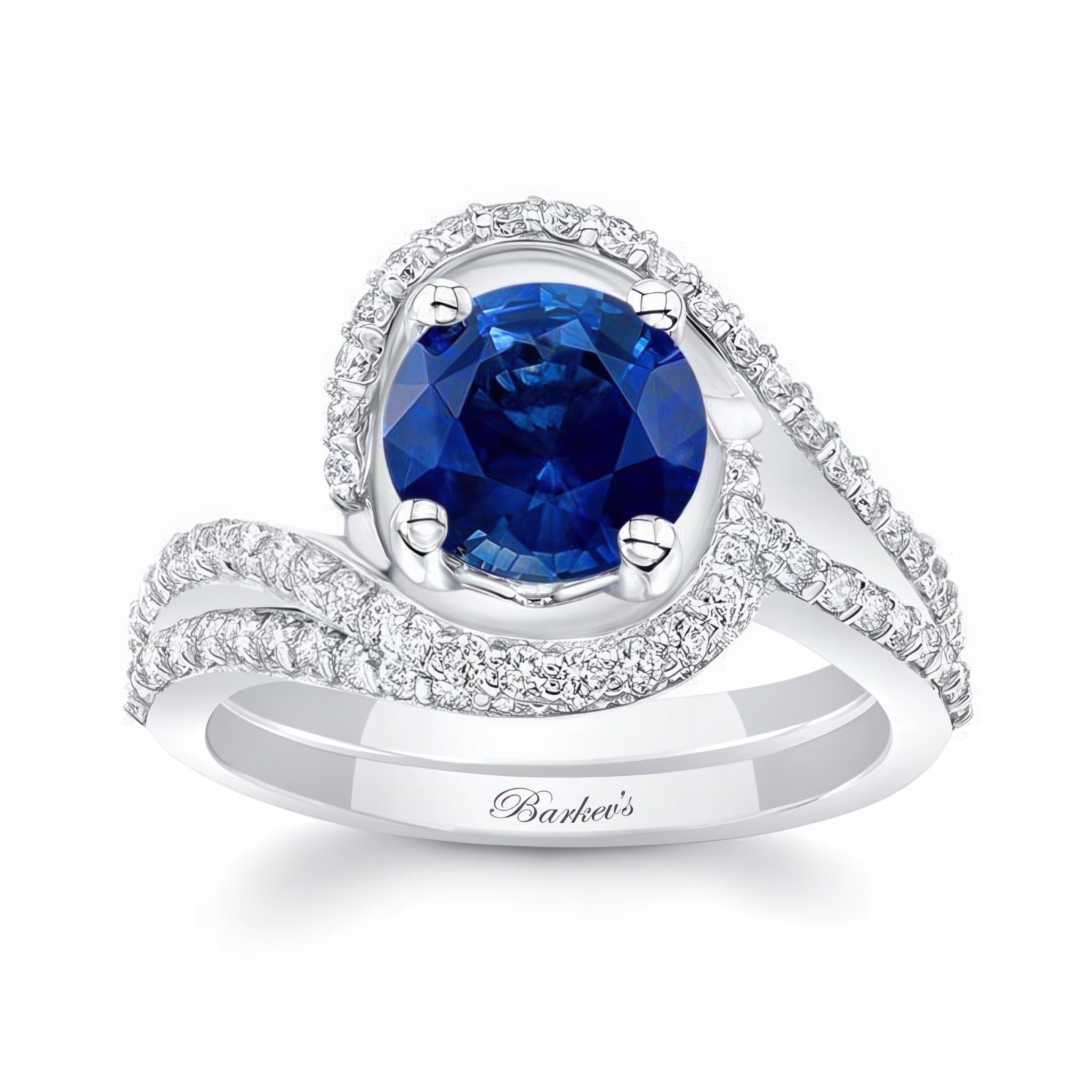 An elegant floating halo blue sapphire and diamond bridal set with a round center and a split shank that wraps around the center adorned with micro pave diamonds for added sparkle. Comes with a matching wedding band.