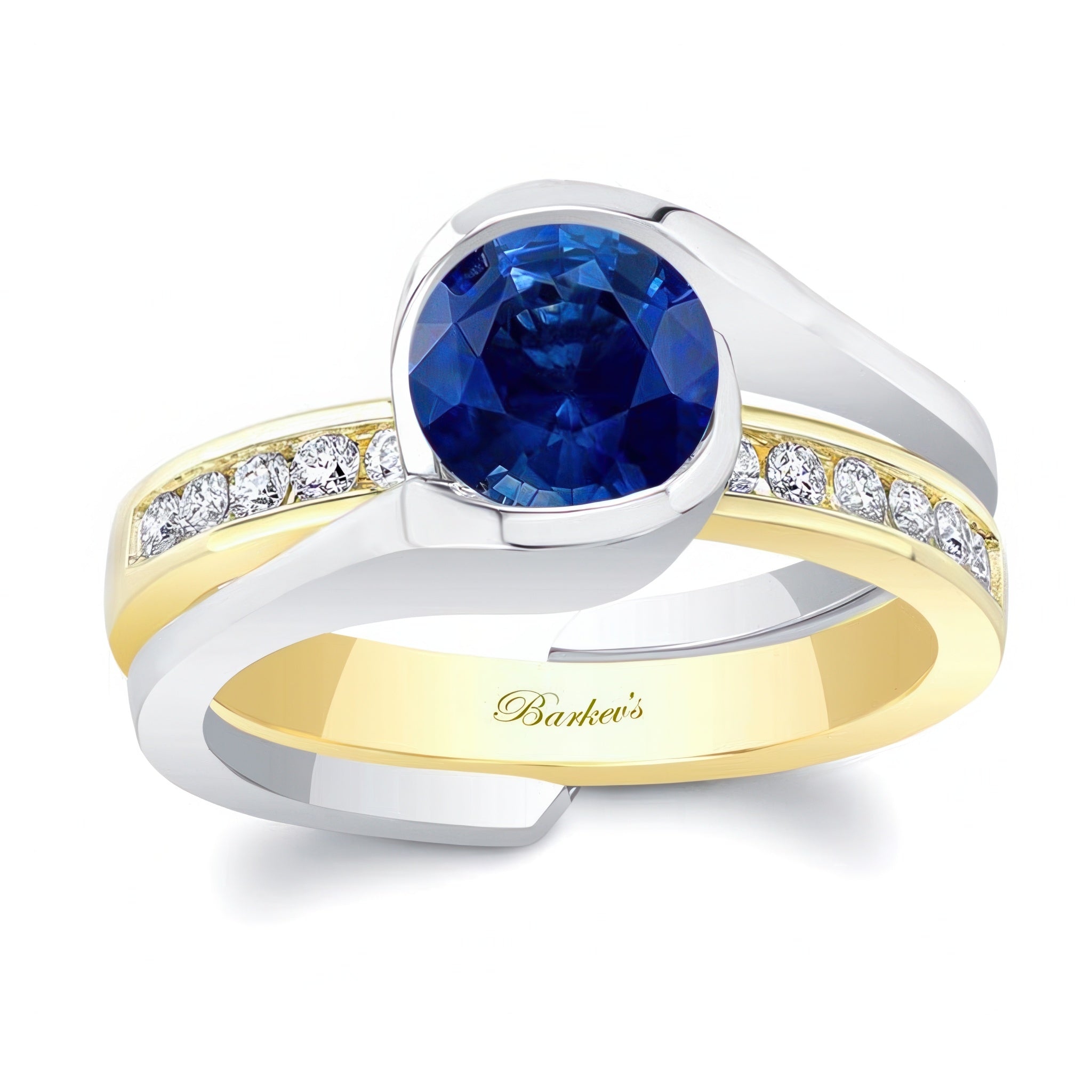 This half bezel blue sapphire and diamond interlocking bridal set features a classic round center and a channel set diamond wedding band that slips into the ring for a display of true elegance.