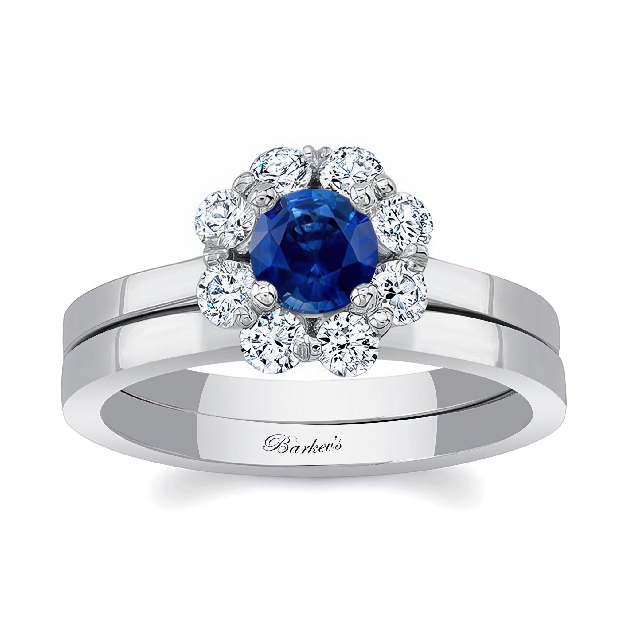 This halo blue sapphire and diamond solitaire wedding ring set features a prong set round center encircled with a diamond halo and a narrow plain shank. Comes with a matching wedding band.