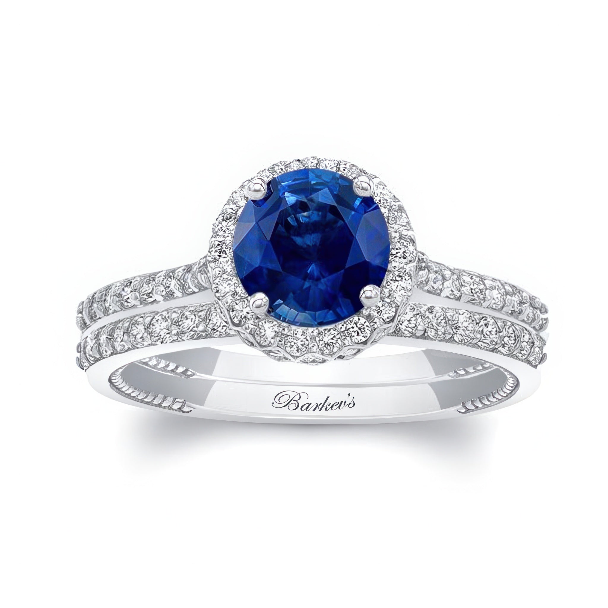 Round Halo Blue Sapphire And Diamond Wedding Set