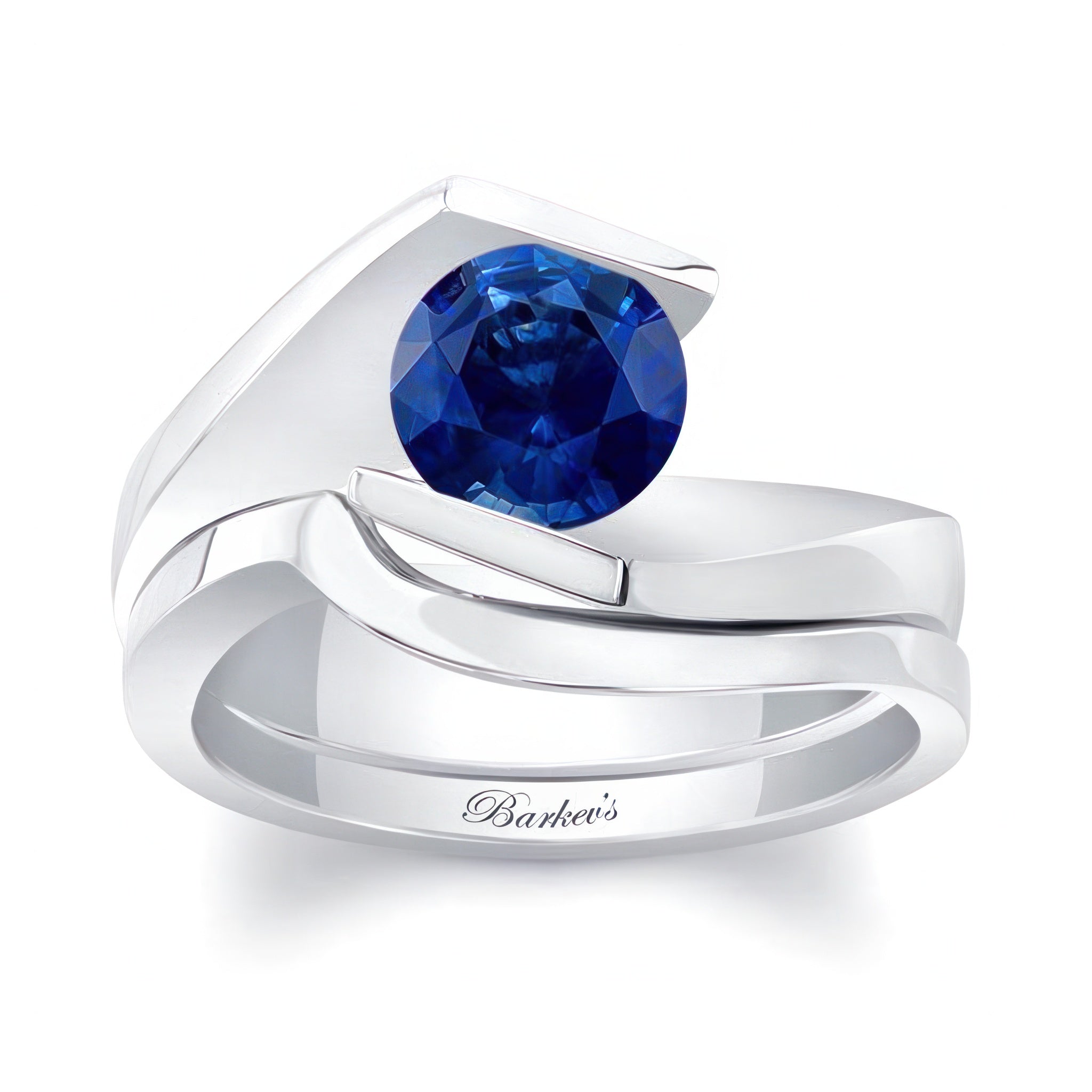 An elegant tension solitaire blue sapphire bridal set featuring a round center with a bypass shank and a matching plain wedding band.