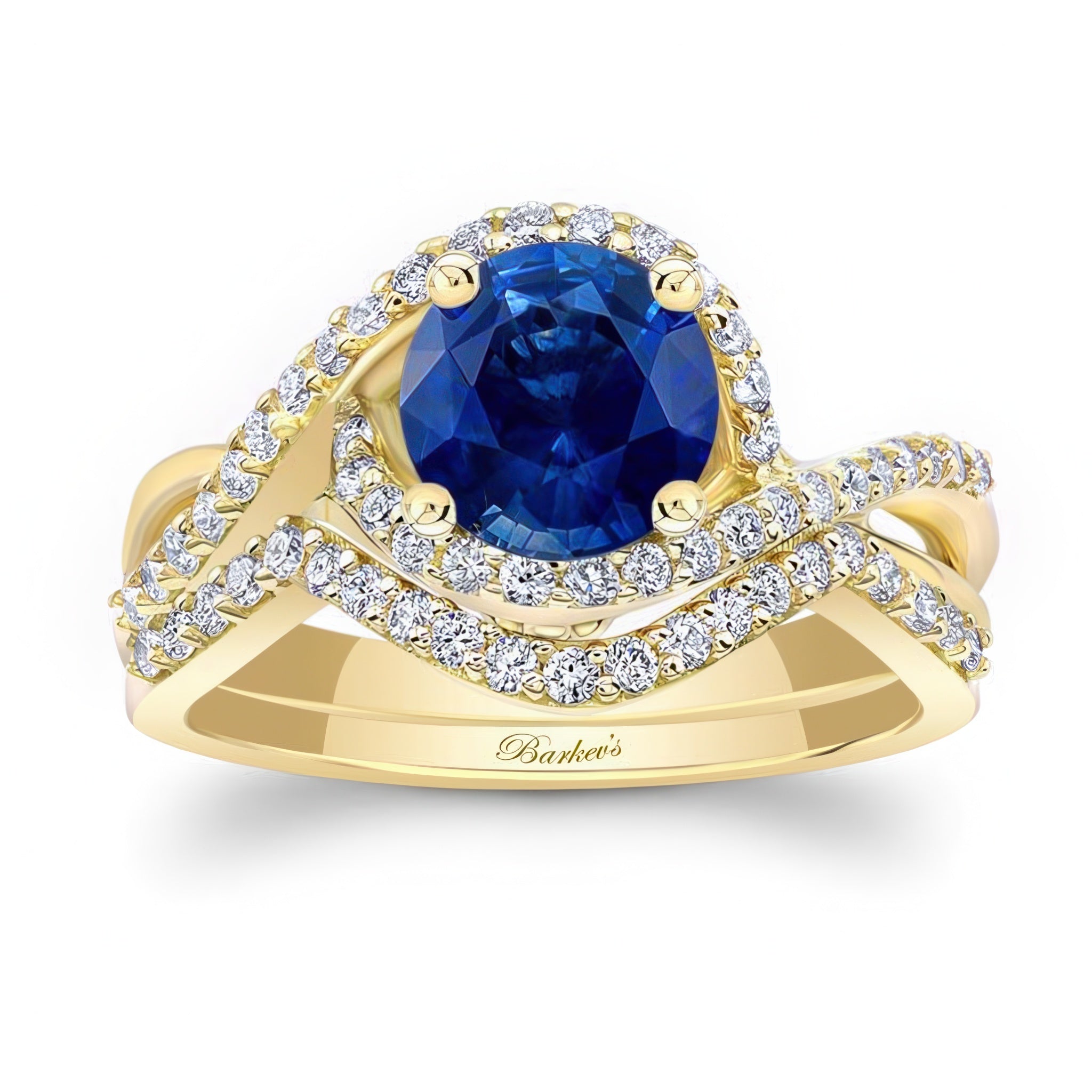 A stunning twisted halo blue sapphire and diamond wedding set giving off a classic nature vibe with a round center that is encircled by diamonds that flow down the entwined shoulders and reveal a simple flower pattern on the profile view. A sparkling wedding band snuggly embraces the sides with an elegant curve.