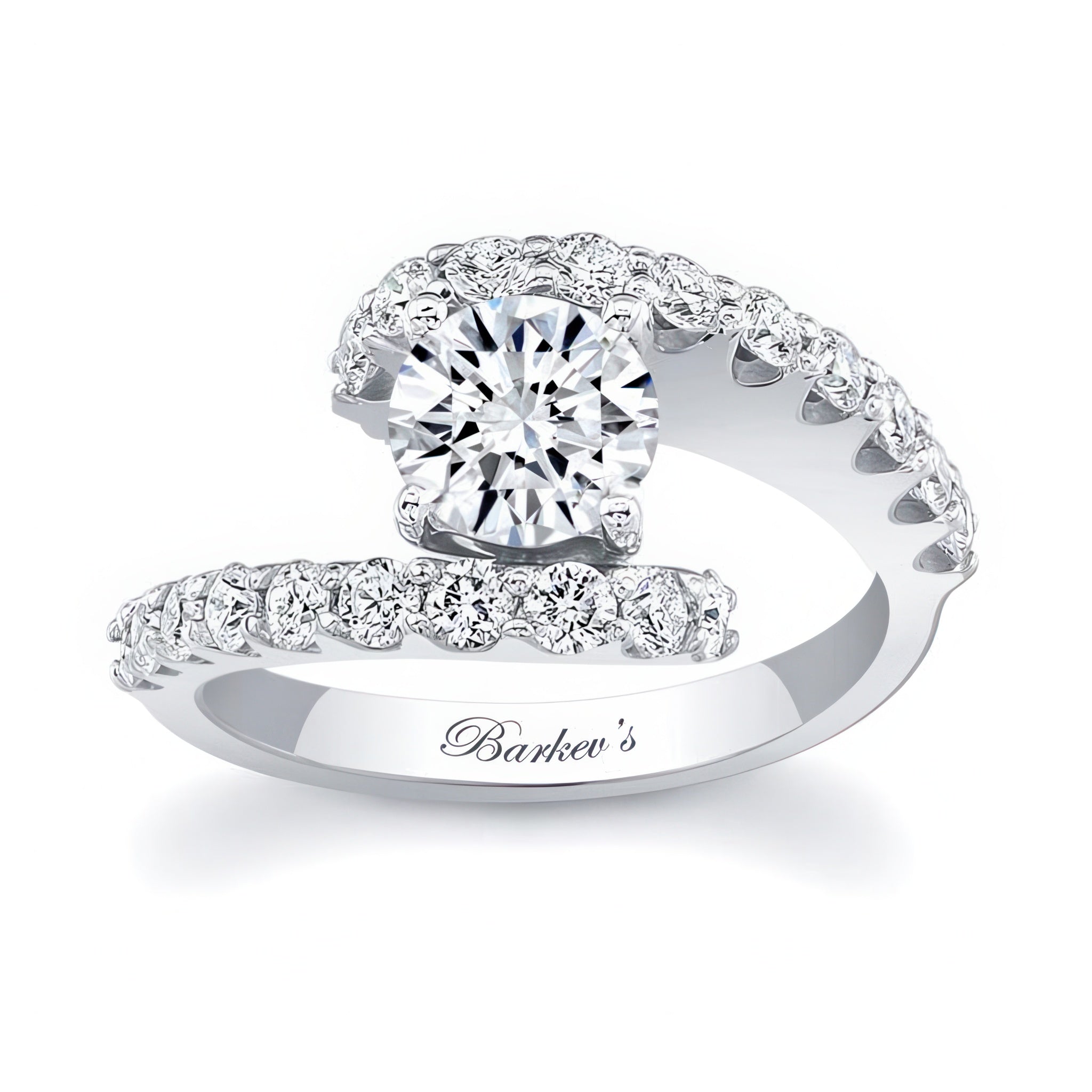 This split band engagement ring features a split shank with a prong set round center and shared prong set diamonds on the shoulders for a dramatic effect.