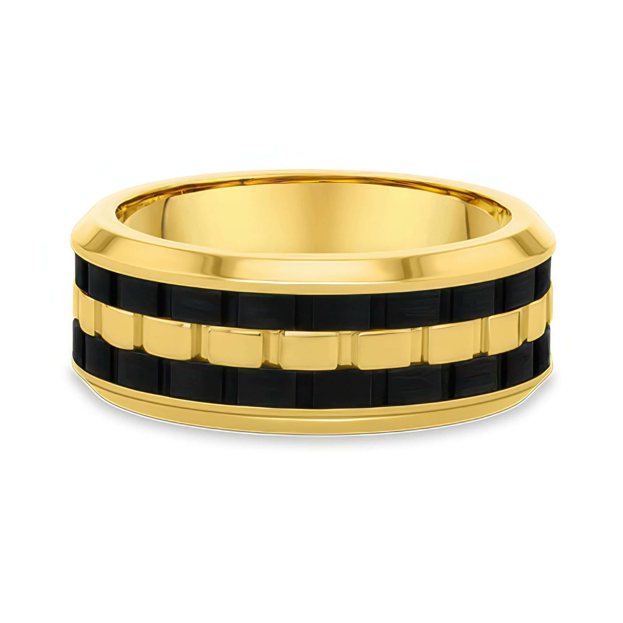 This 8mm yellow gold and carbon fiber wedding band brings bold style to a classic symbol. The polished yellow gold edges frame a striking carbon fiber inlay, detailed with a textured gold link pattern that adds depth and modern flair. Durable and distinctive, this yellow gold and carbon fiber wedding band is perfect for grooms who want a strong, contemporary look with lasting elegance.