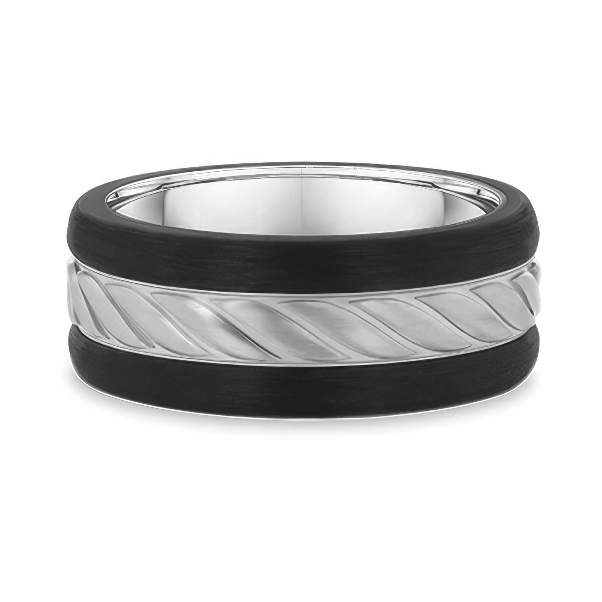 This Carbon Fiber and White Gold Grooved Men’s Band blends classic luxury with modern strength. A polished white gold center features a bold diagonal groove pattern, framed by sleek black carbon fiber edges for striking contrast. The durable carbon fiber gives the band a contemporary edge, while the luminous white gold keeps it timeless and refined. Designed for grooms who want a wedding ring that is stylish, masculine, and built to last.