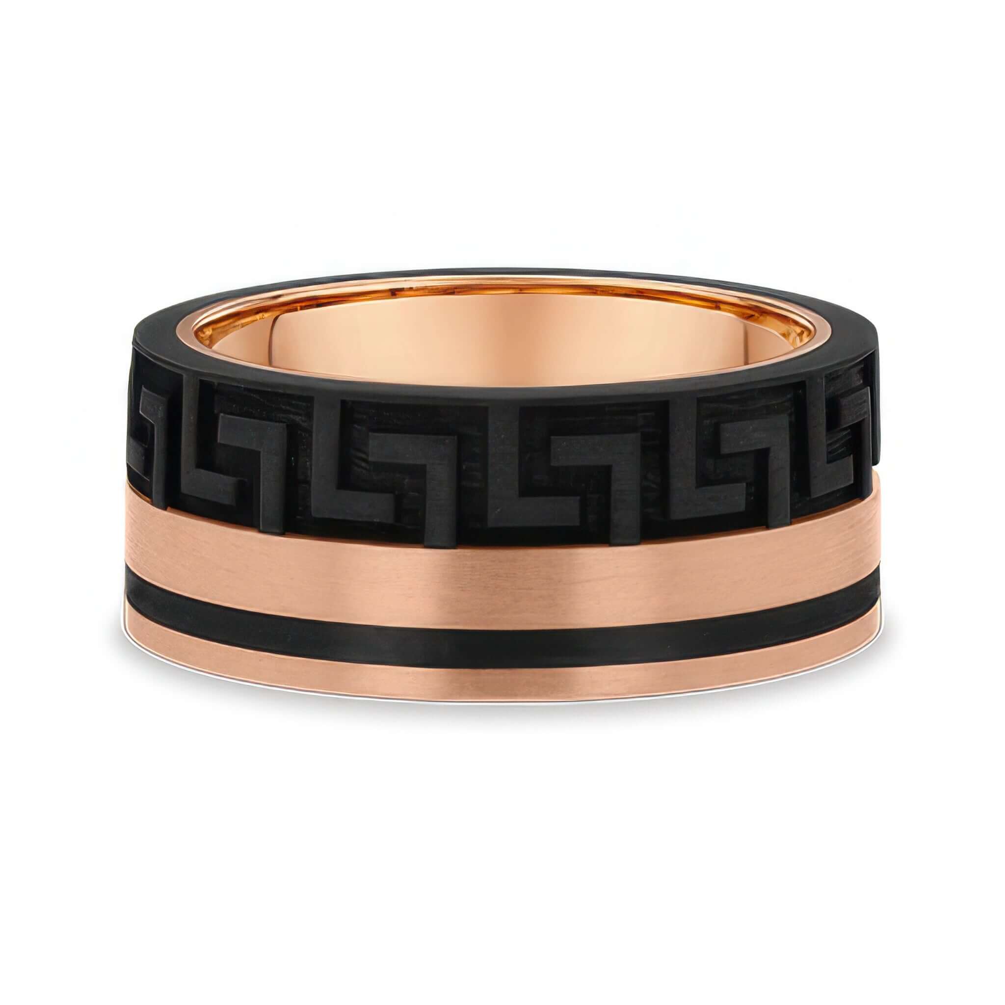 Rose Gold and Carbon Fiber Greek Key Men’s Wedding Band