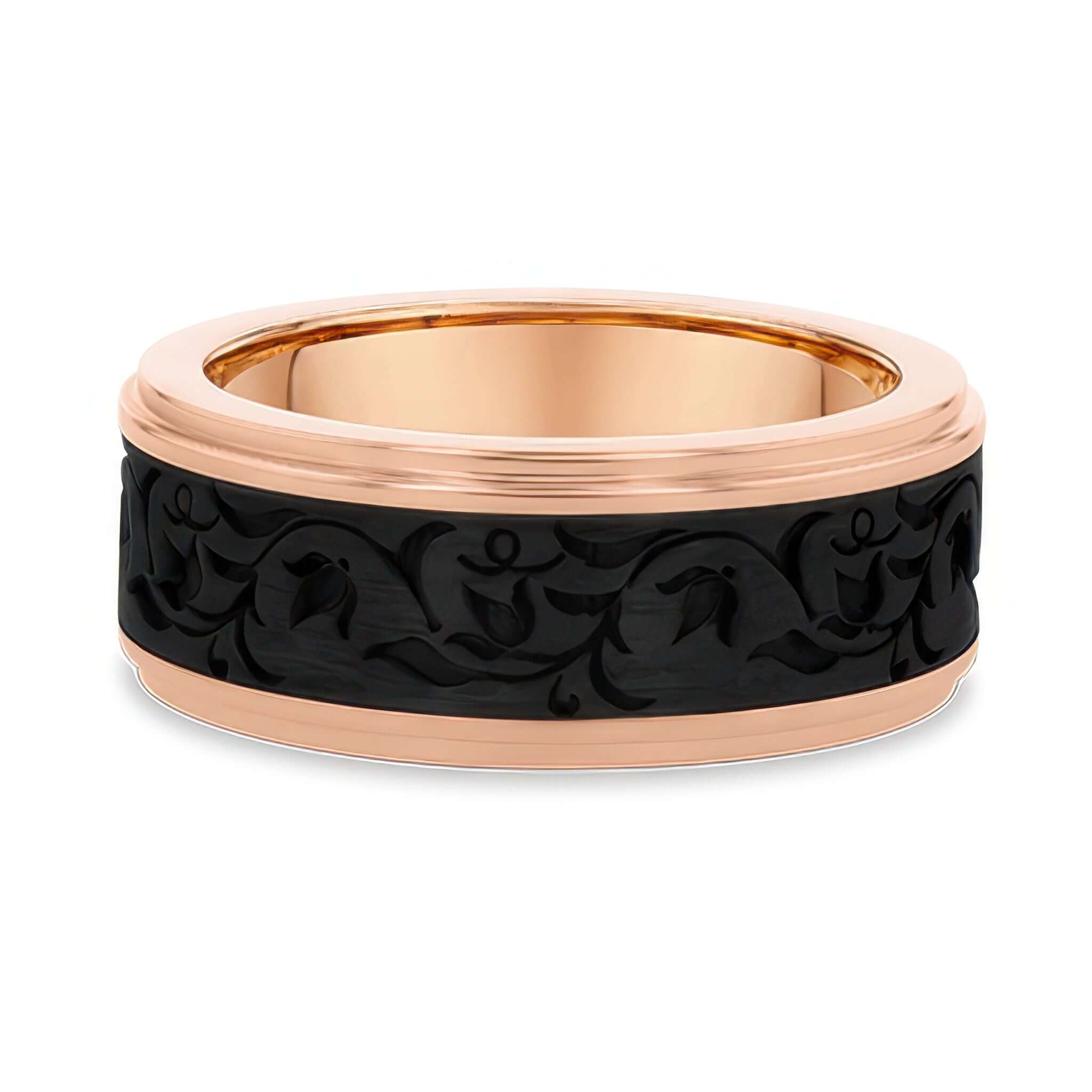 This 8mm rose gold and carbon fiber vine men’s wedding band combines sleek rose gold edges with a black carbon fiber center. The center is detailed with an engraved vine-like pattern that adds texture and artistry to its bold design. A polished rose gold interior gives it a refined finish, making this band both modern and timeless.