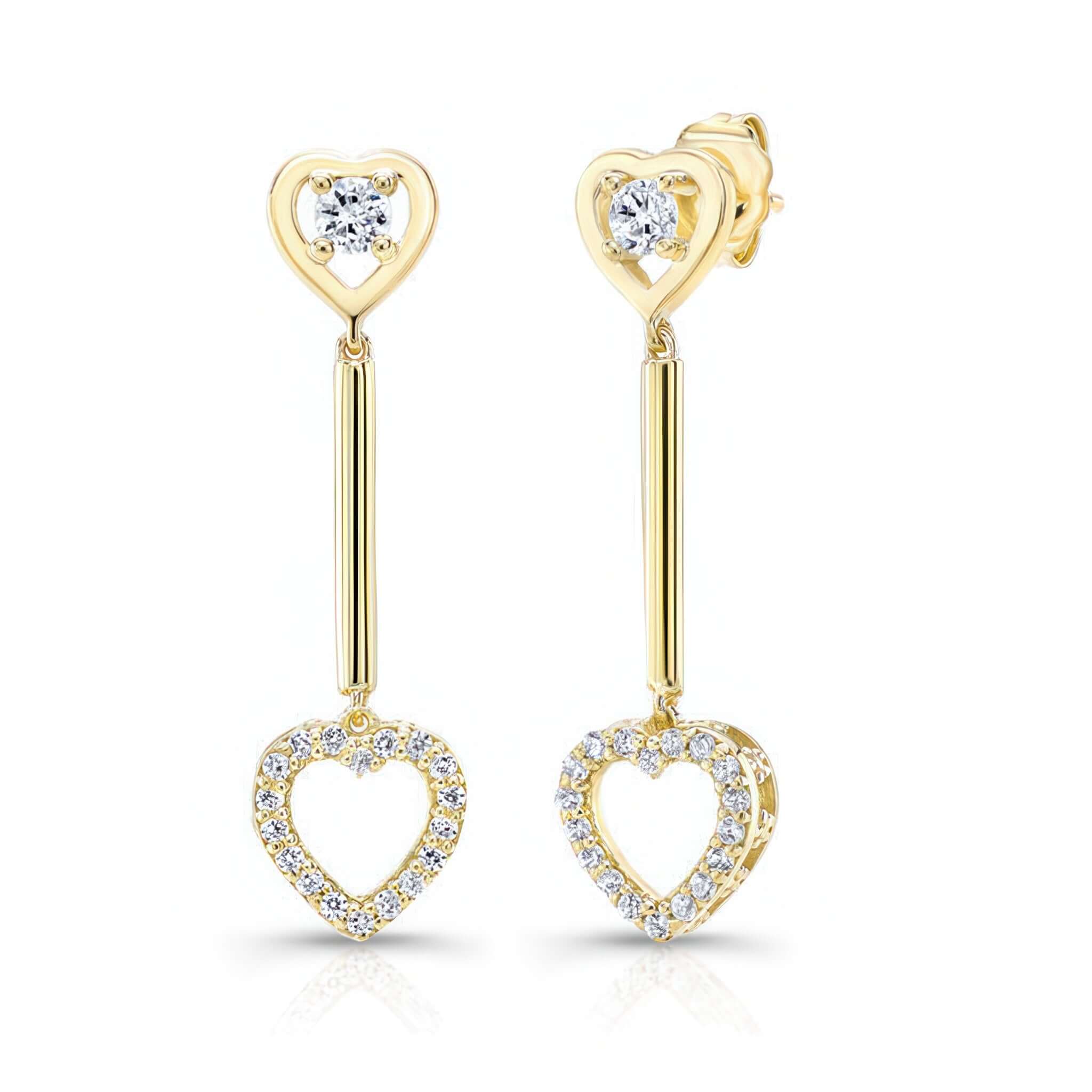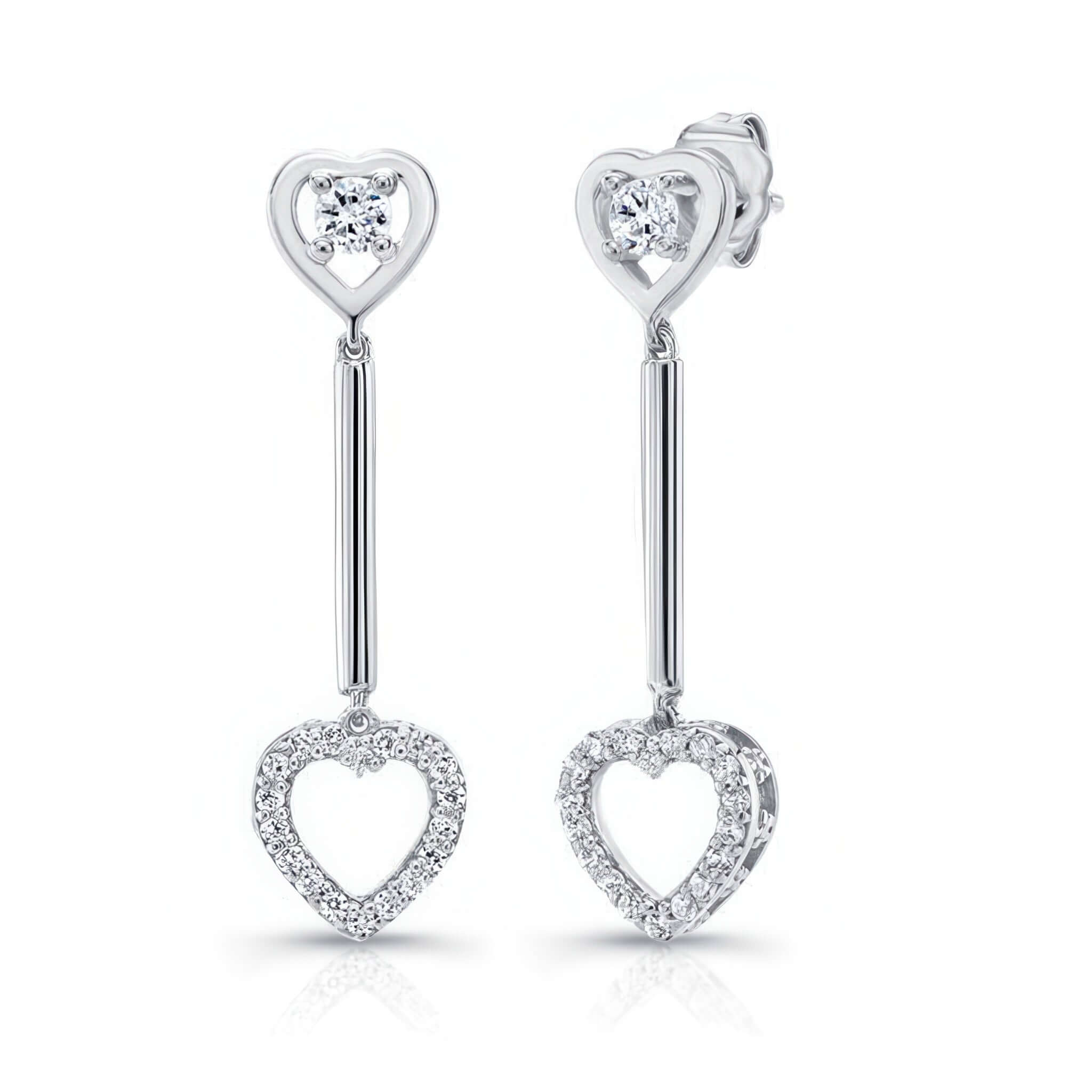 Brilliant heart dangle earrings featuring prong set diamonds in the middle of the upper heart shape and sparkling shared prong set diamonds on the lower heart. A perfect gift for that special one you adore!