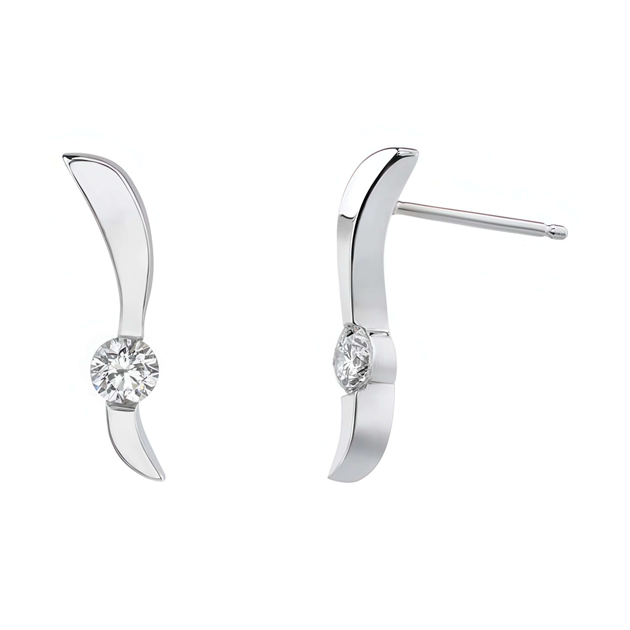These contemporary diamond drop earrings feature a channel set round diamond gracing the white gold curving ridge for a simply elegant statement.