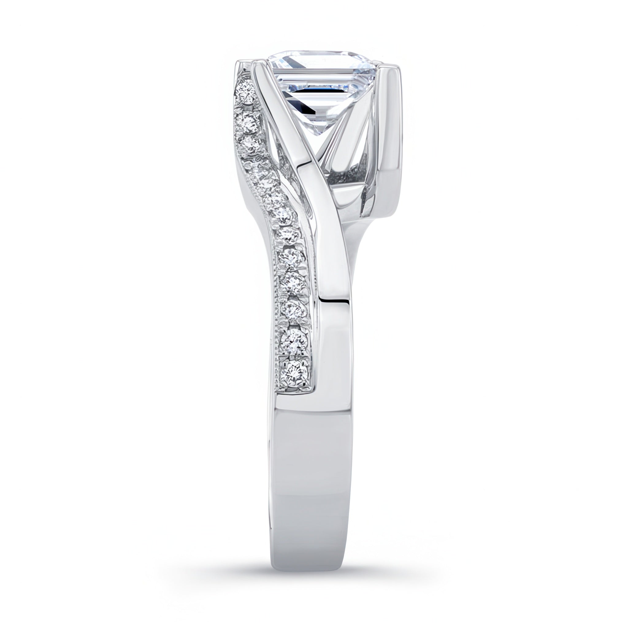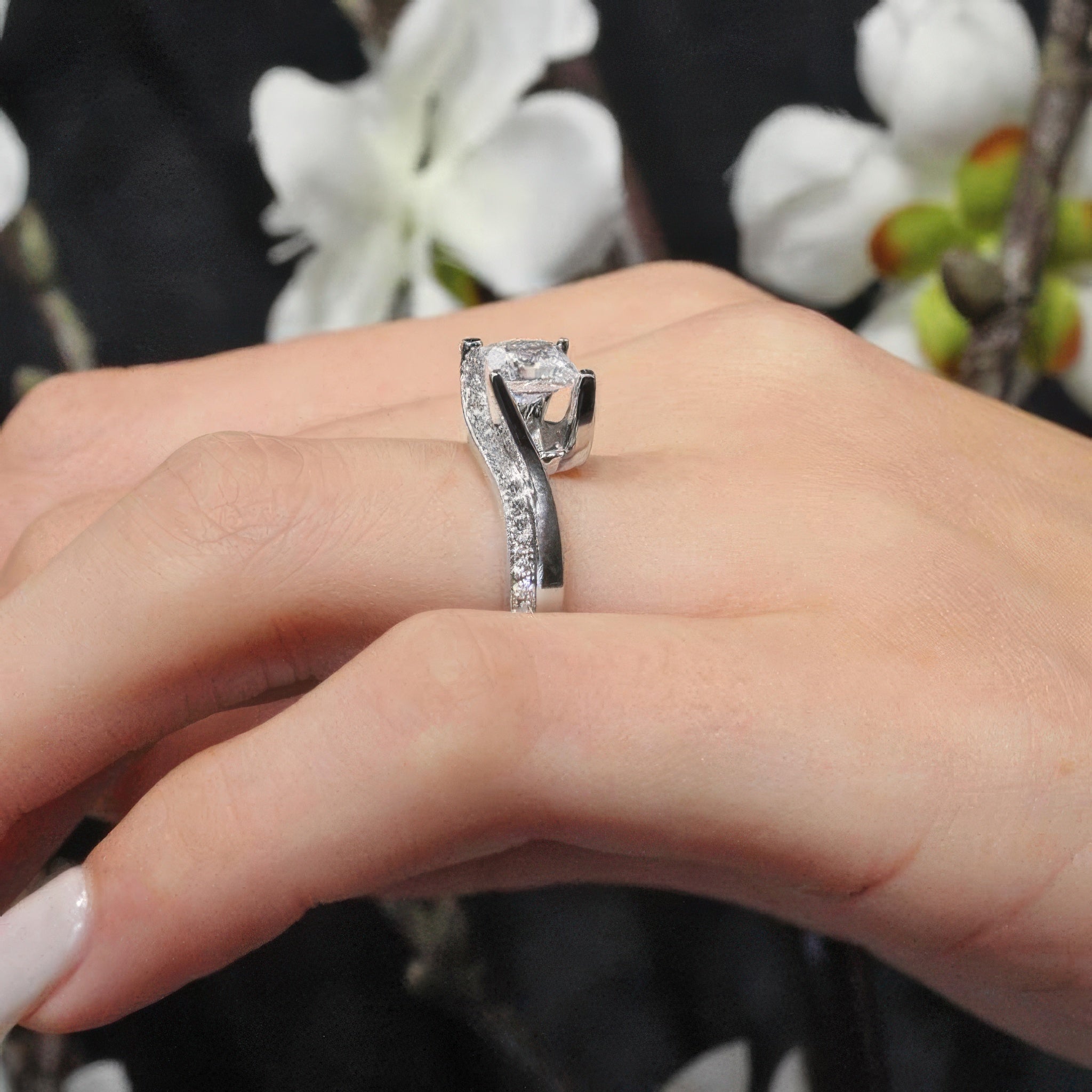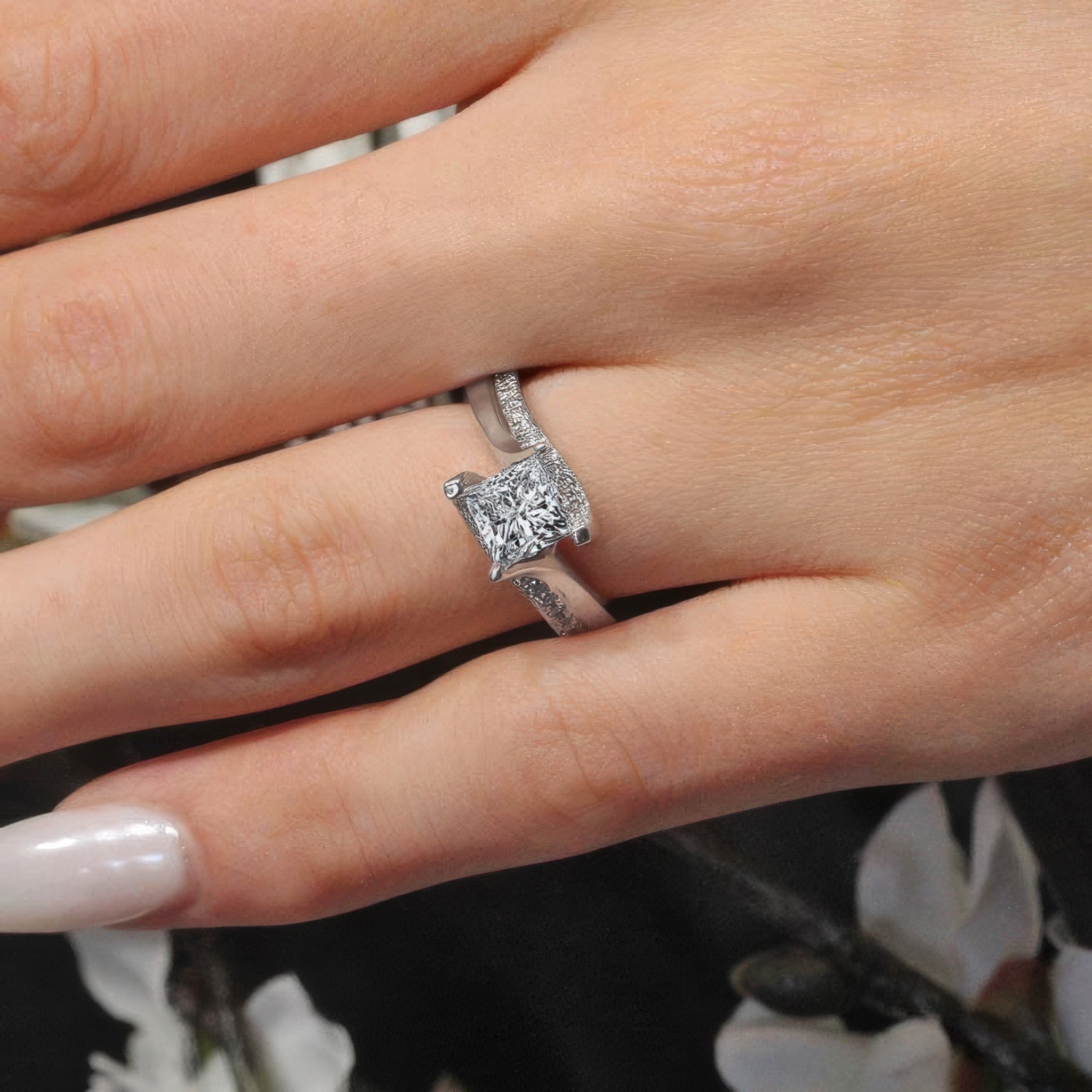 This 1.25 carat diamond ring features a princess cut center with two opposing shoulders pave set with diamonds and a bright luster finish adding a touch of sophistication.