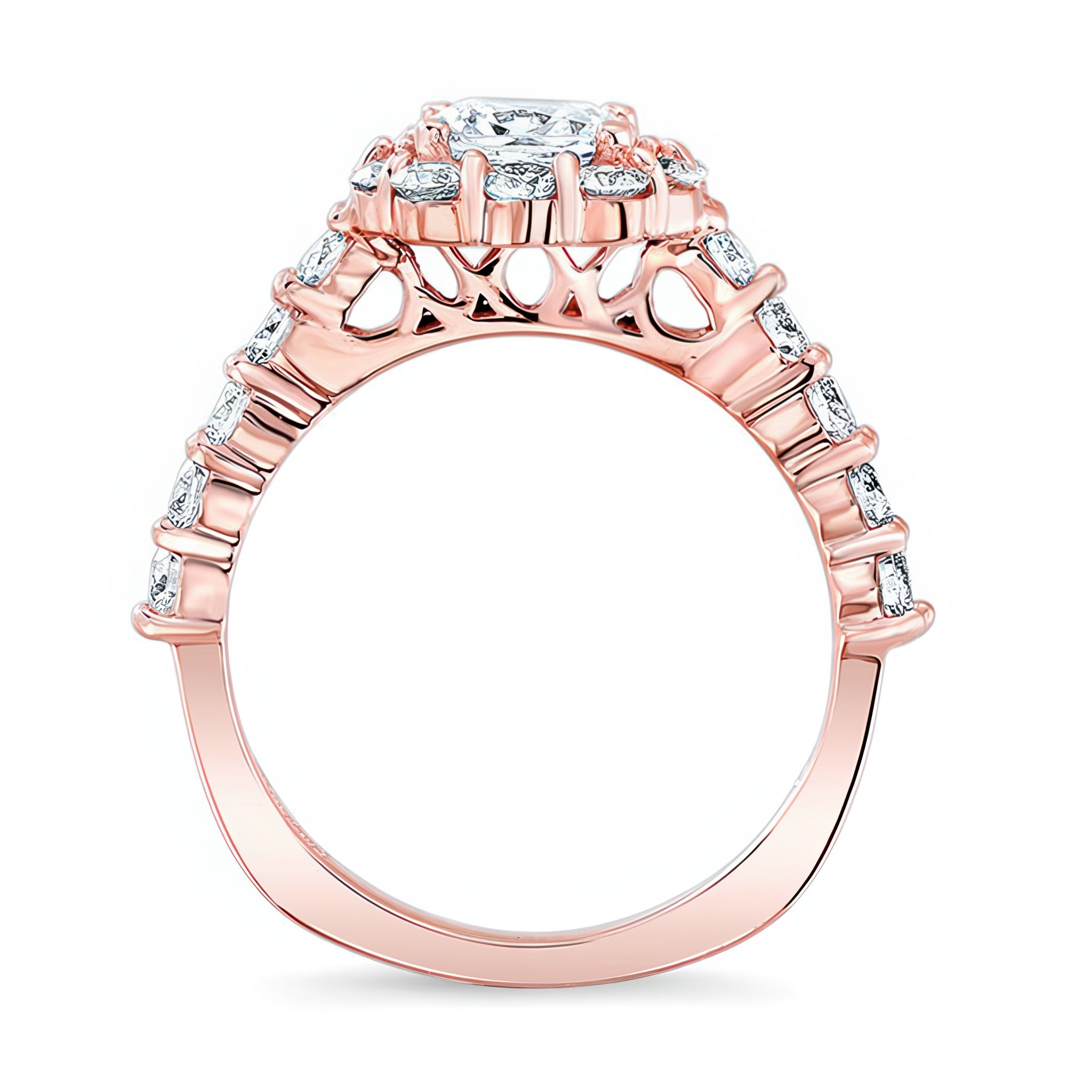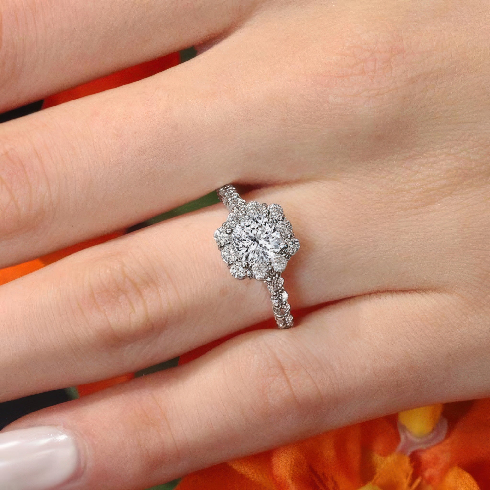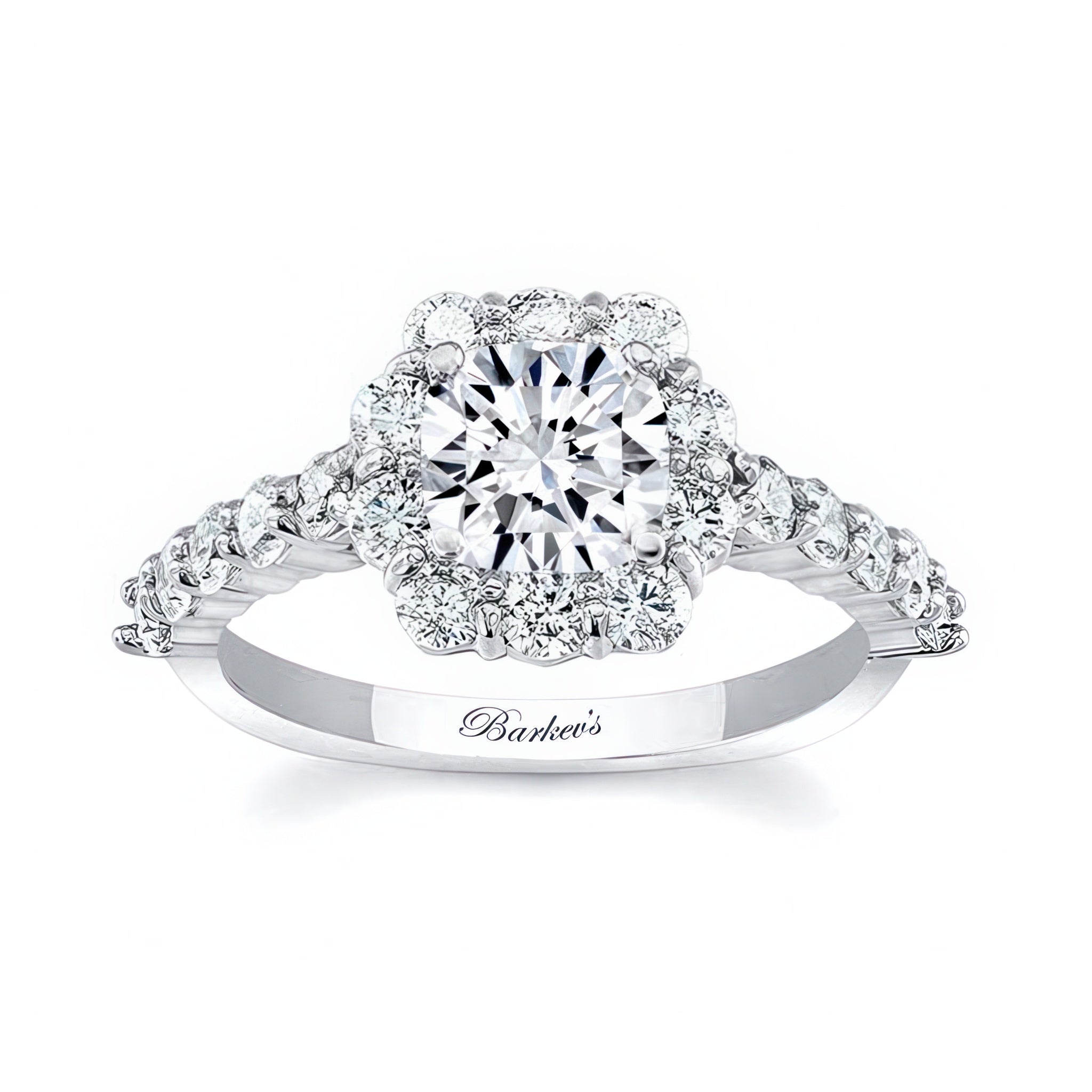 This 1 carat diamond halo ring features shared prong set diamonds encircling the low profile cushion cut center with more cascading down the dainty shank for a look of pure sophistication.