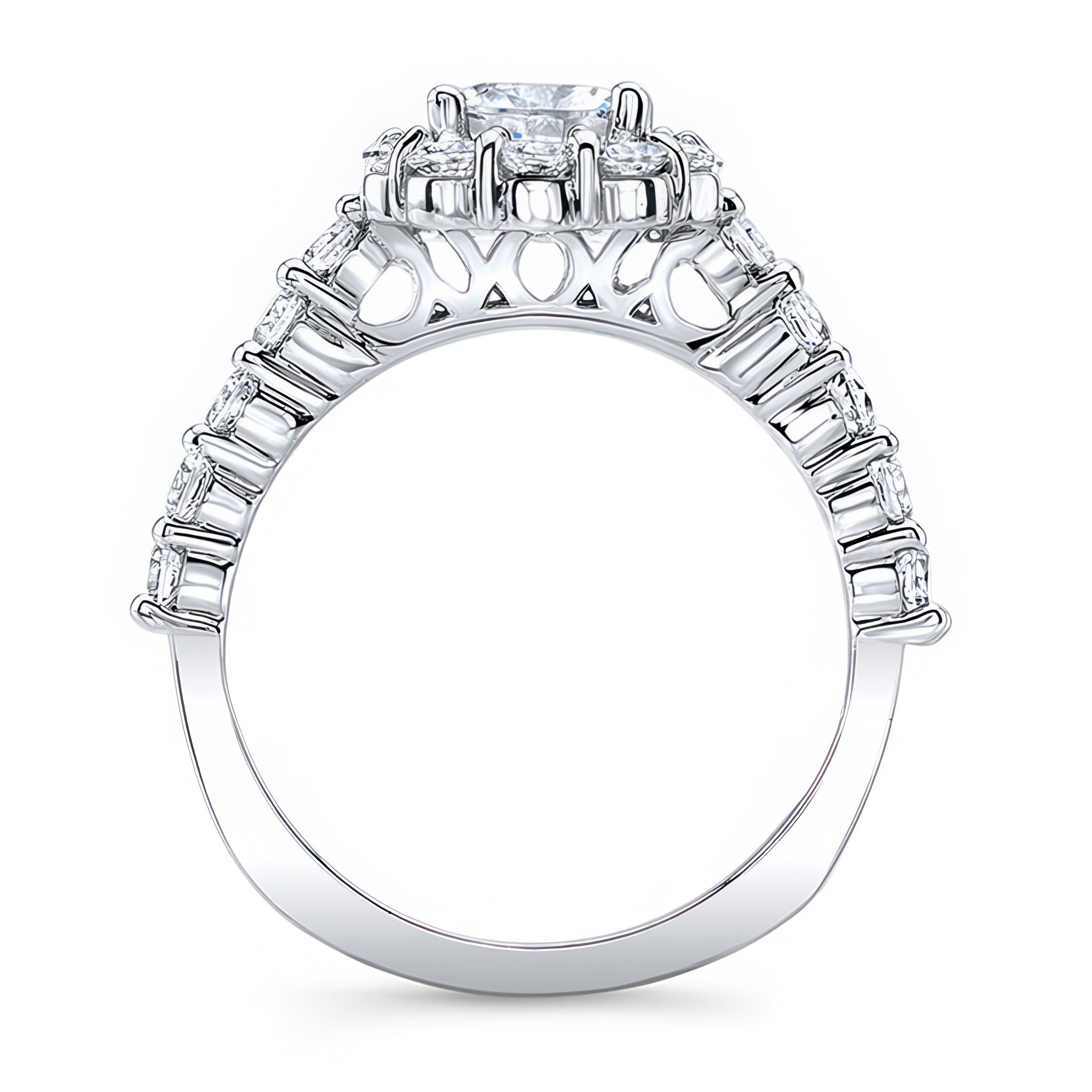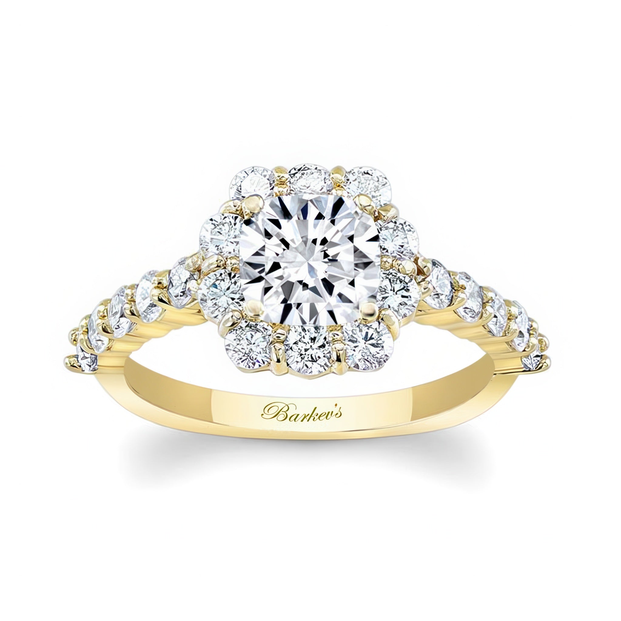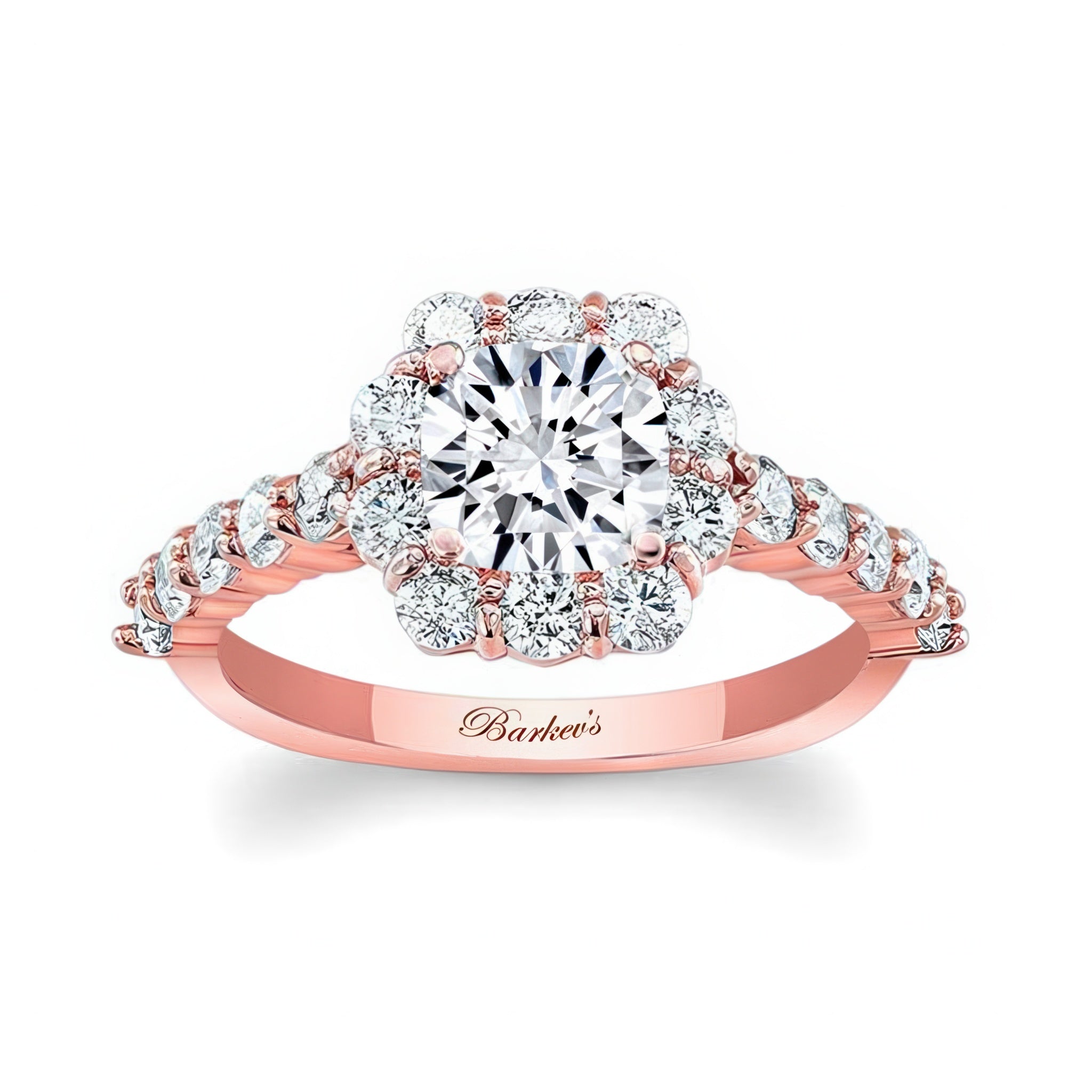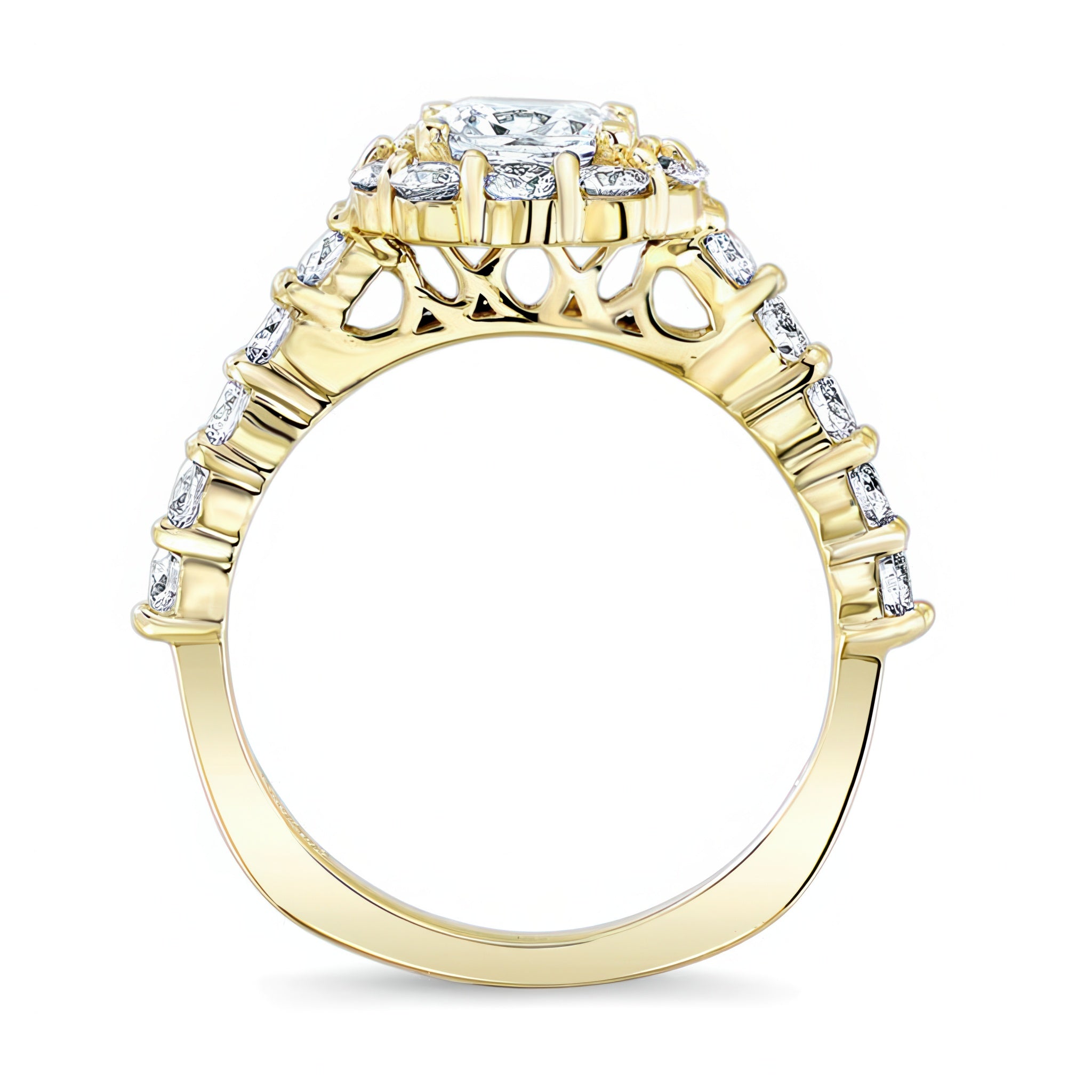 This 1 carat diamond halo ring features shared prong set diamonds encircling the low profile cushion cut center with more cascading down the dainty shank for a look of pure sophistication.